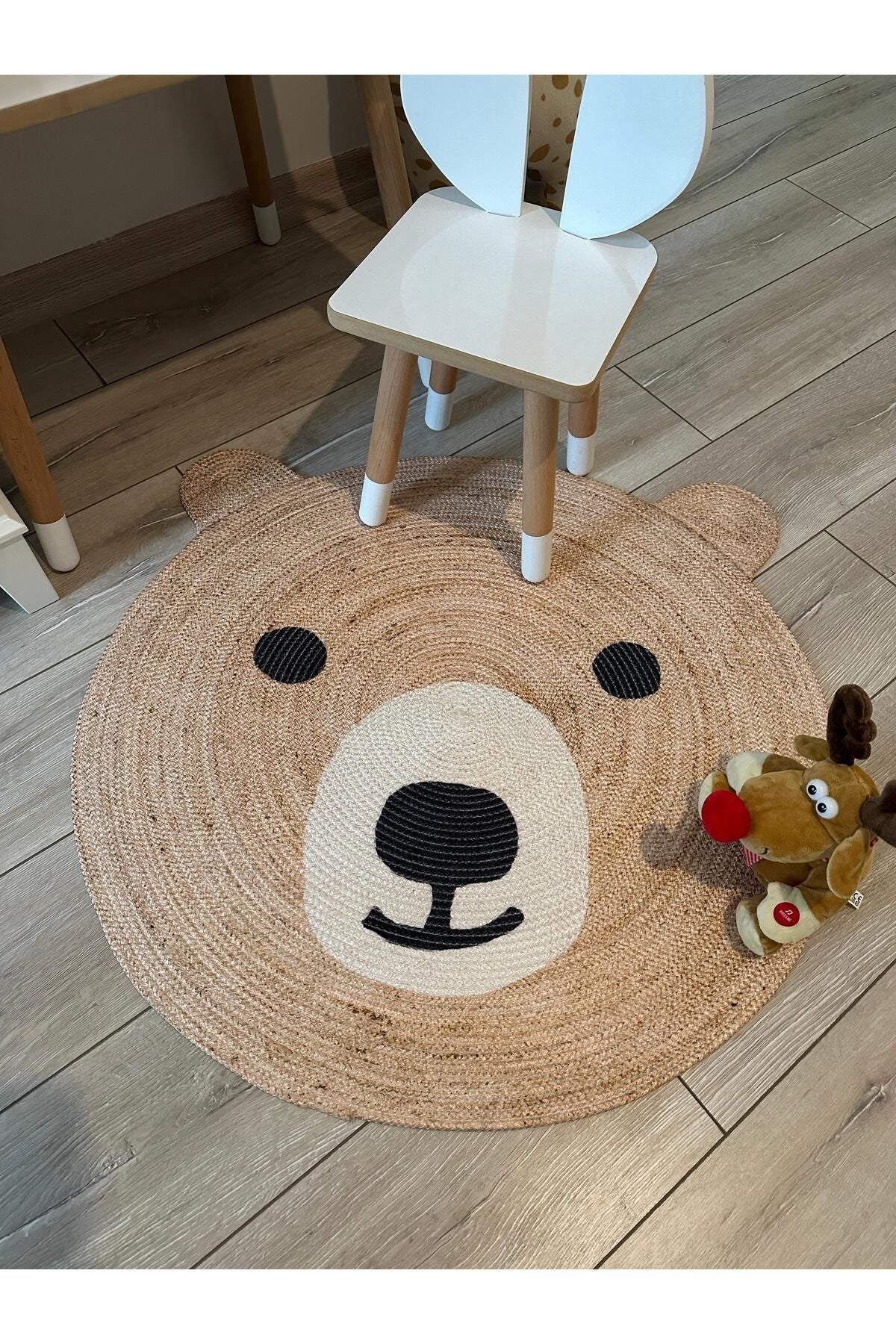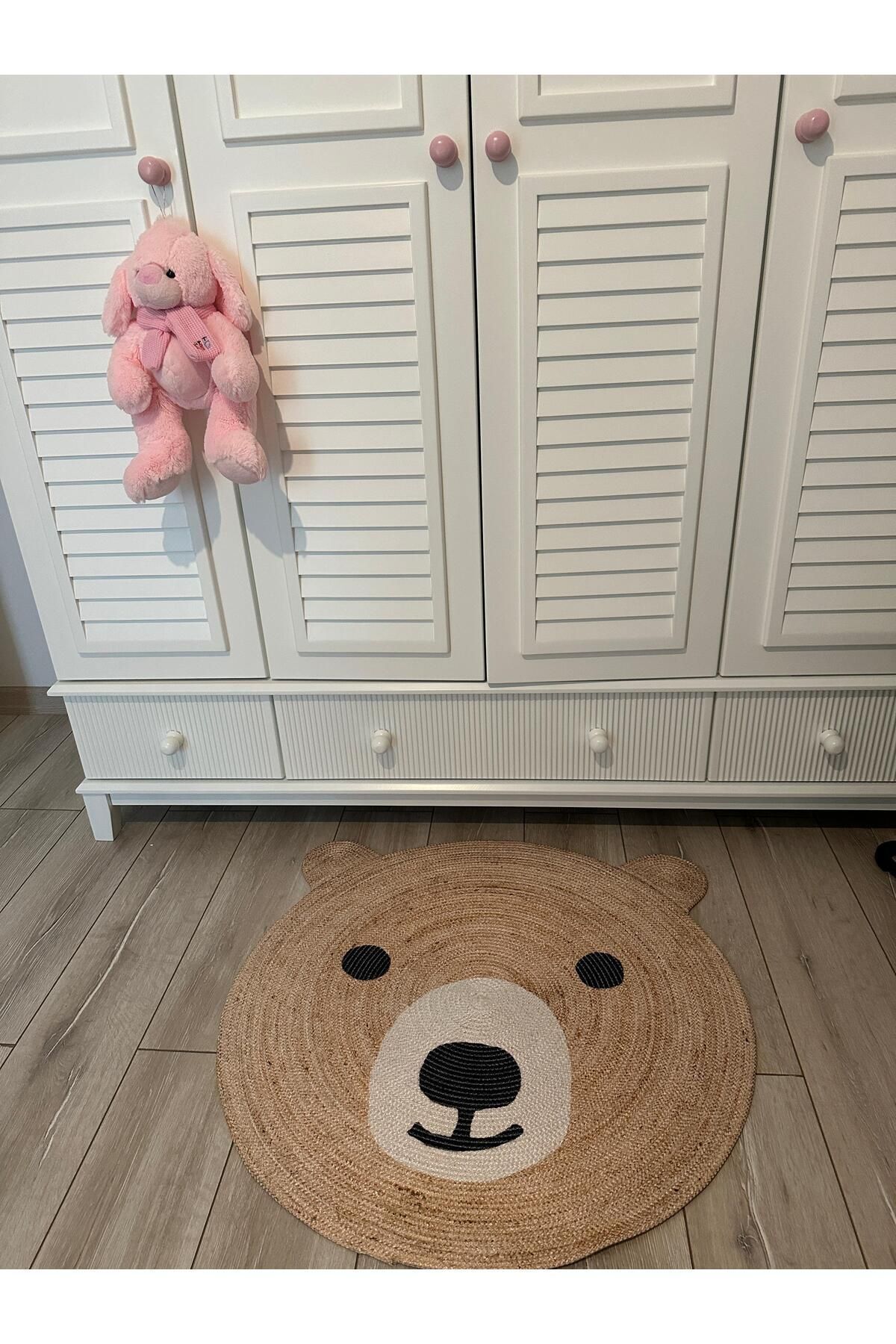 Boho 958 Sevimli Ayıcık Örgü Taban Yuvarlak Natural Çift Taraflı Çocuk ve Bebek Odası Halı