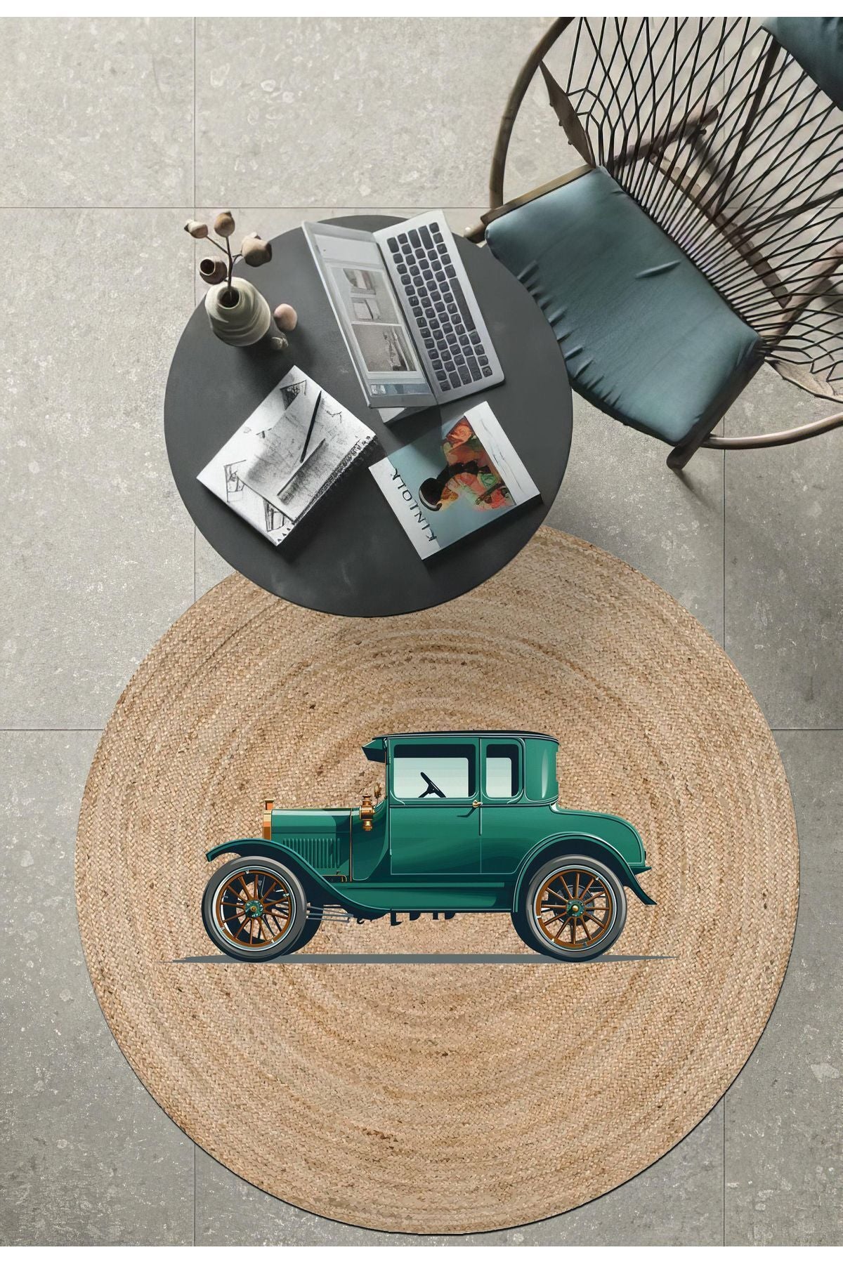 Boho 961 Eski Vintage Araba Figürlü Örgü Yuvarlak Natural Çift Taraflı Halı