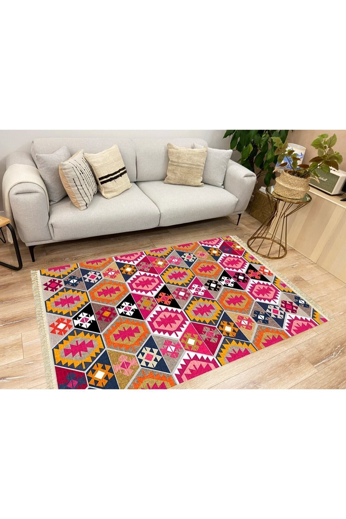 Cotton Serisi Pembe Ve Kahverengi Tonlarında Geometrik Desen Dekoratif Dokuma Taban Kilim