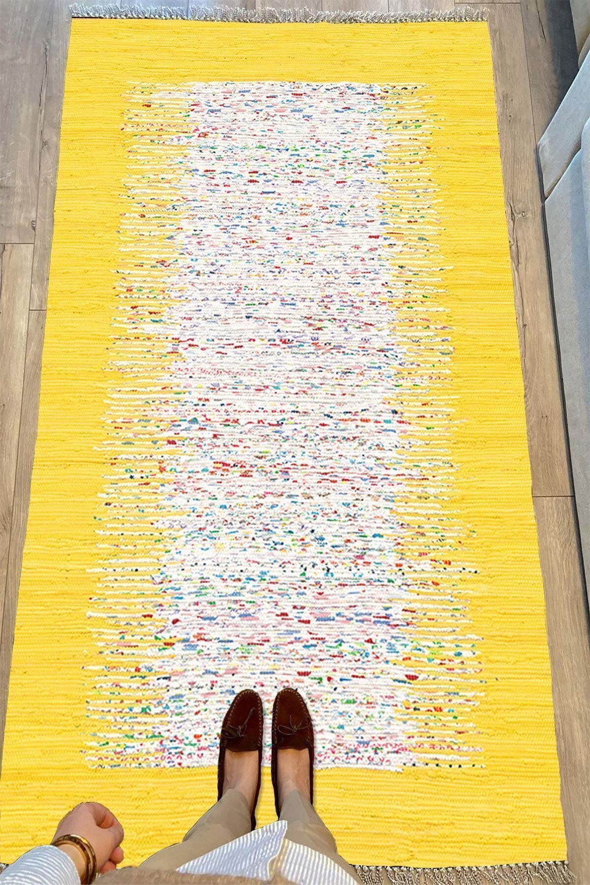 Cotton Serisi Sarı Rengi Ortası Su Yolu Eskitme Modern Desen Dekoratif Dokuma Taban Kilim