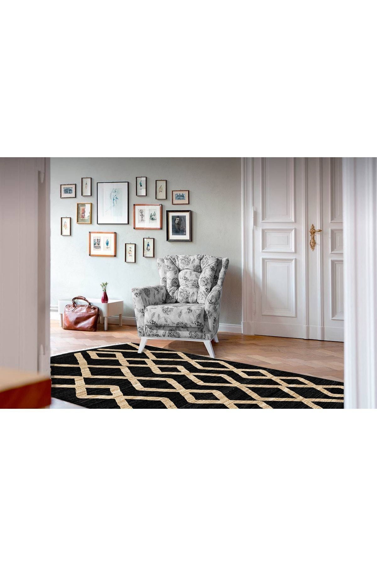 Cotton Serisi Siyah Ve Hasır Görünümlü Otantik Etnik Desenli Dekoratif Dokuma Taban Kilim