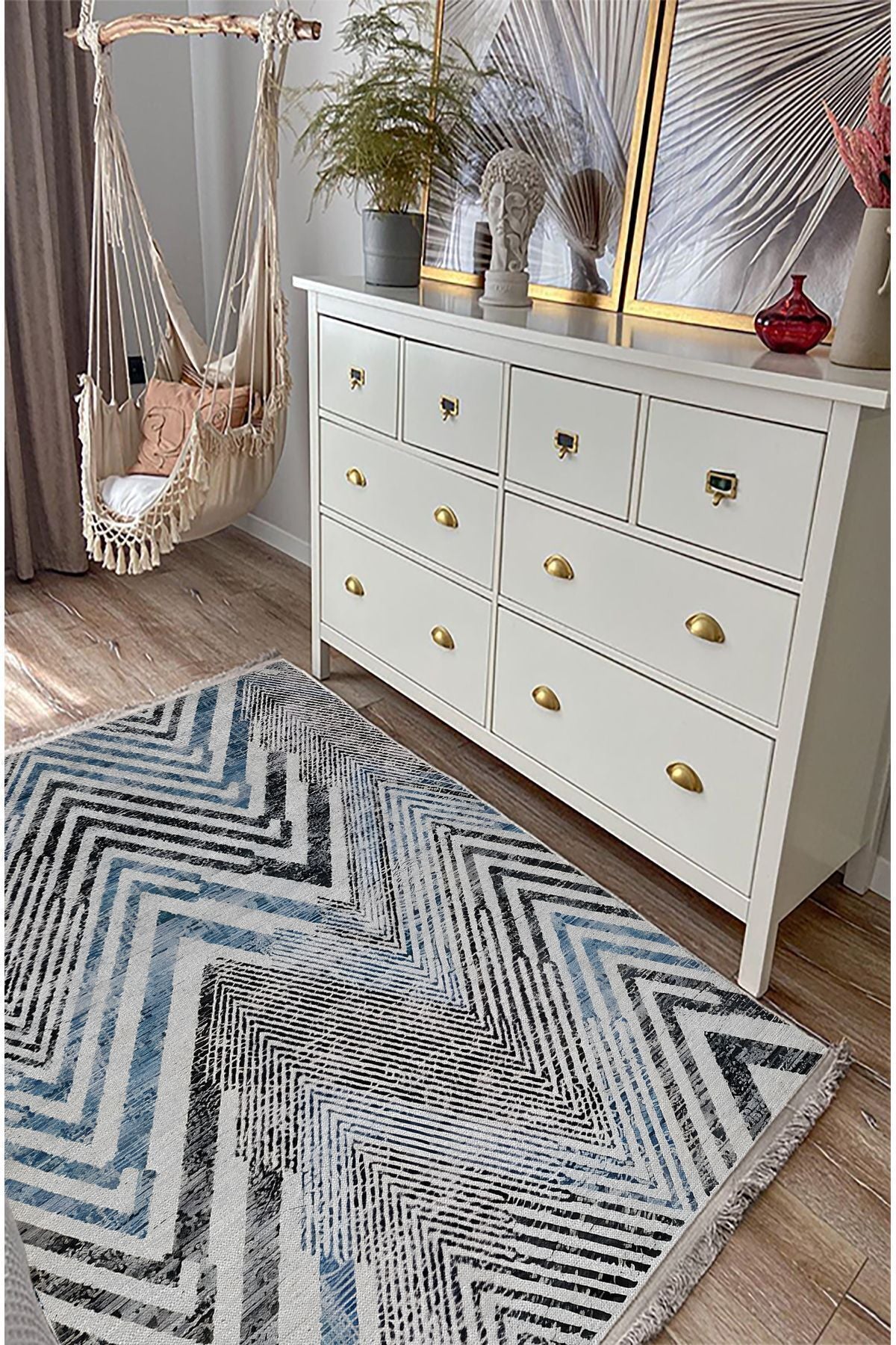 Halı Vagonu 101 Mavi Zigzag Çizgili Dekoratif Halı Saçaklı Halı
