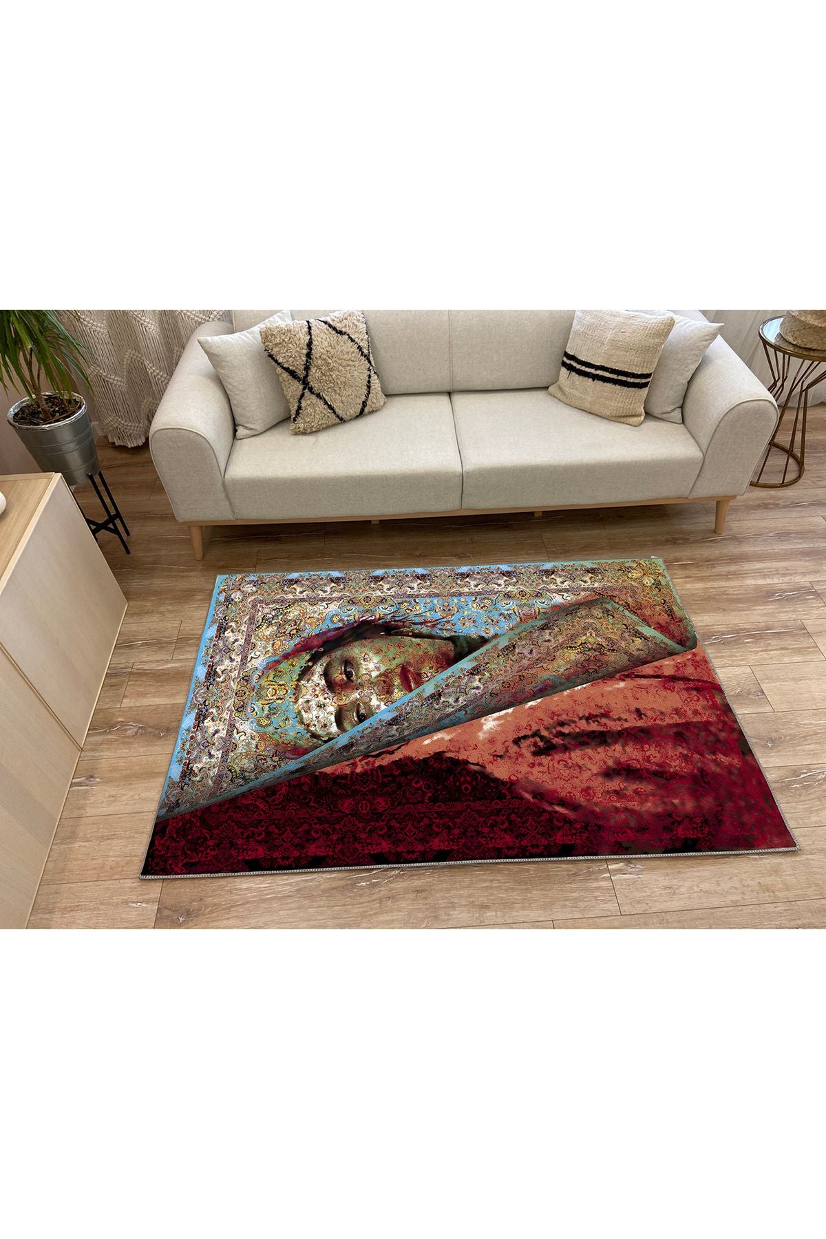 Halı Vagonu 150 Mavi Ve Bordo Tonlarda Kadın Silüeti Etnik Desenli Vintage Dokuma Taban Halı