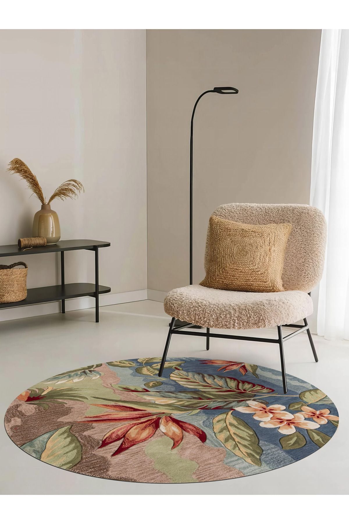 Halı Vagonu 153 Pastel Tonlar Çiçekli Floral Çok Renkli Dokuma Taban Yuvarlak Halı