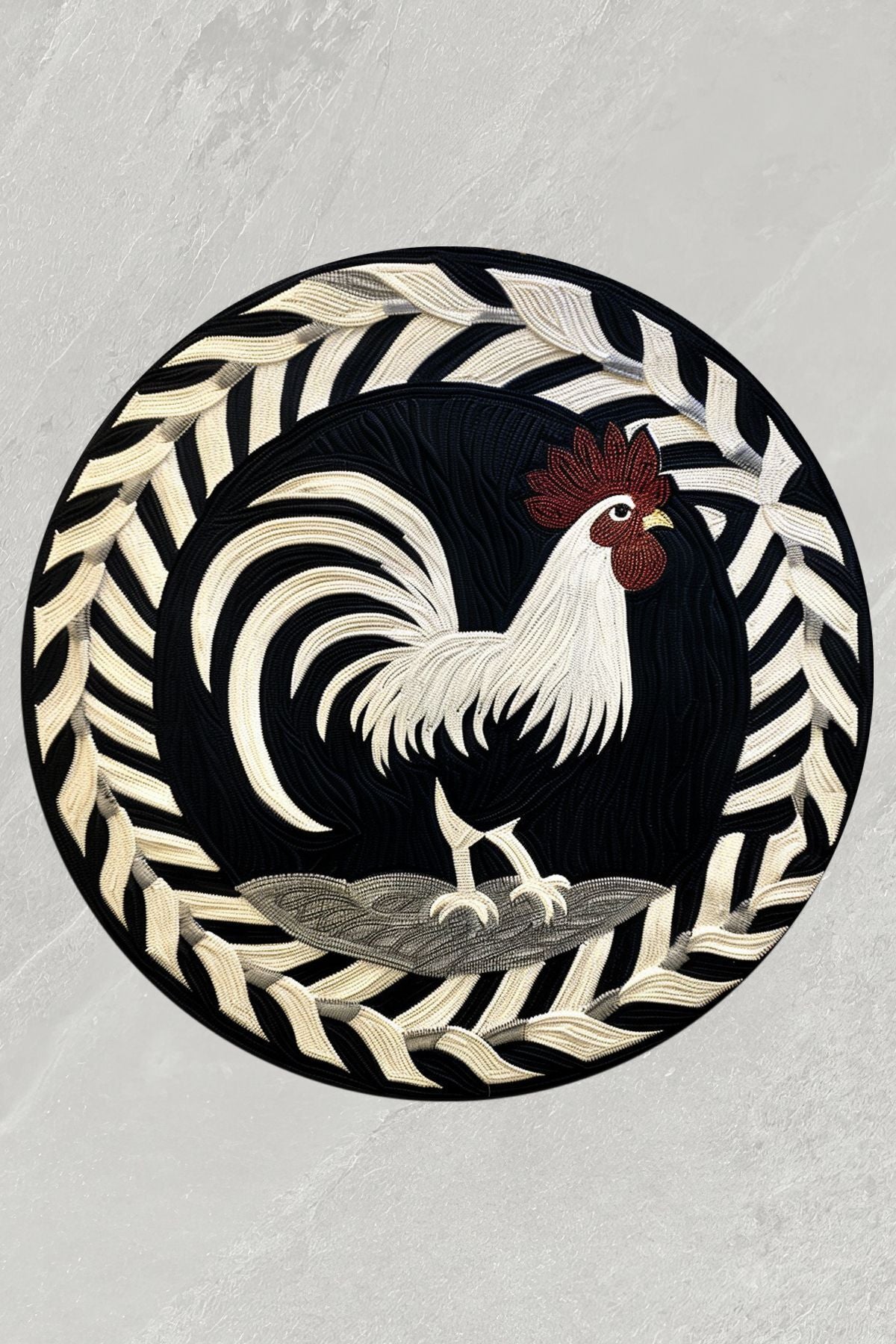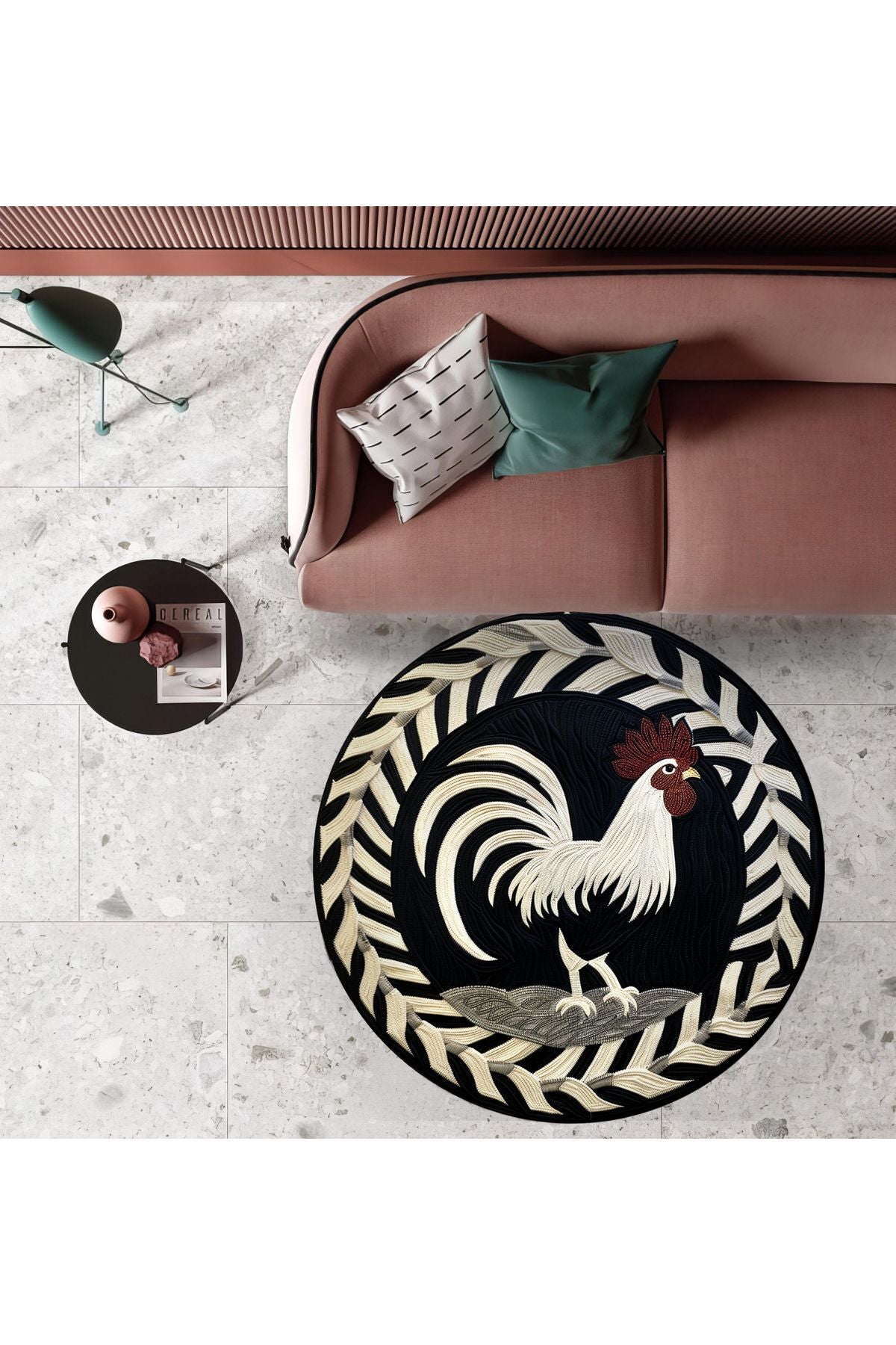 Halı Vagonu 167 Horoz Figürlü Siyah Dama Desenli Dokuma Taban Yuvarlak Halı
