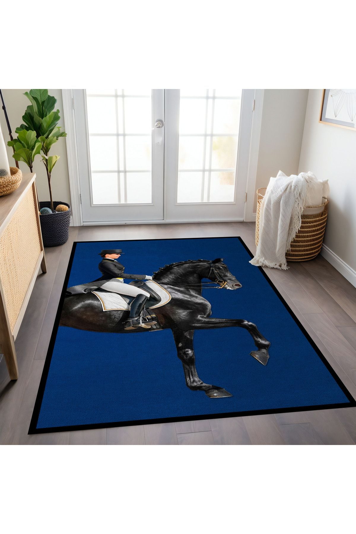 Halı Vagonu 186 Binicilik ve At Figürlü Lacivert Modern Dokuma Taban Halı