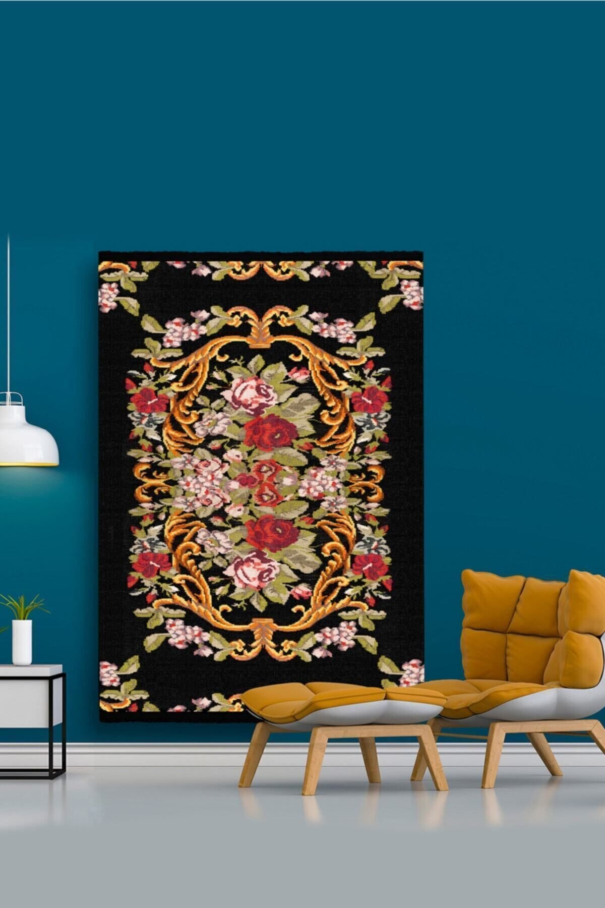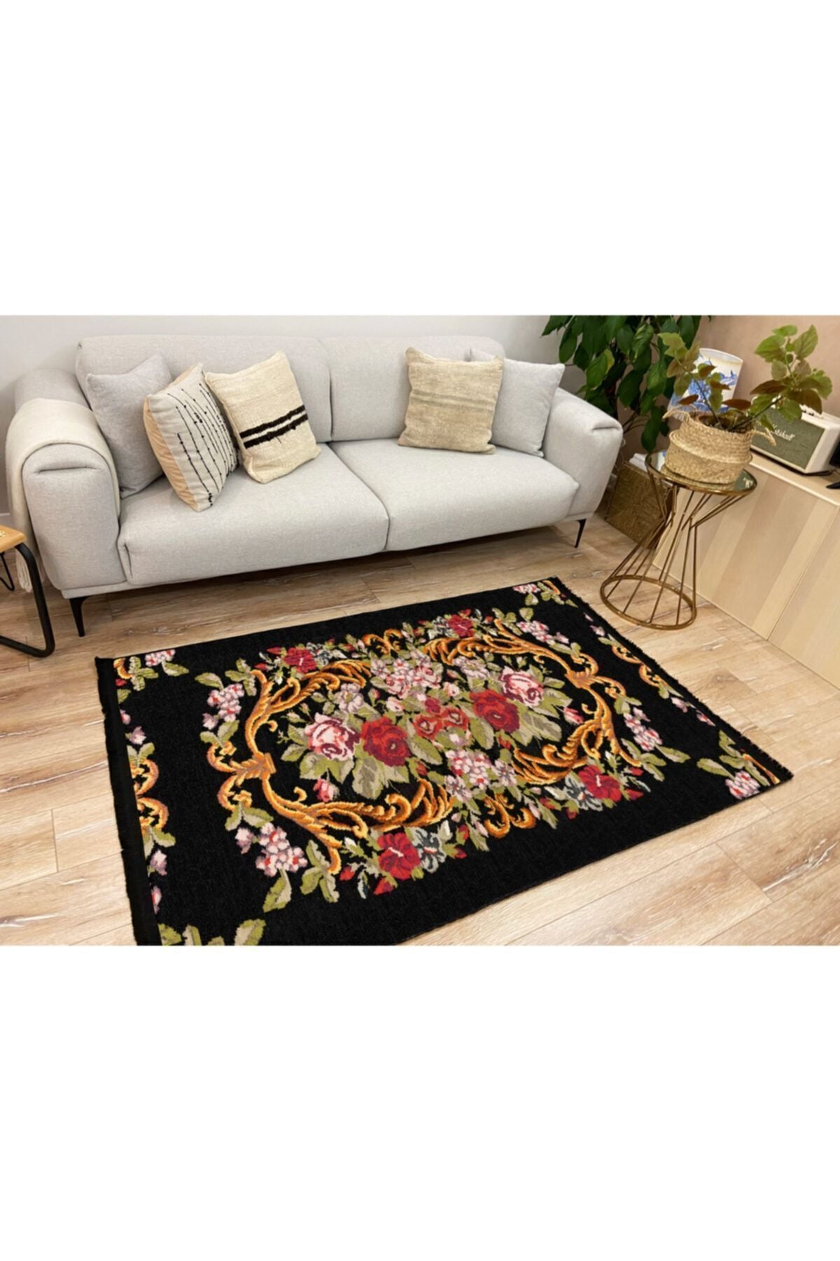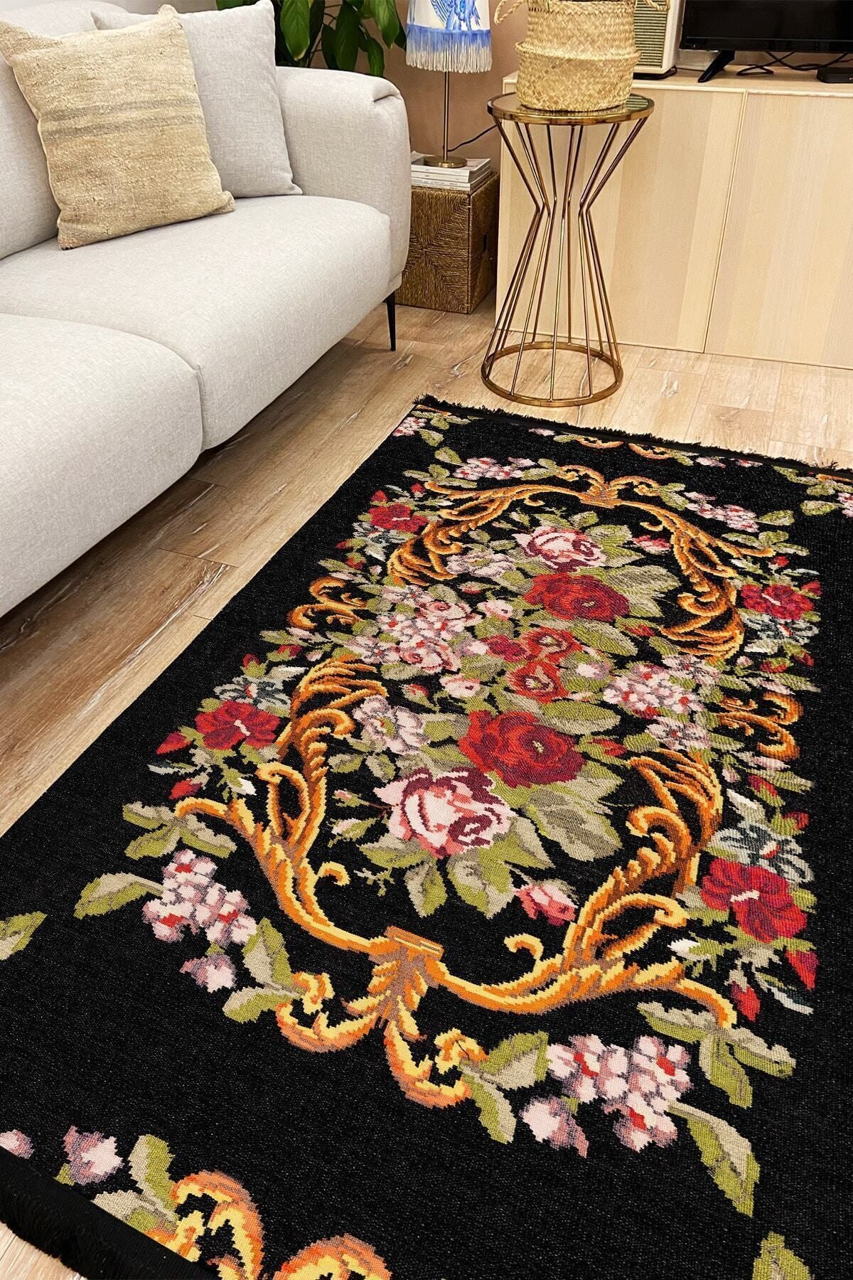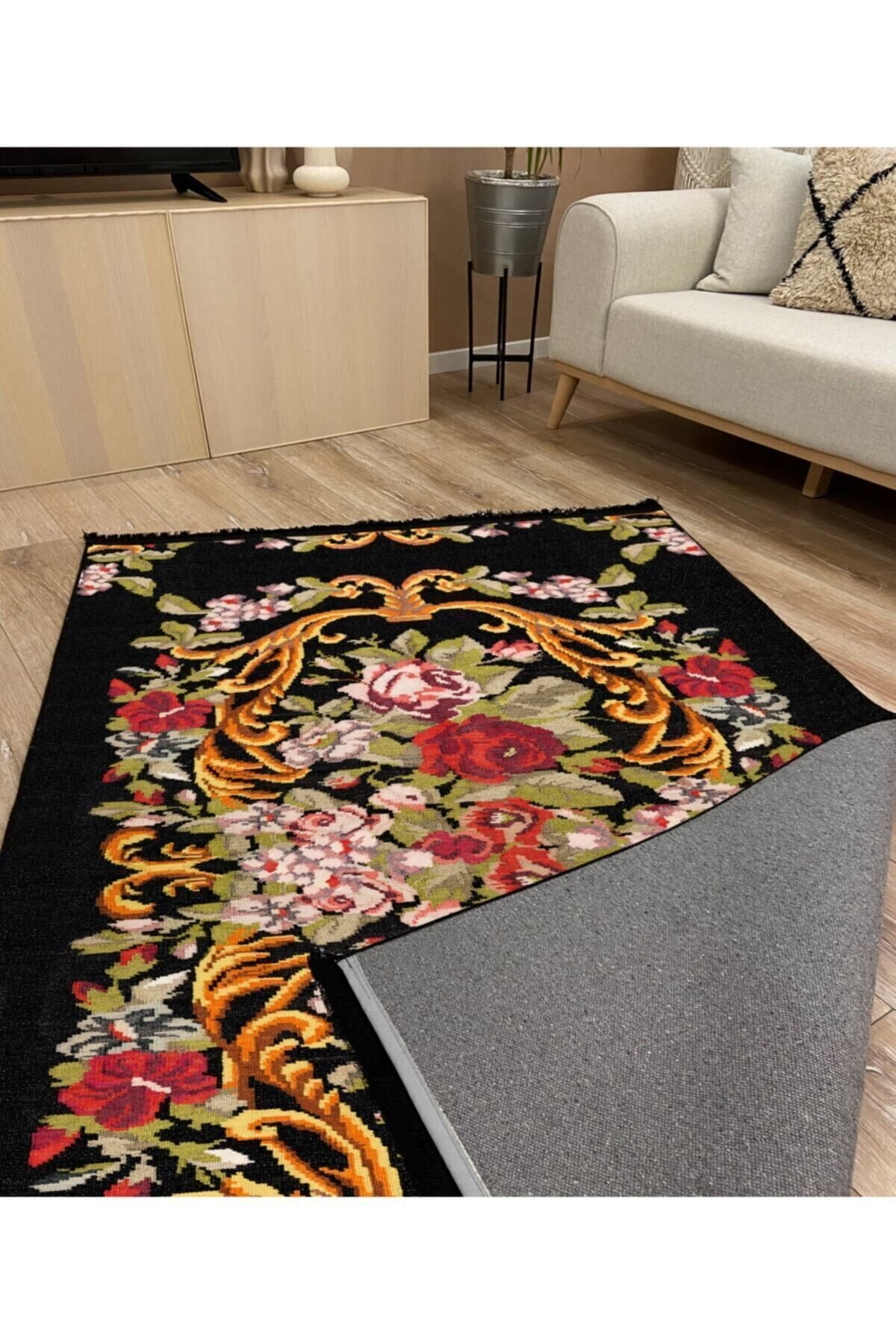Halı Vagonu 2005 Siyah Tonunda Çiçekli Desen Kaymaz Taban Dekoratif Halı