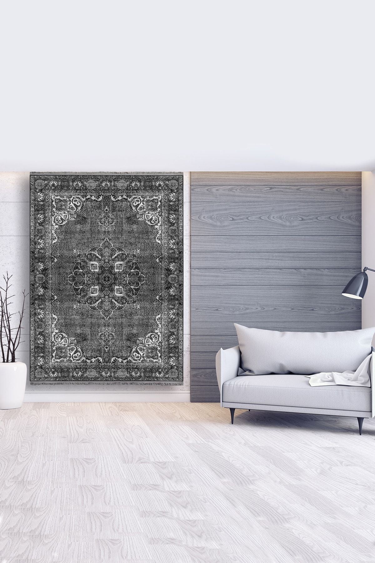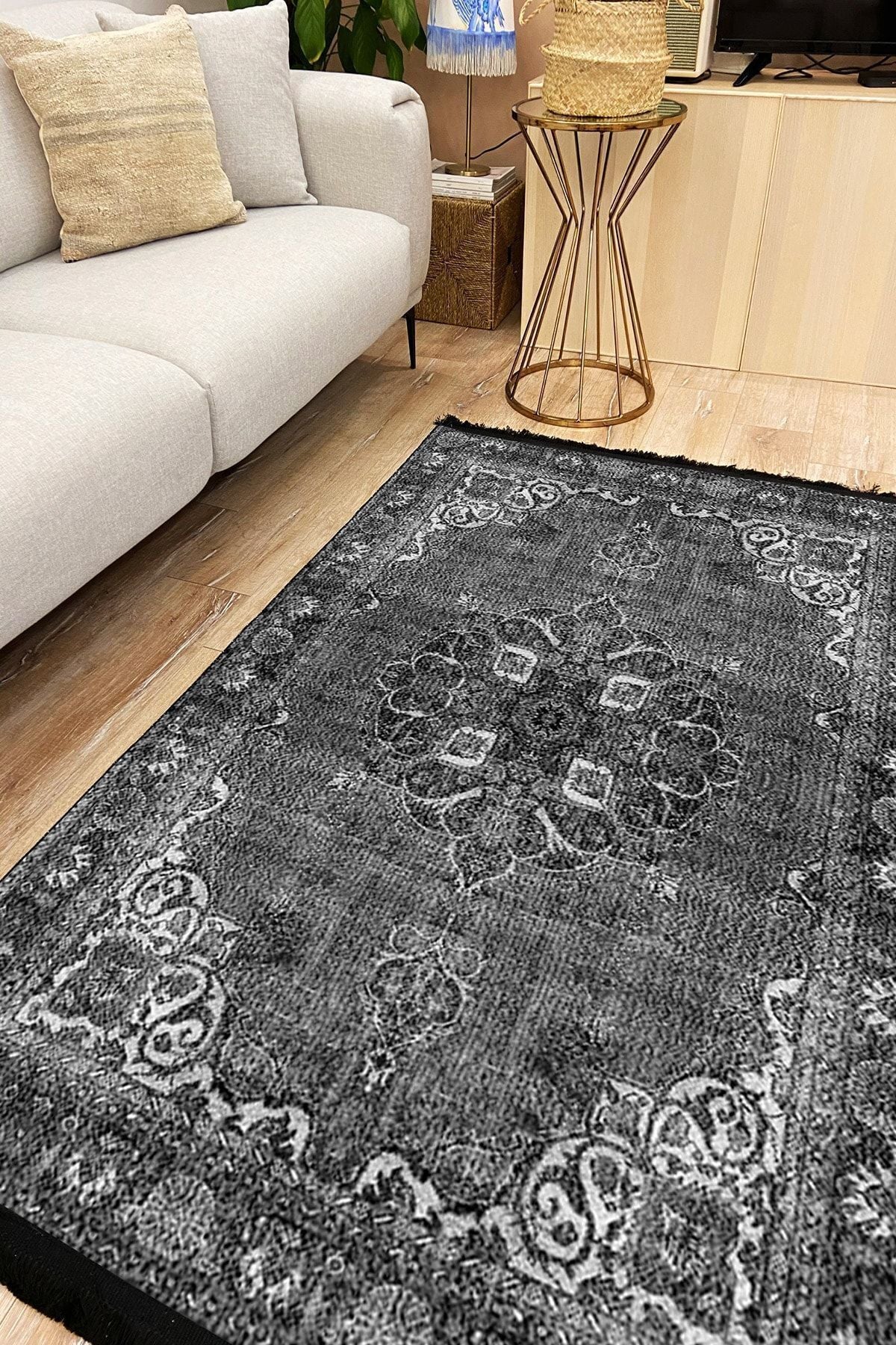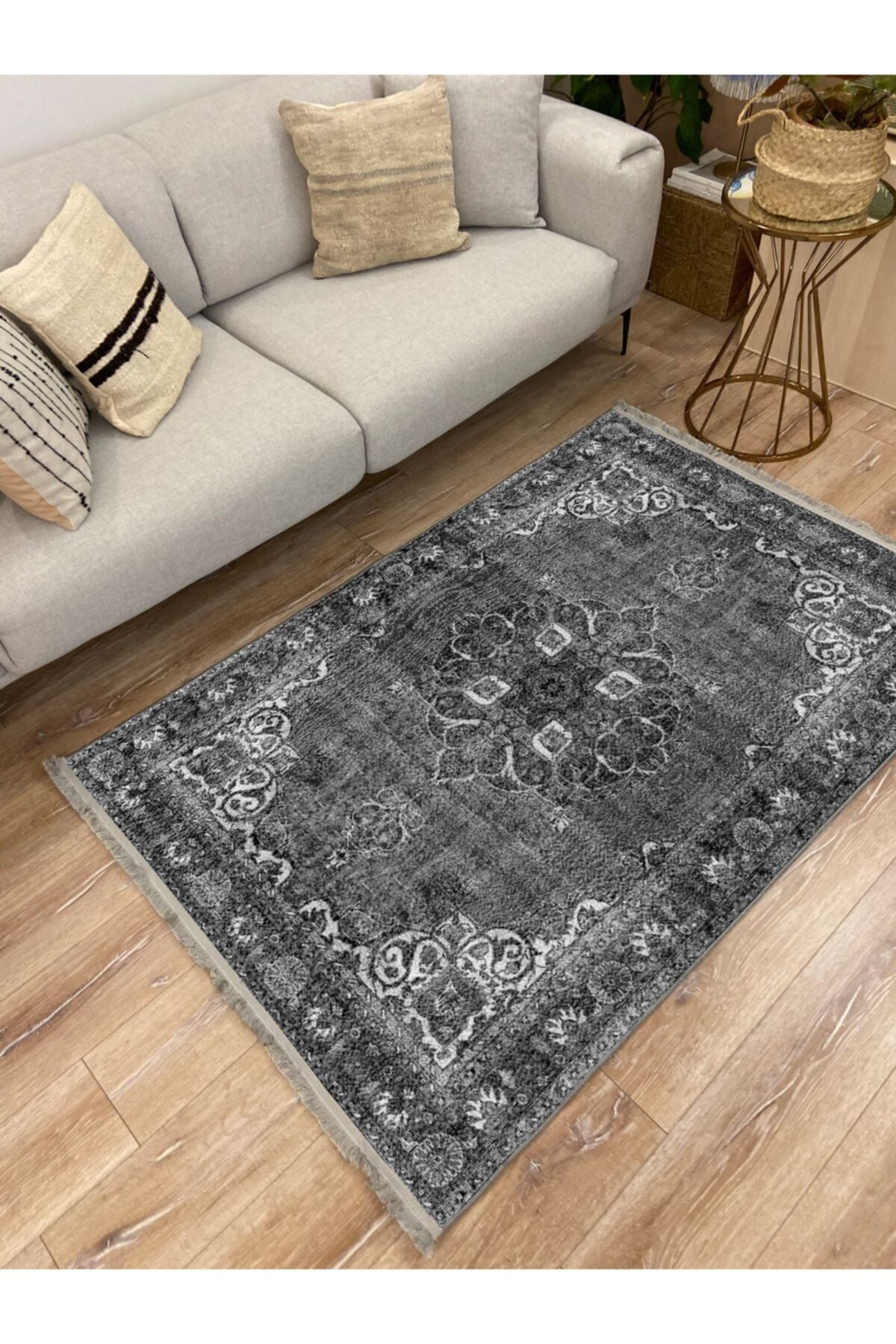 Halı Vagonu 2006 Gri Tonlarında Etnik Desen Kaymaz Taban Dekoratif Halı