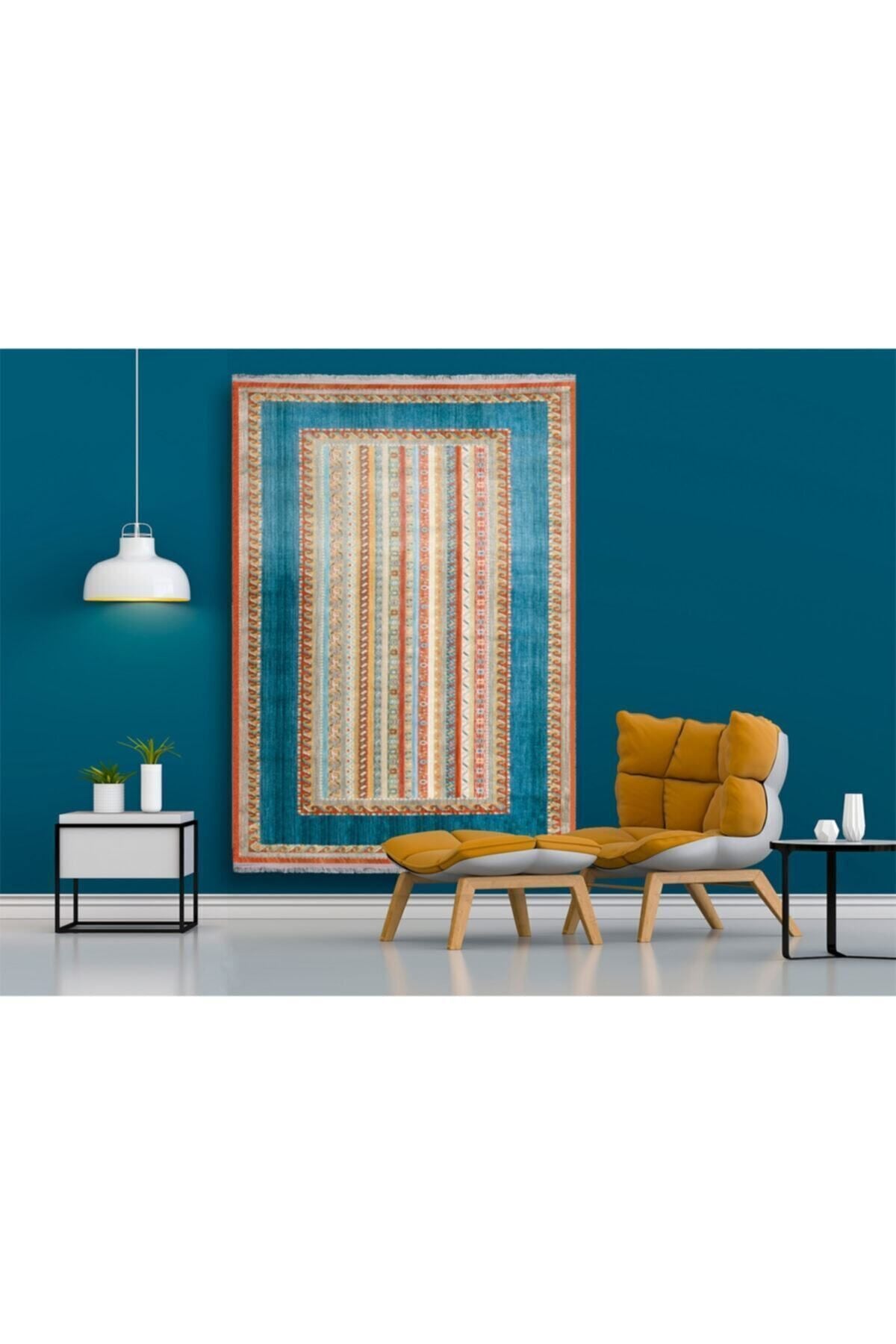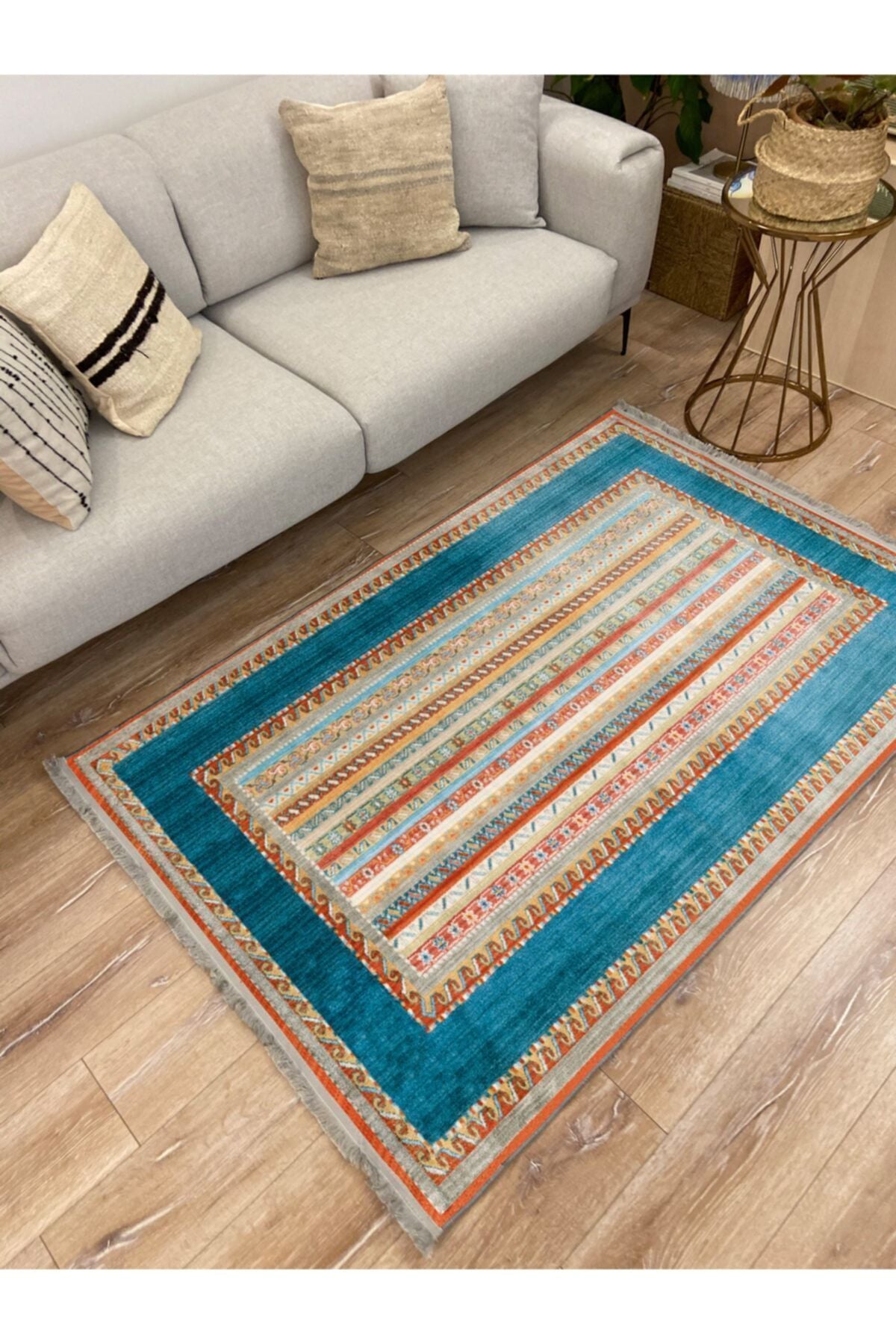 Halı Vagonu 2017 Mavi Tonunda Geometrik Desen Kaymaz Taban Dekoratif Halı