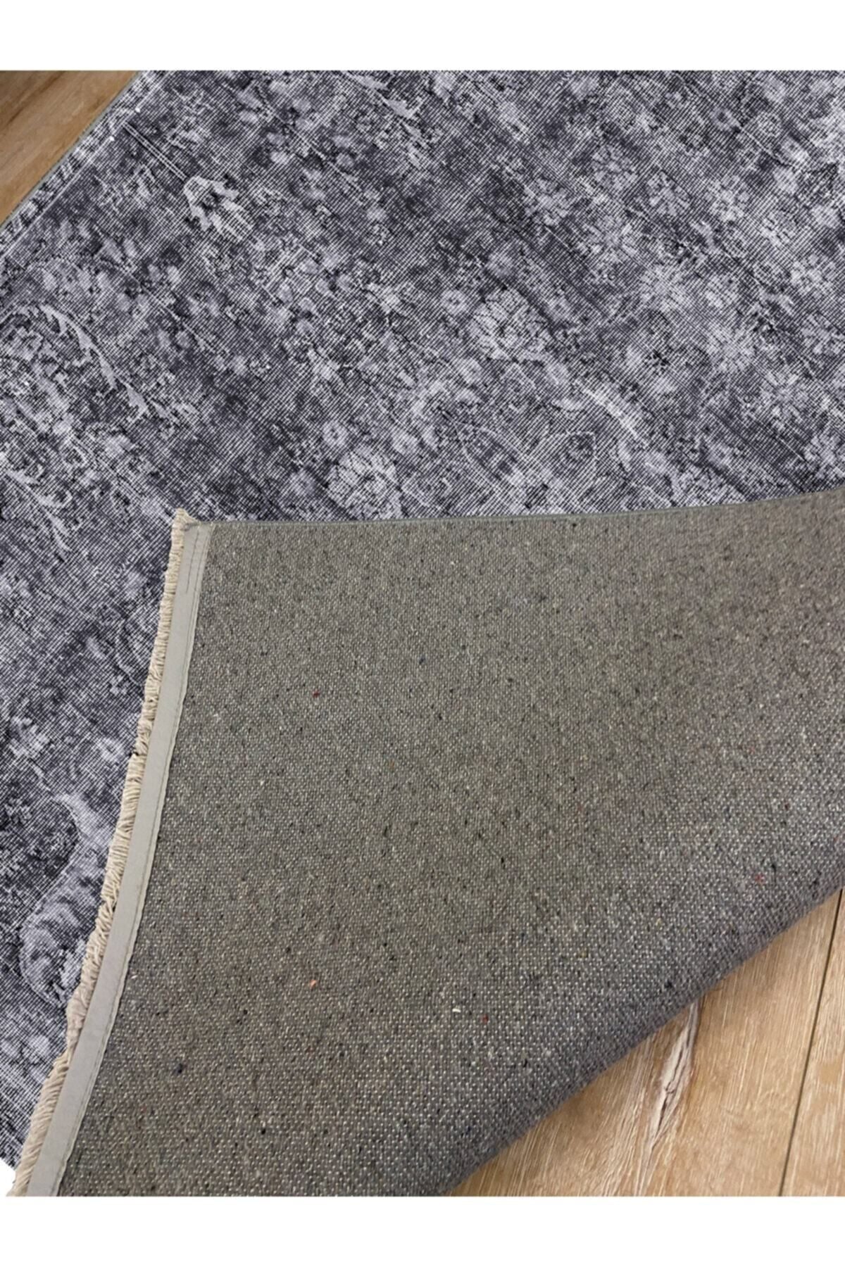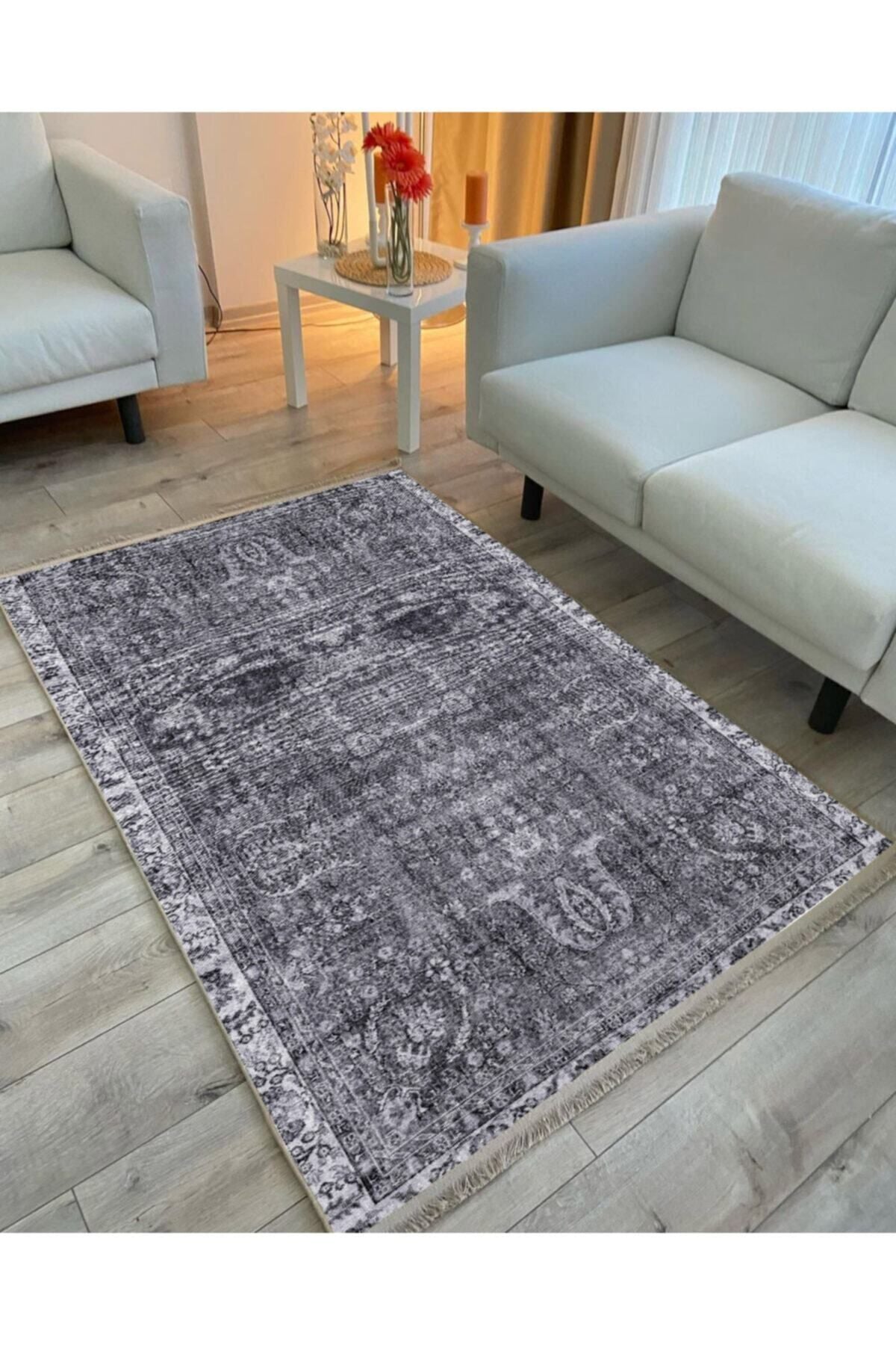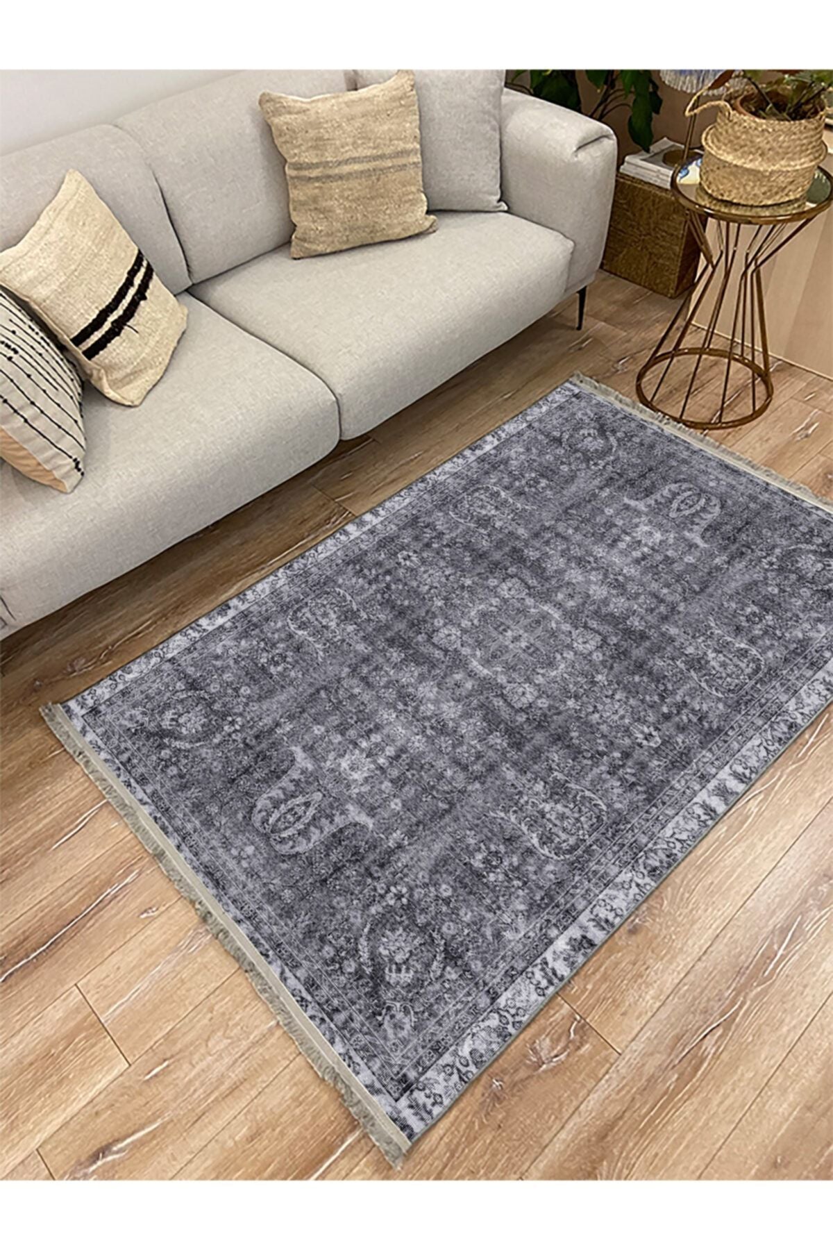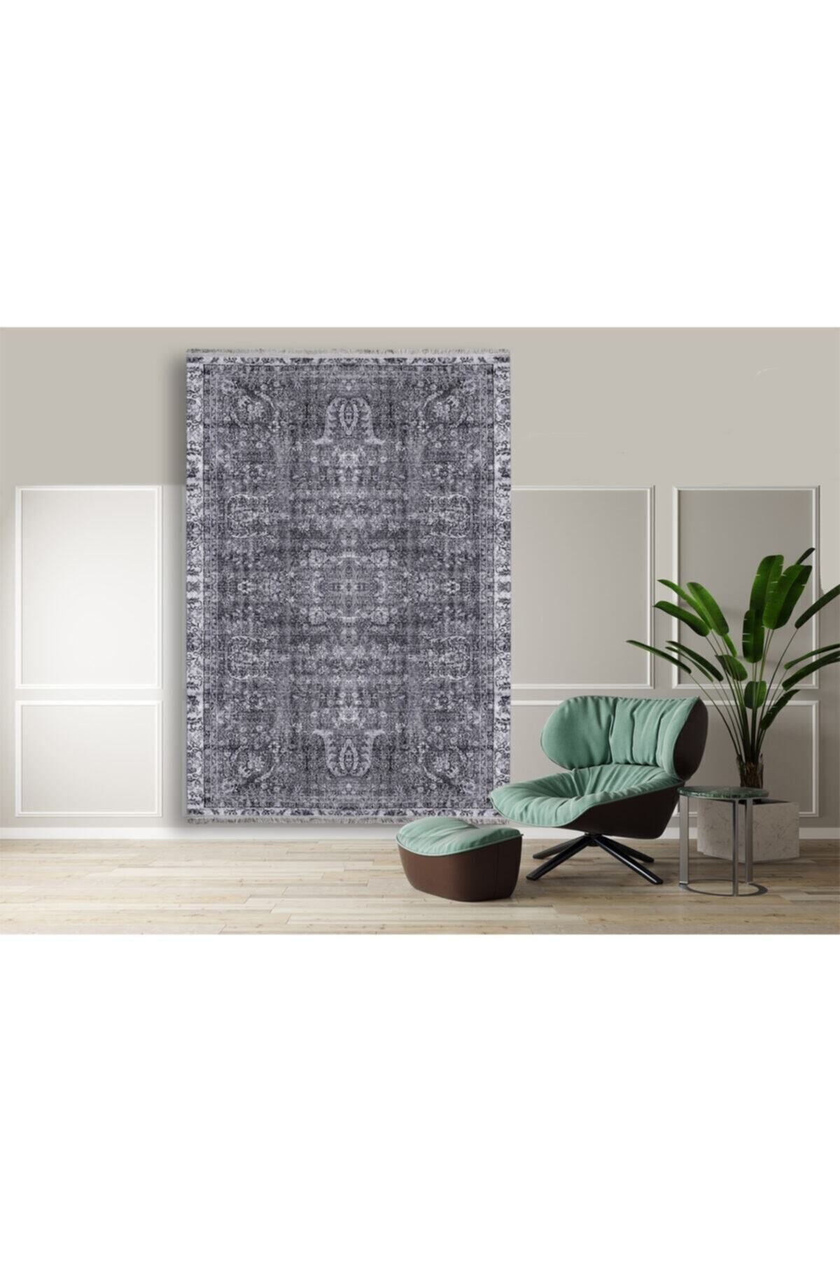 Halı Vagonu 2025 Gri Tonunda Bordürlü Klasik Desen Kaymaz Taban Dekoratif Halı