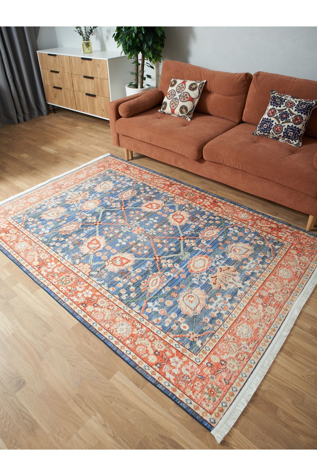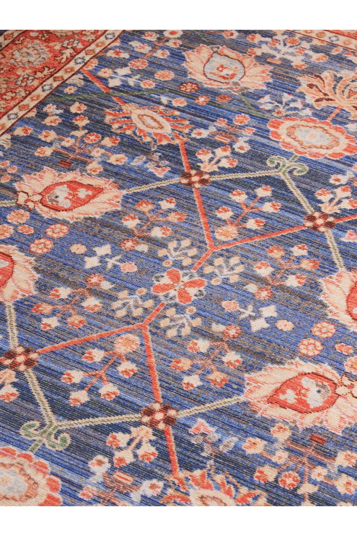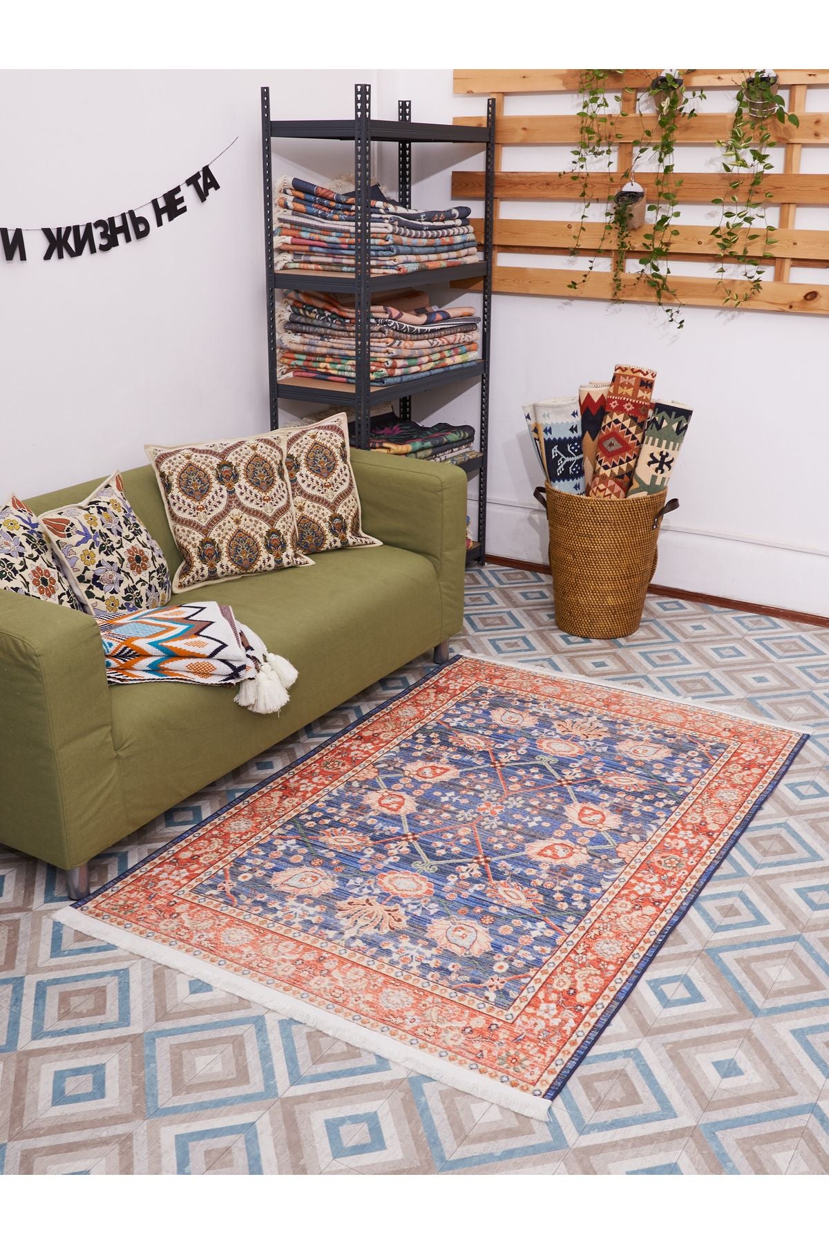 Halı Vagonu 2030 Pastel Lacivert Kiremit Çiçekli Retro Bohem Dokuma Taban Salon Halısı Mutfak Halısı