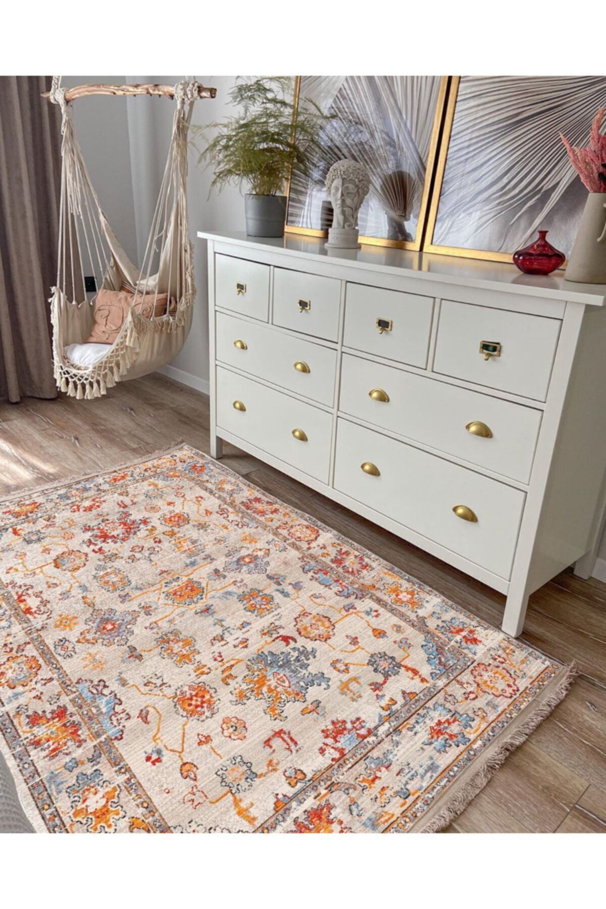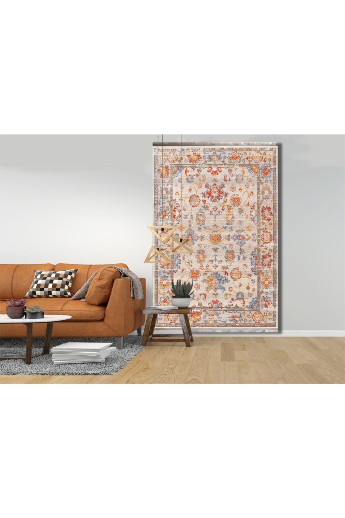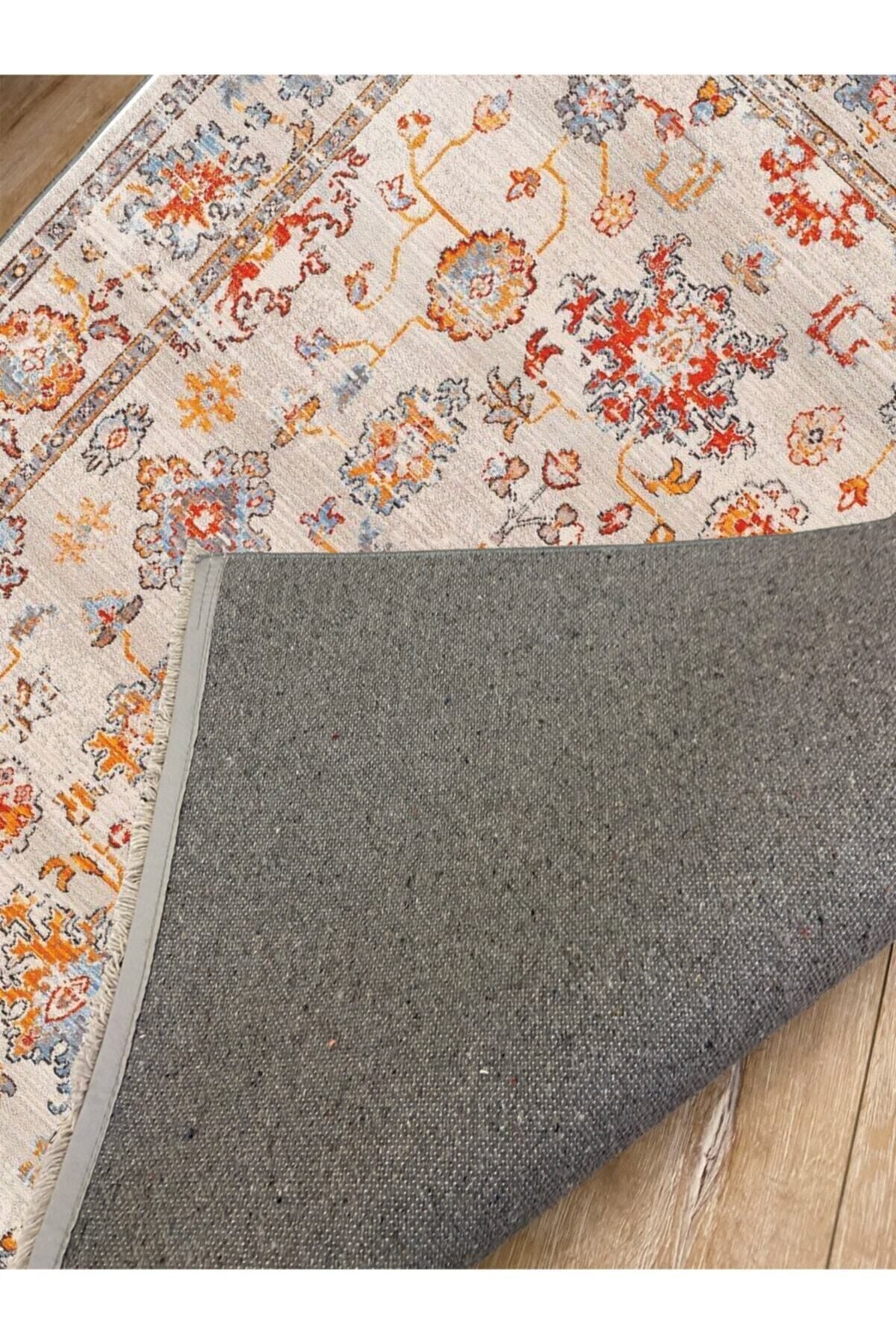 Halı Vagonu 2037 Krem Tonlarında Çiçek Temalı Bordürlü Desen Kaymaz Taban Dekoratifl Halı