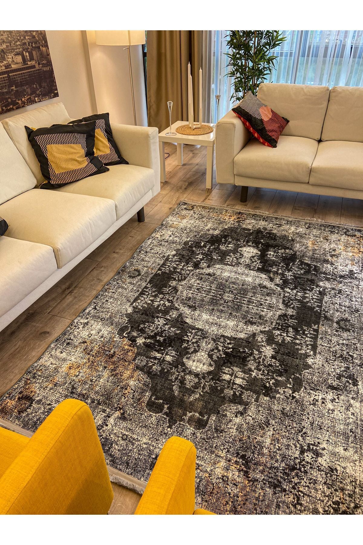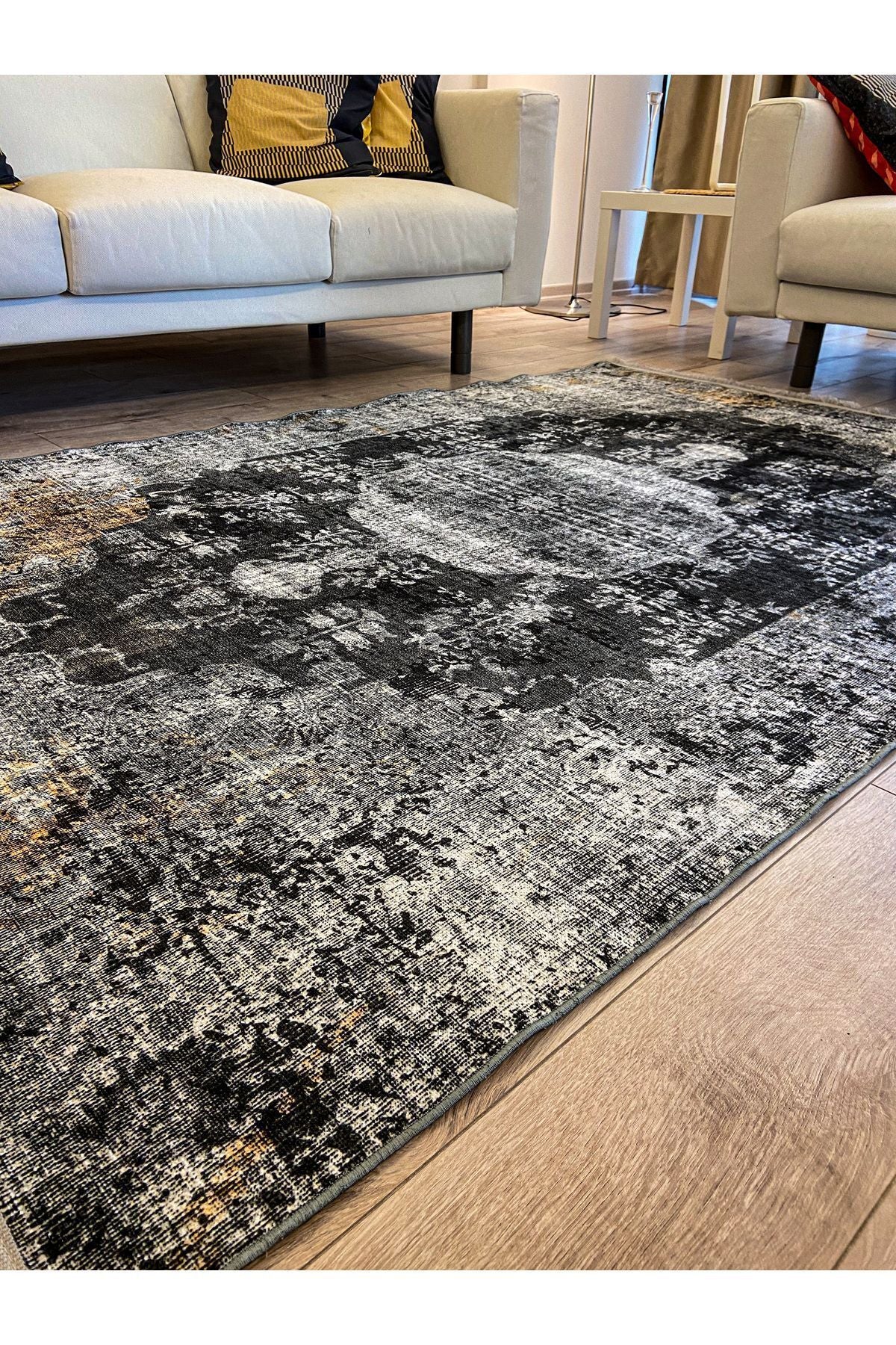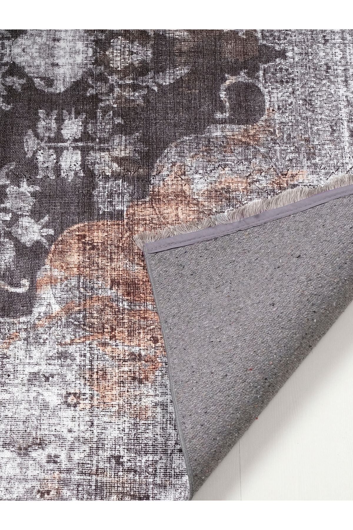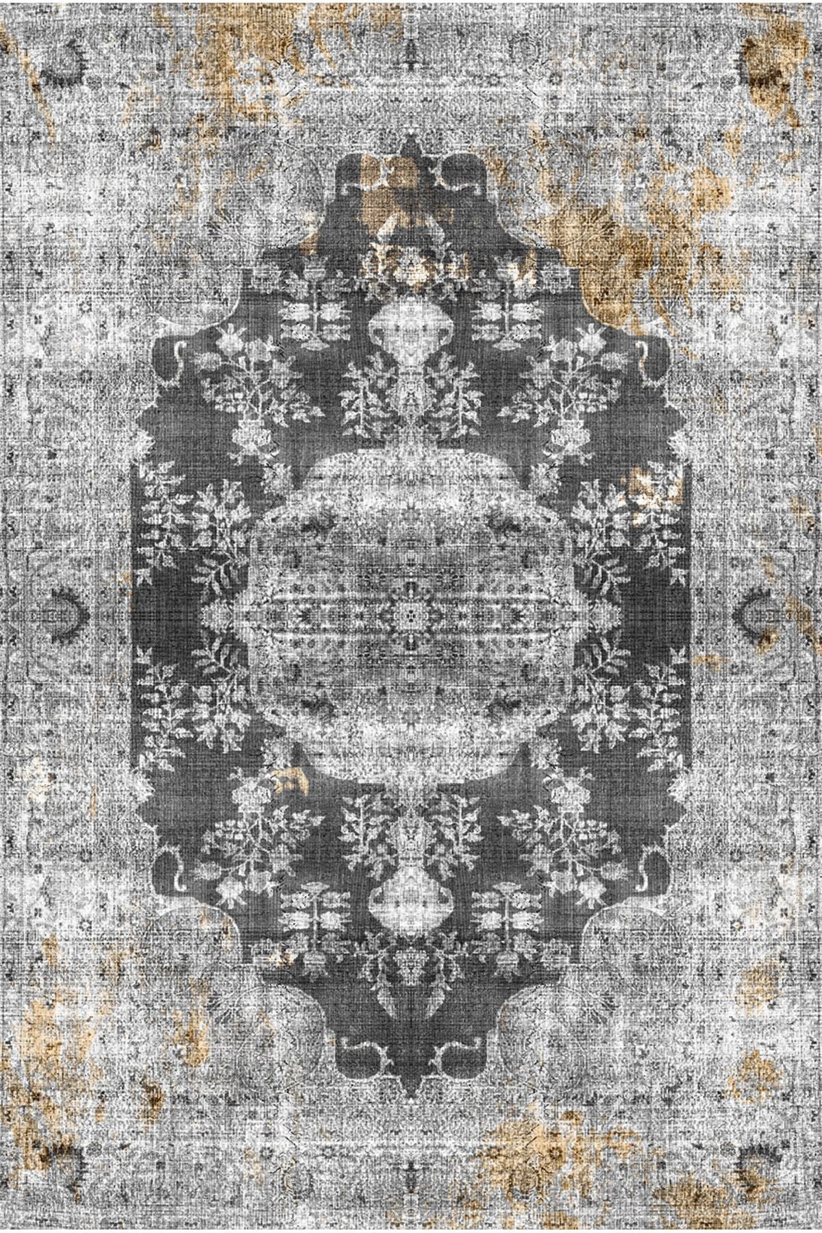 Halı Vagonu 2155 Gri Siyah Hardal Sarı Vintage Desenli Dokuma Taban Halı