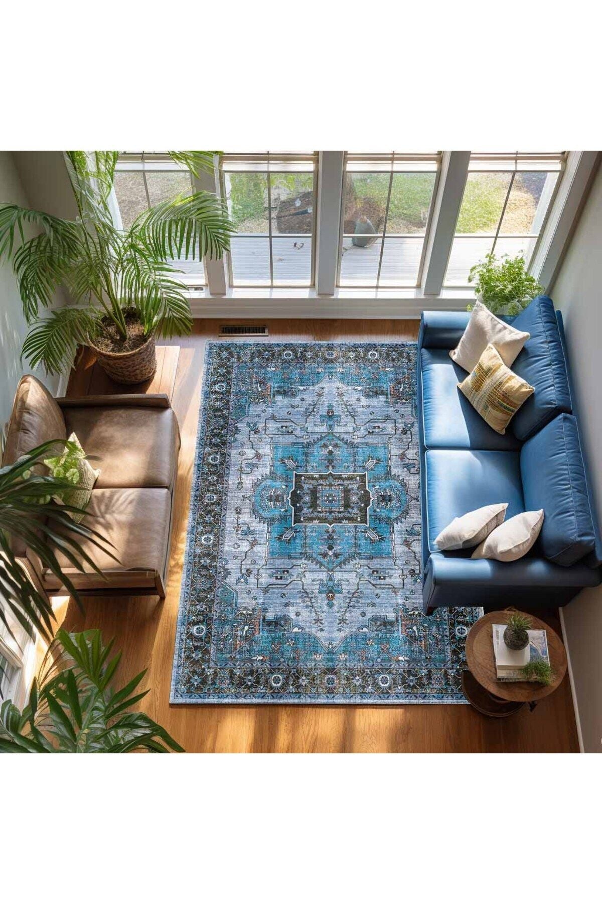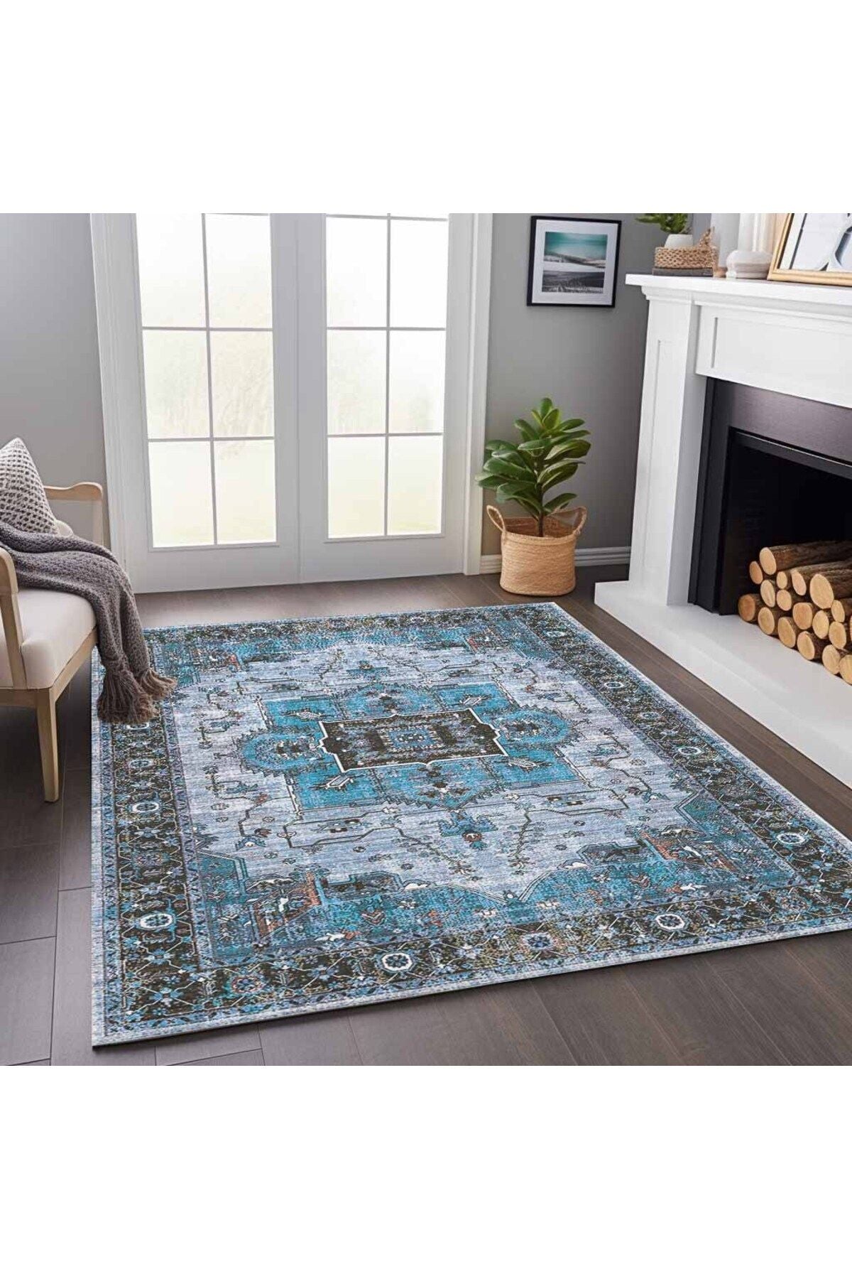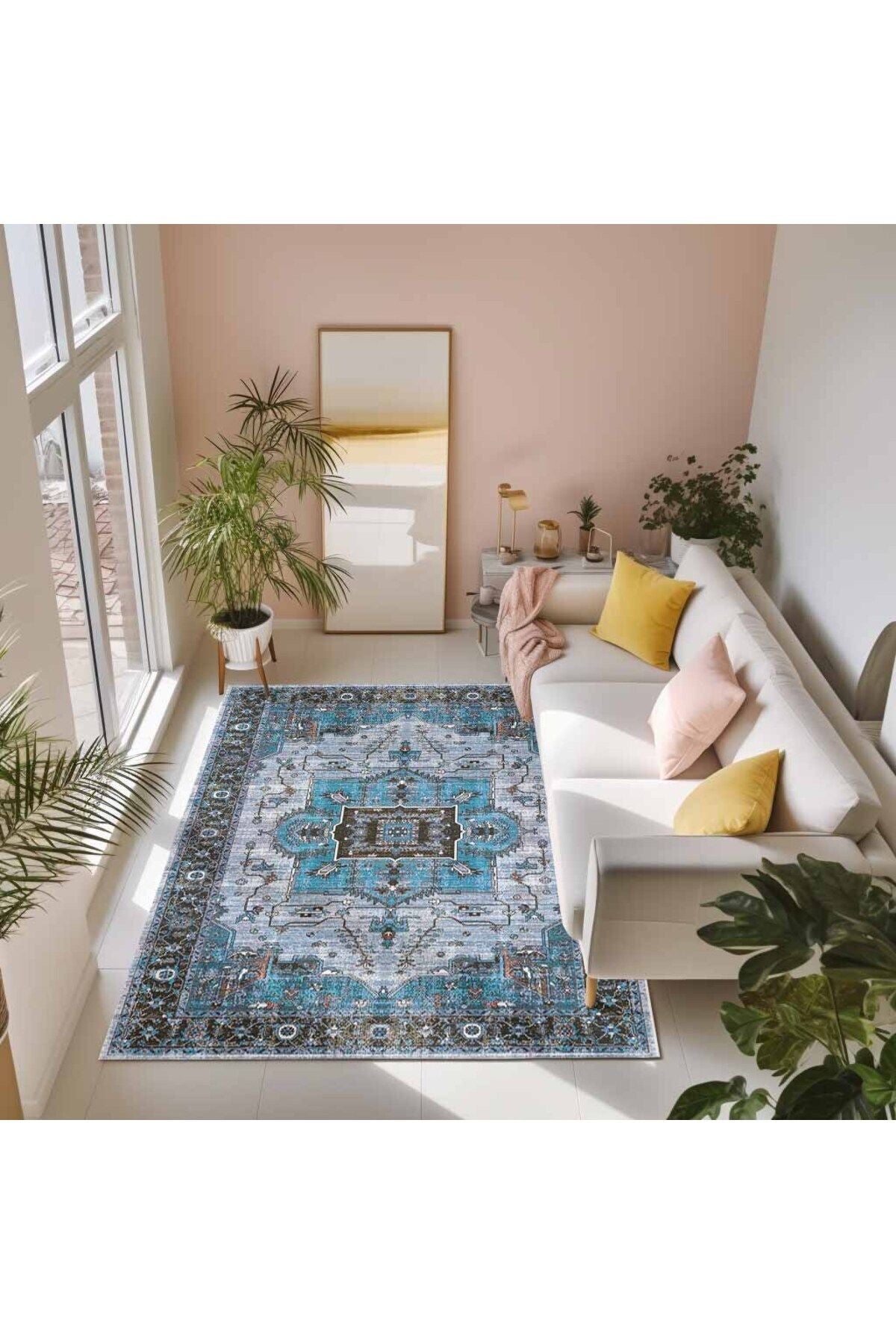 Halı Vagonu 2251 Mavi Bordürlü Modern Yıkanabilen Dokuma Taban Dekoratif Halı