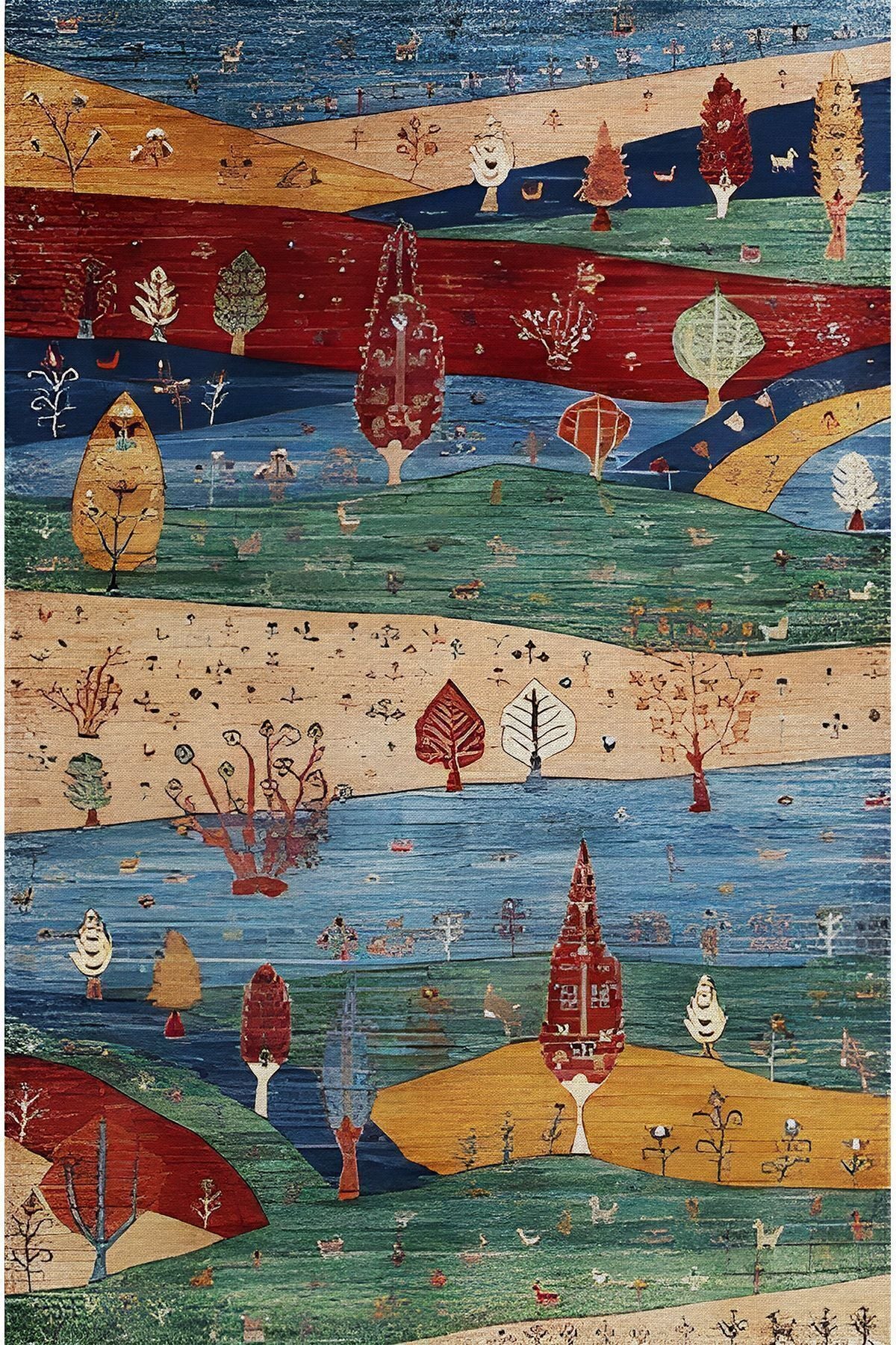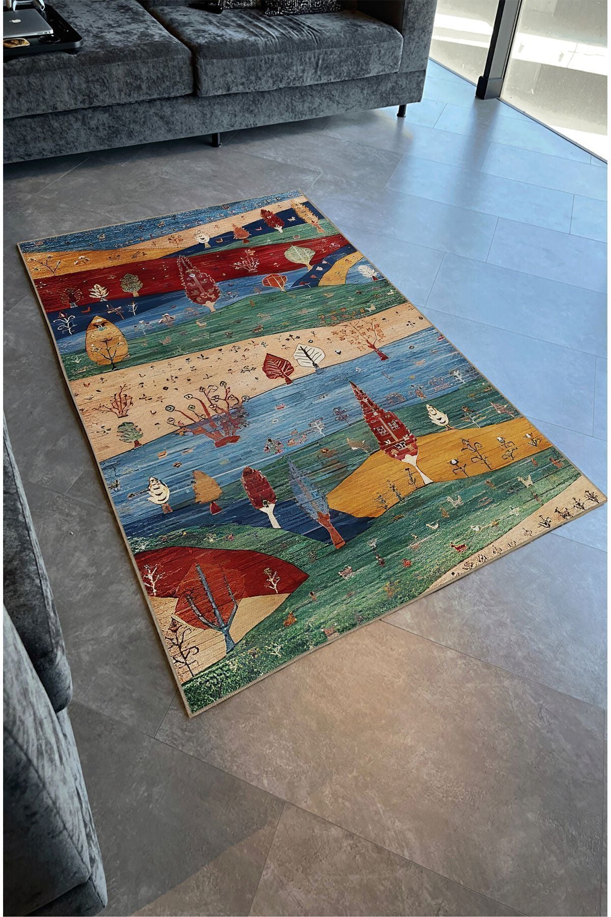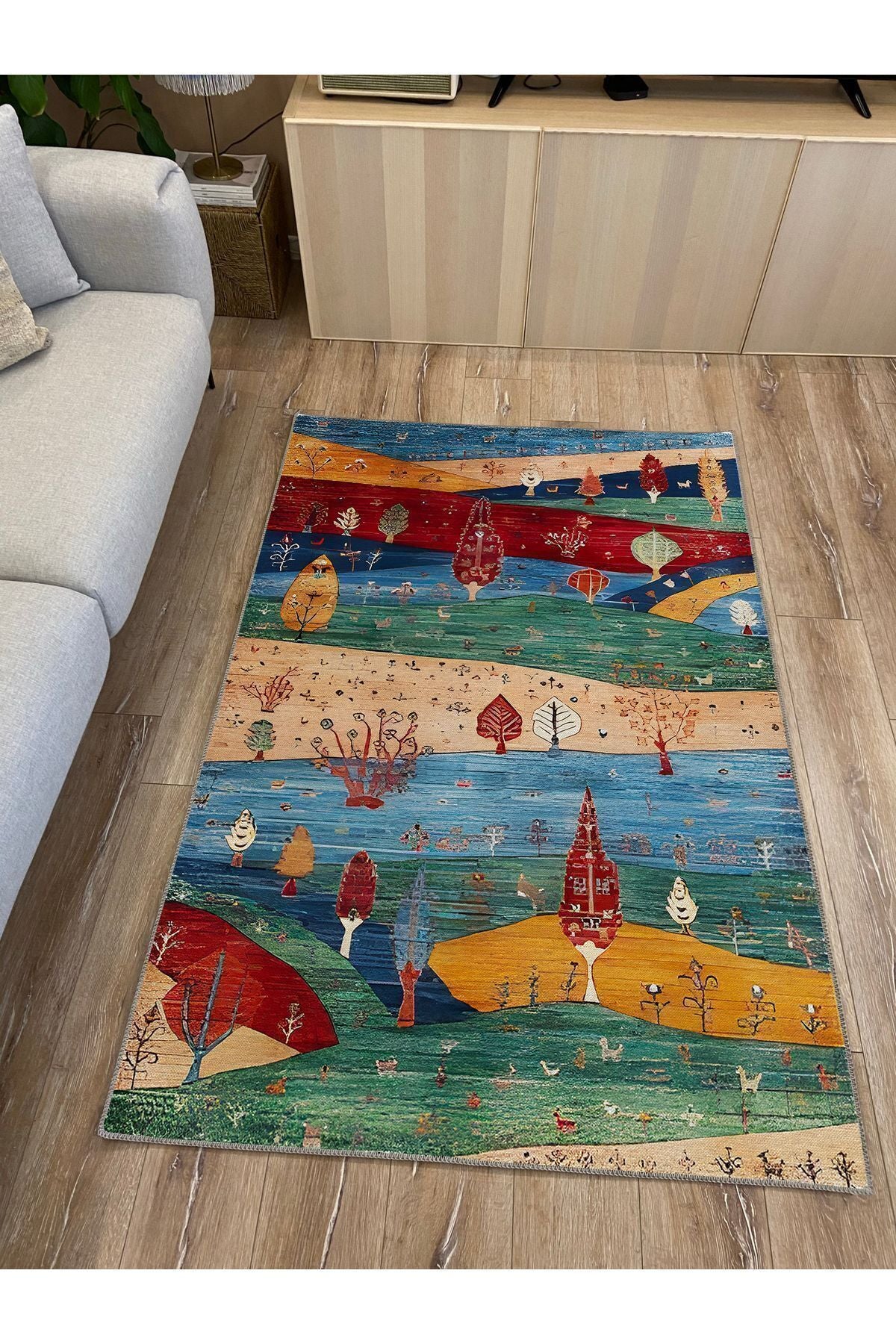 Halı Vagonu 77 Renklı Manzara Temalı Dekoratif Salon Halısı Saçaklı Yıkanabilen Halı