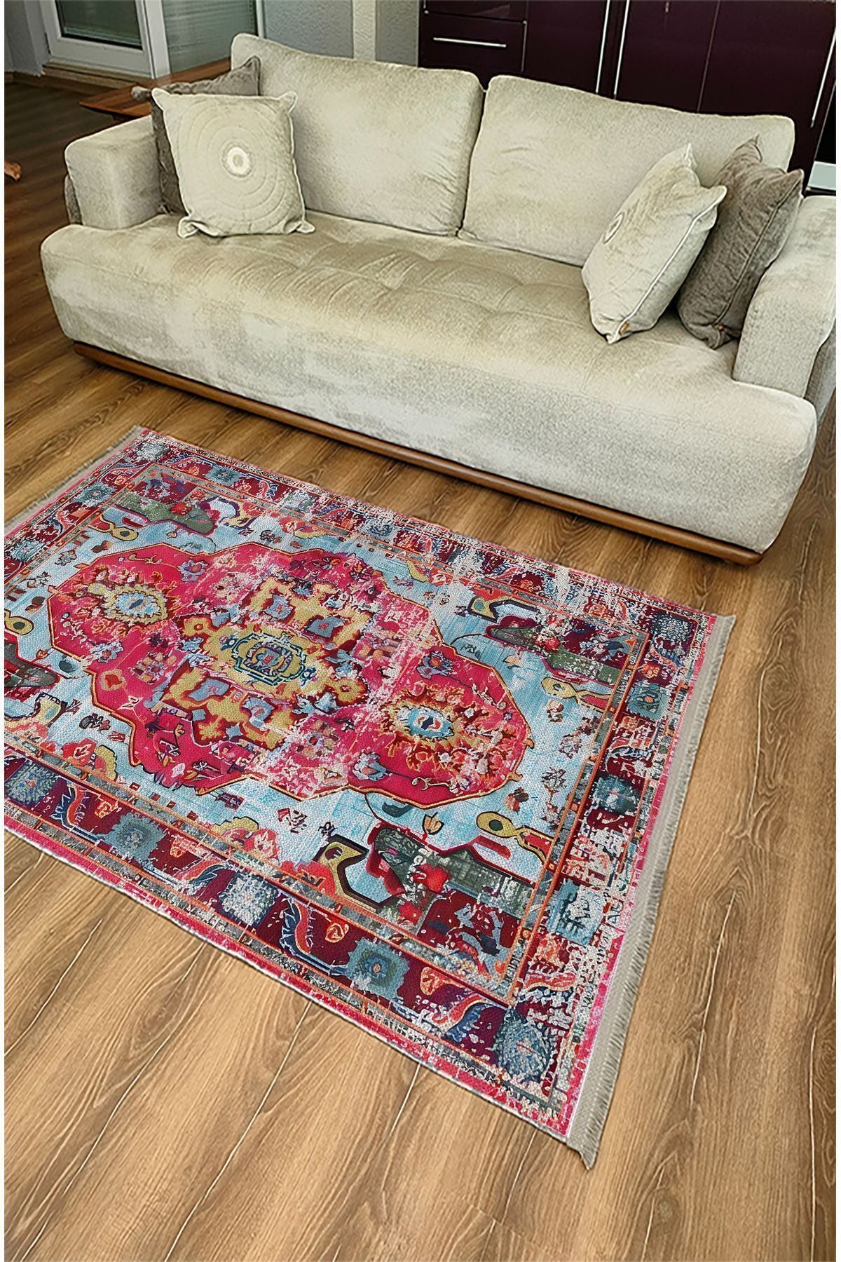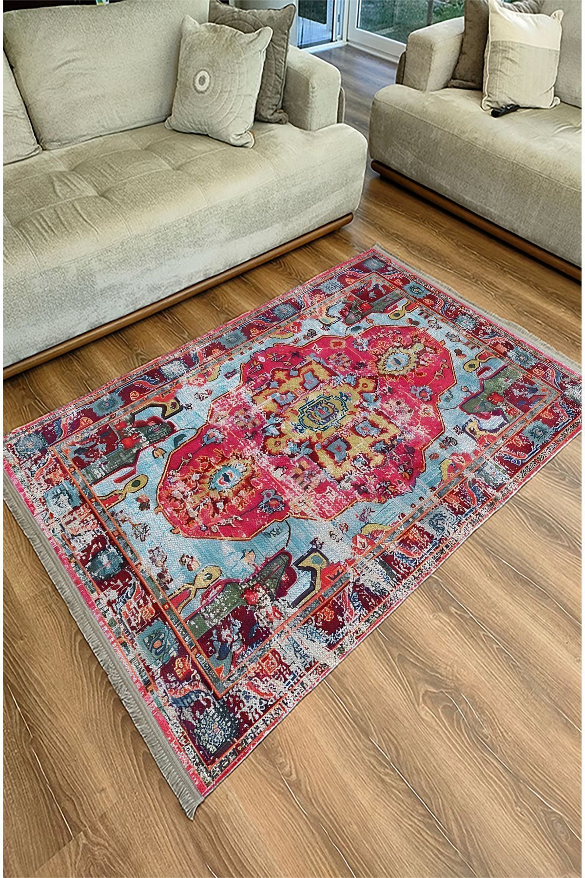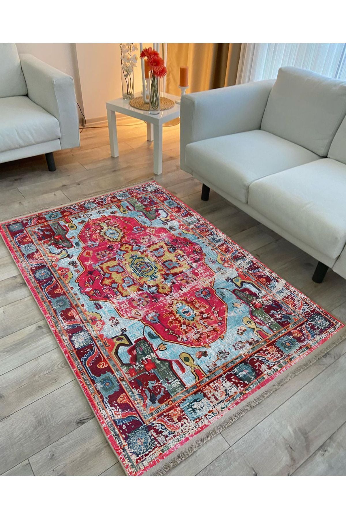 Halı Vagonu 91 Fuşya Tonlarında Klasık Dekoratif Salon Halısı Saçaklı Yıkanabilen Dekoratif Halı
