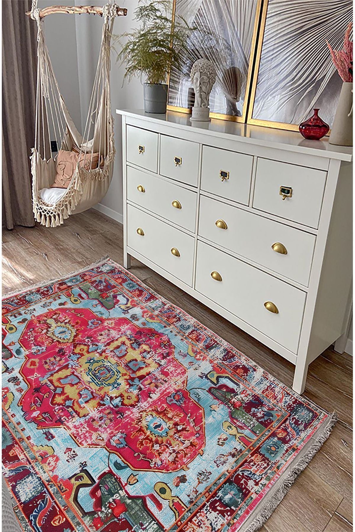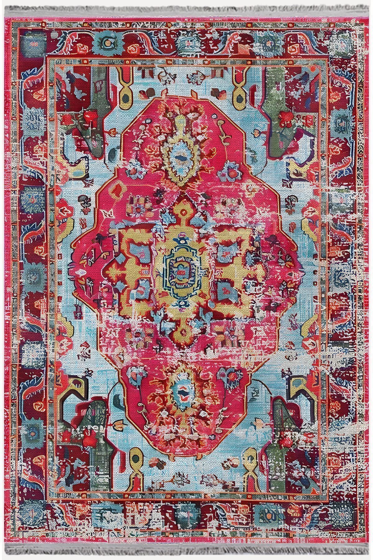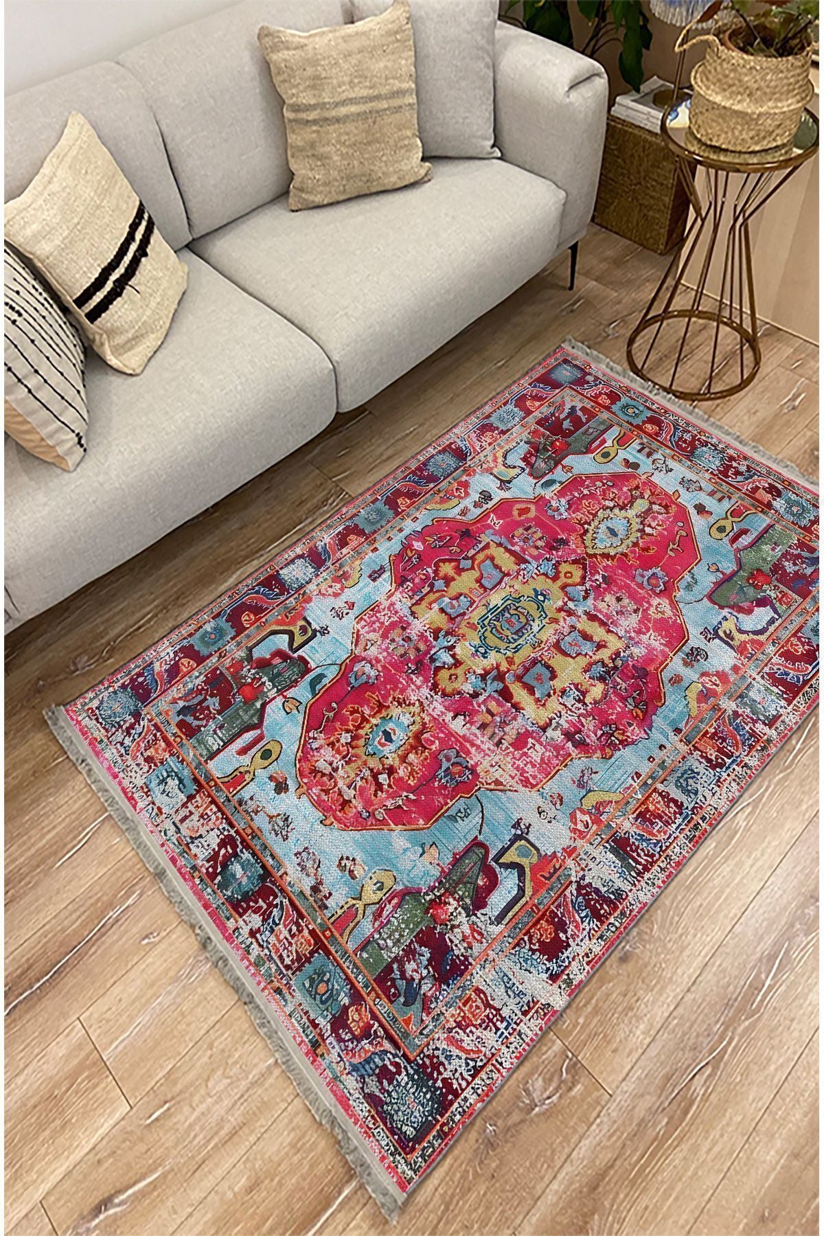 Halı Vagonu 91 Fuşya Tonlarında Klasık Dekoratif Salon Halısı Saçaklı Yıkanabilen Dekoratif Halı