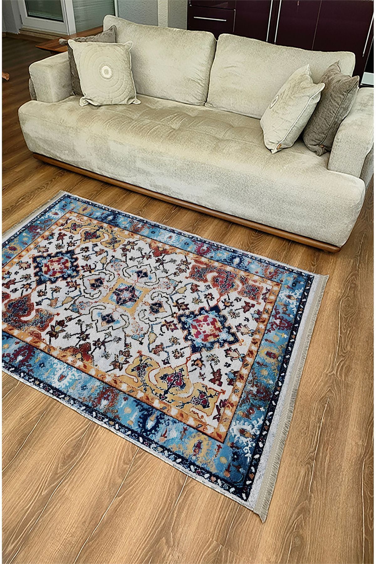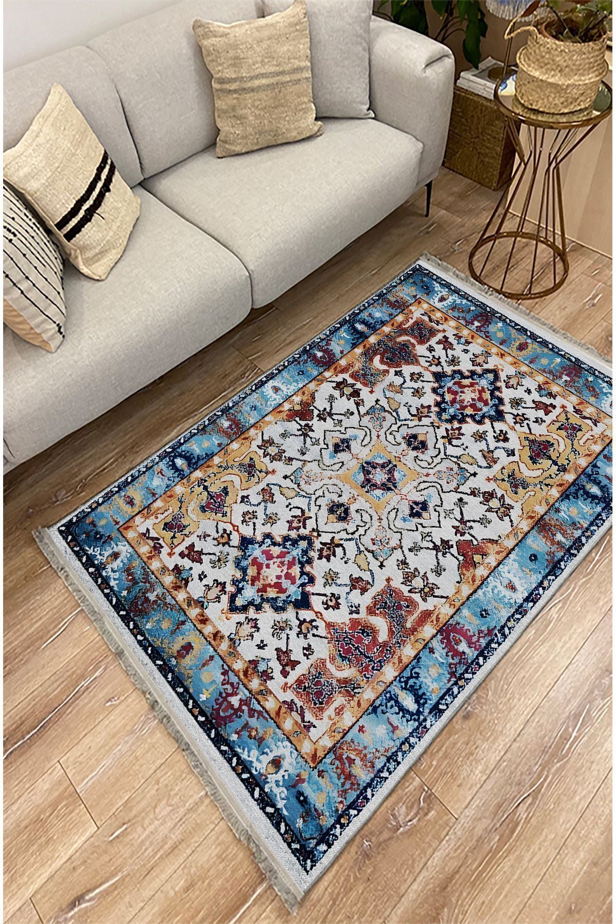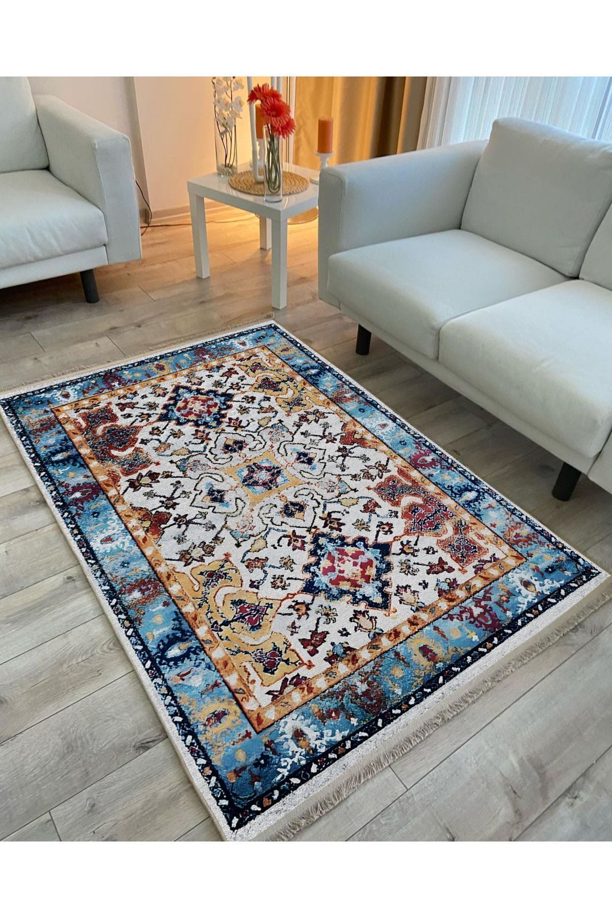 Halı Vagonu Halı 100 Mavi Tonlarında Klasık Dekoratif Halı Salon Halısı Saçaklı Yıkanabilen Halı