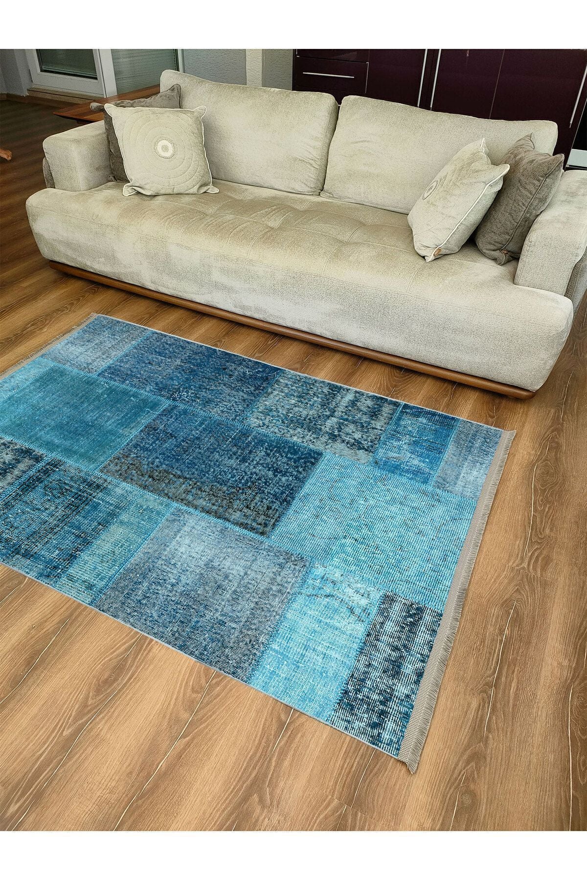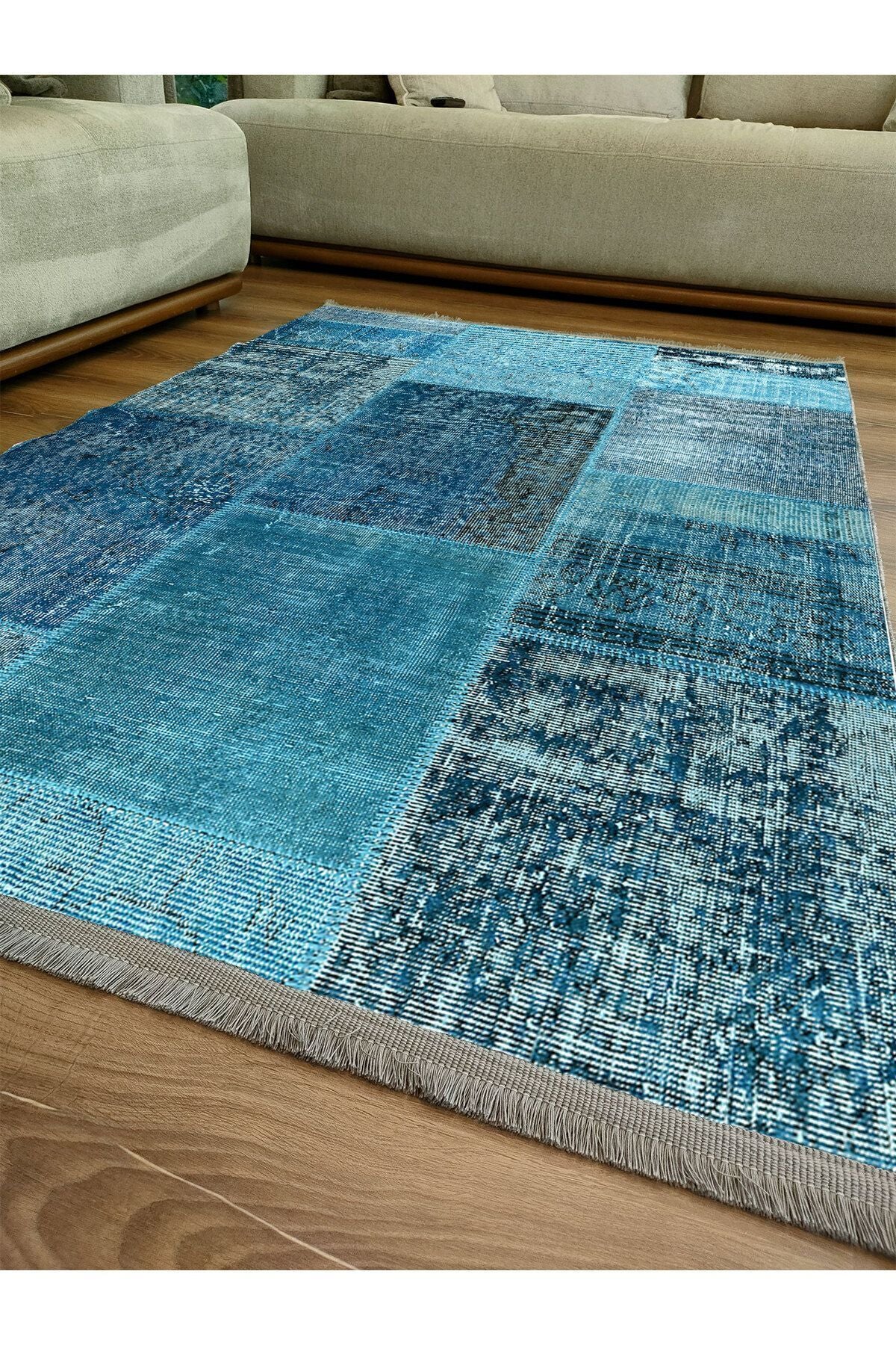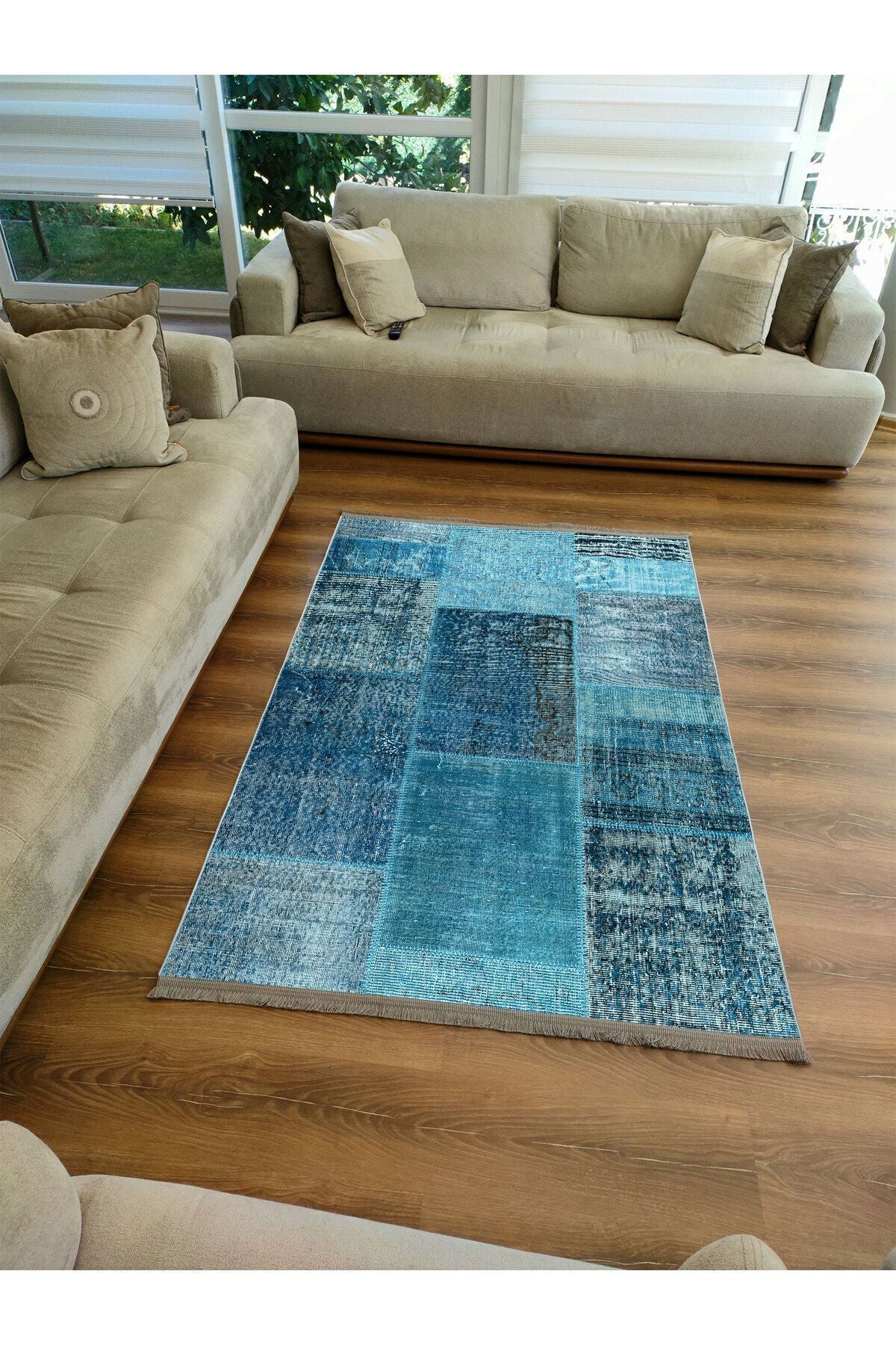 Halı Vagonu Halı 2090 Mavi Tonunda Dekoratif Halı Salon Halısı Saçaklı Yıkanabilen Halı