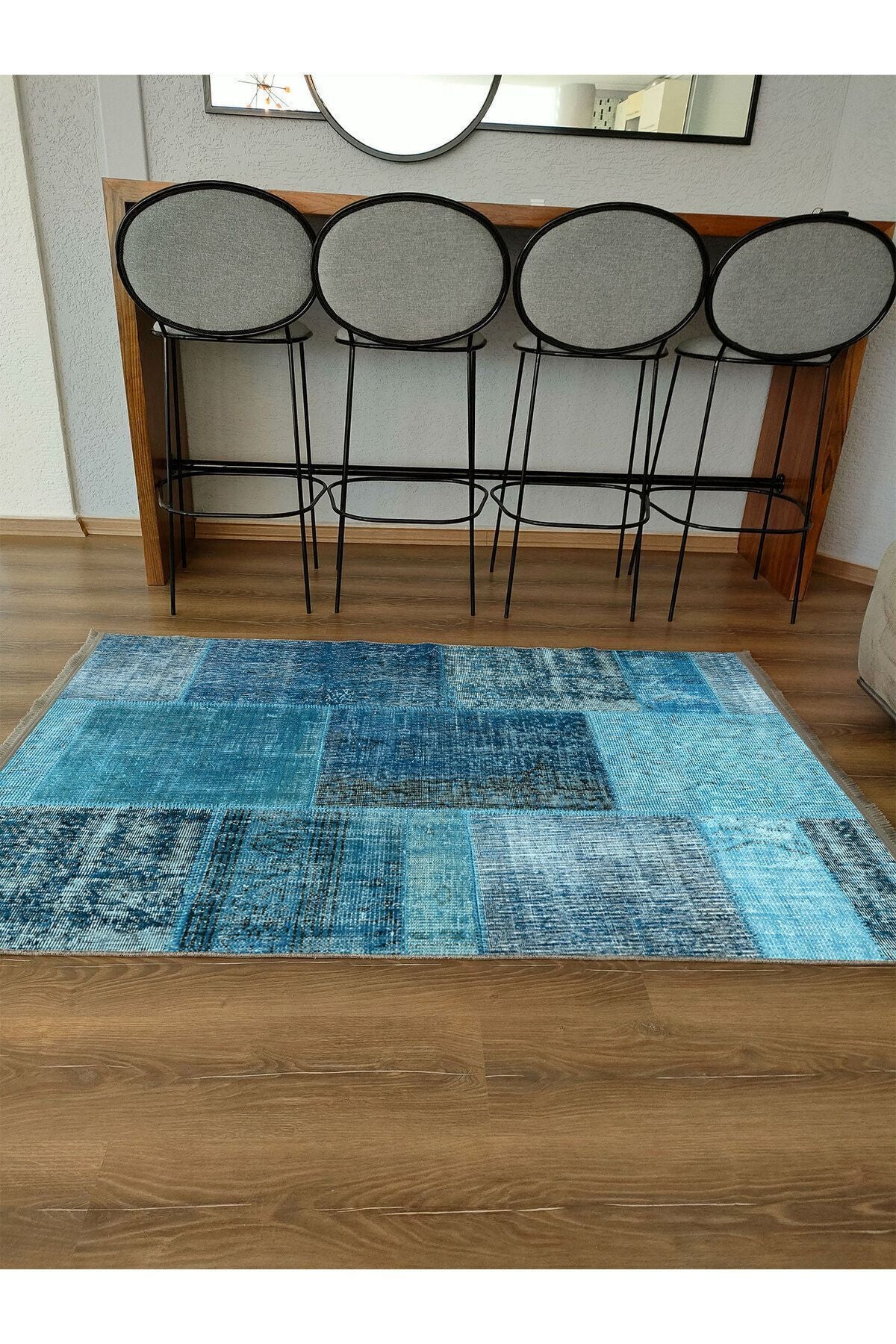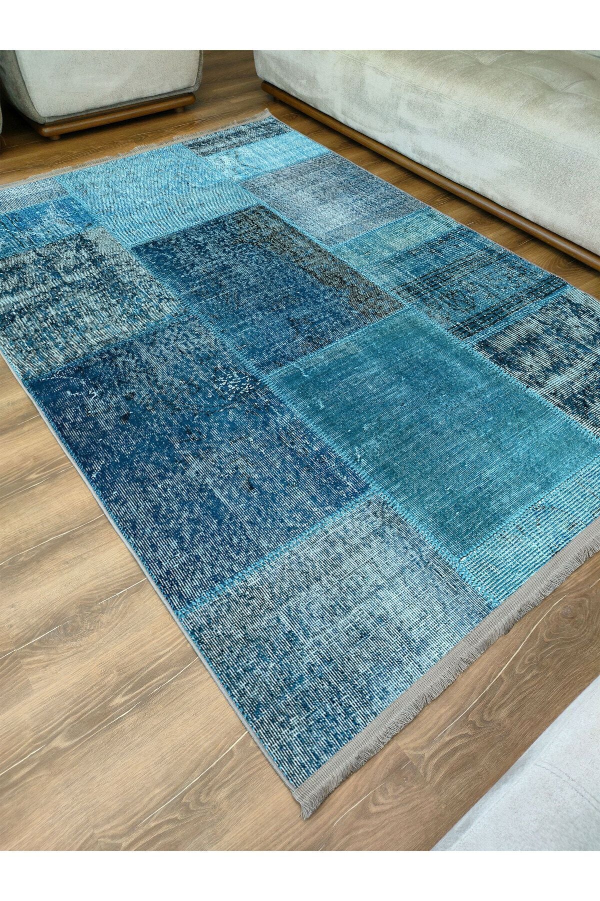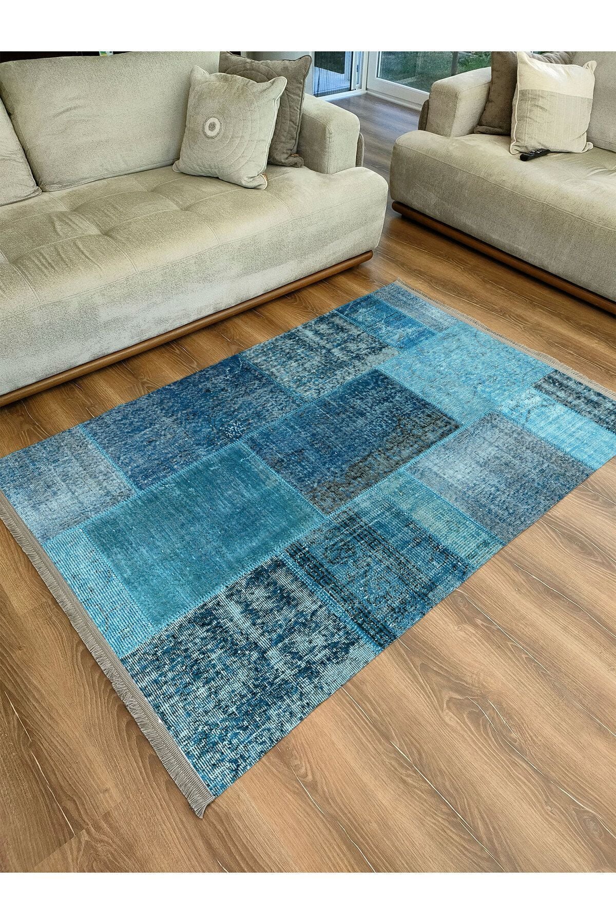 Halı Vagonu Halı 2090 Mavi Tonunda Dekoratif Halı Salon Halısı Saçaklı Yıkanabilen Halı
