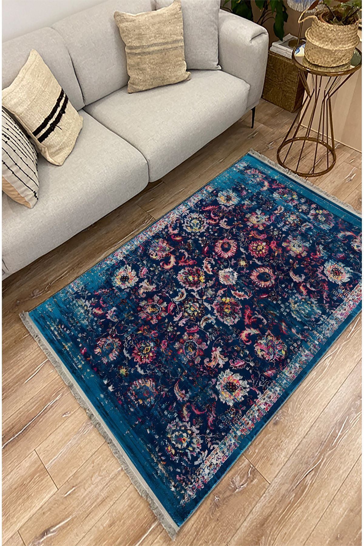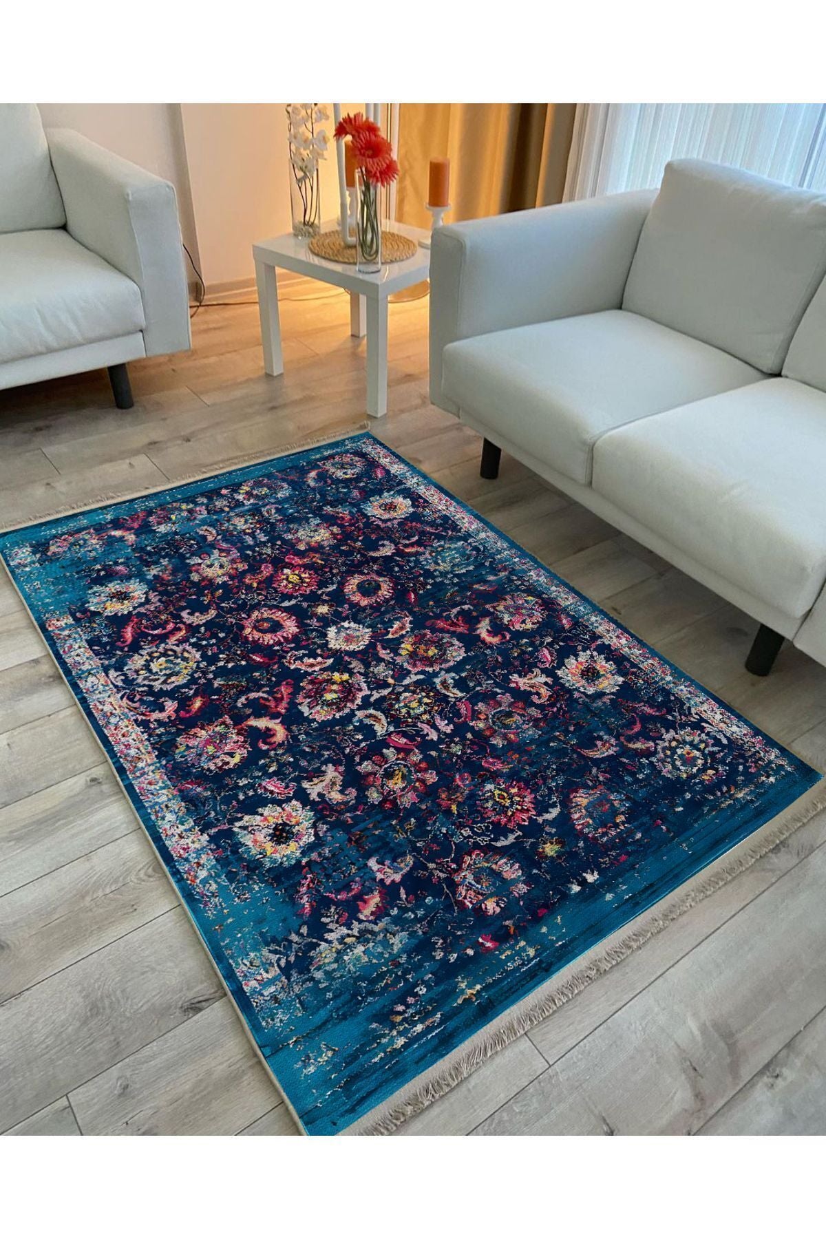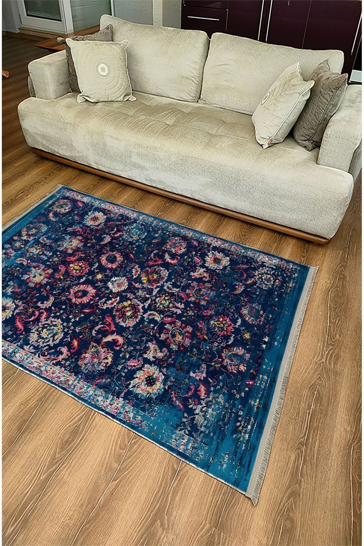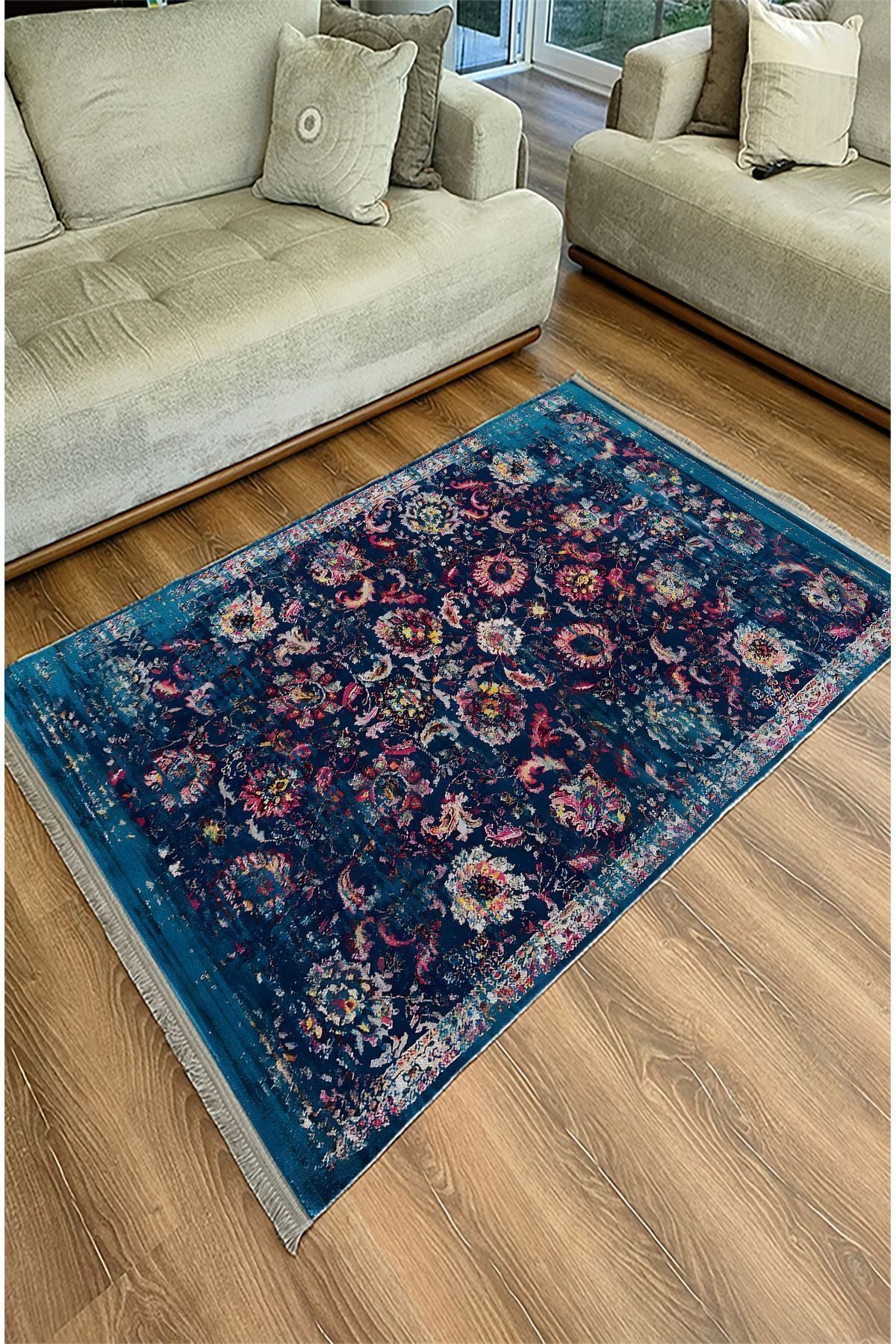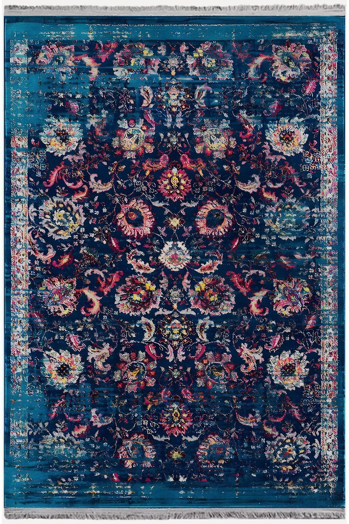 Halı Vagonu Halı 96 Lacivert Tonlarında Klasık Dekoratif Halı Salon Halısı Saçaklı Yıkanabilen Halı