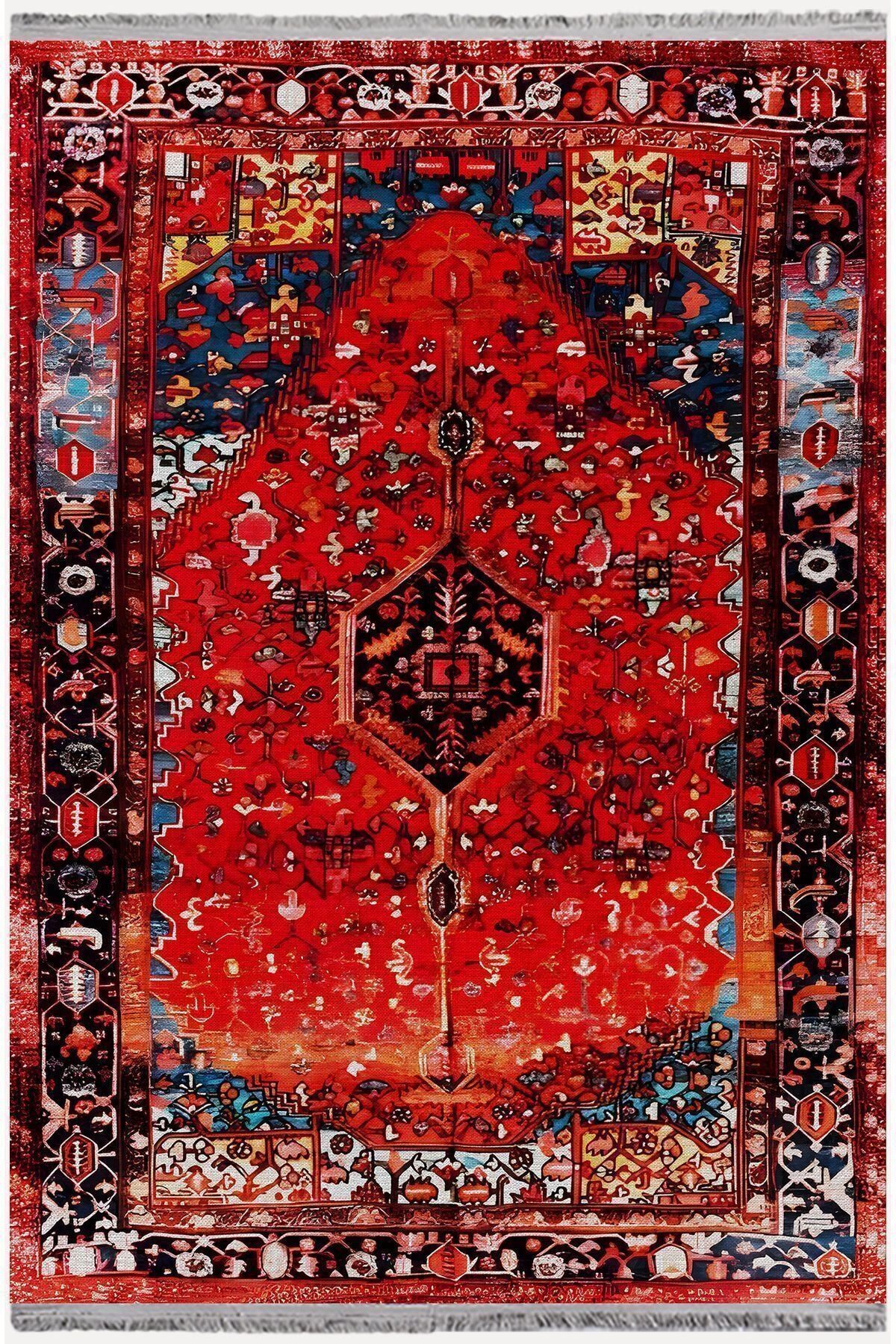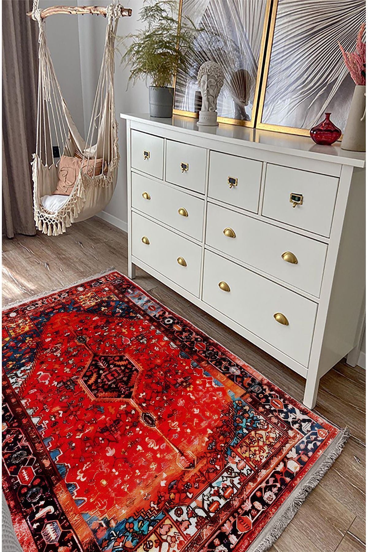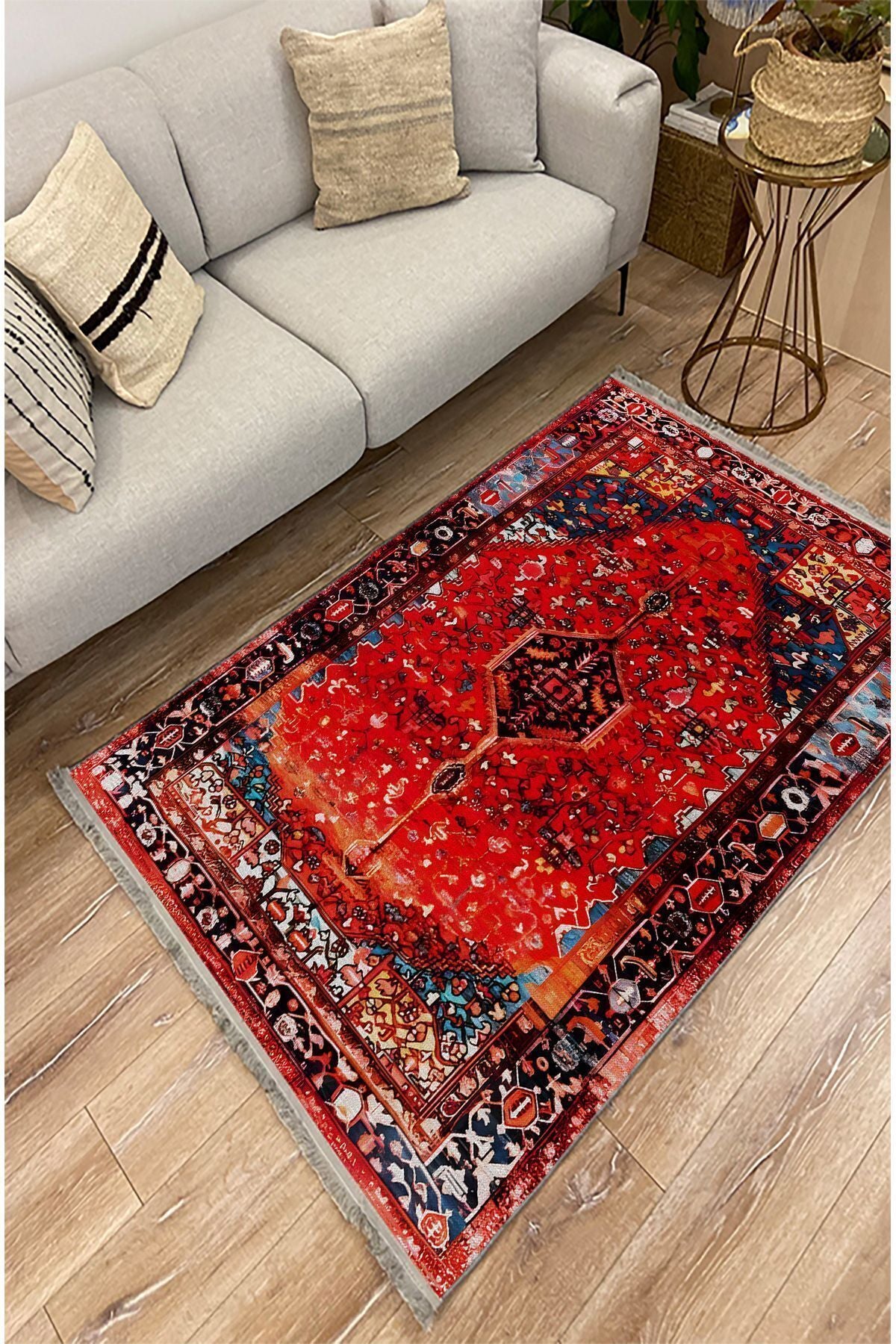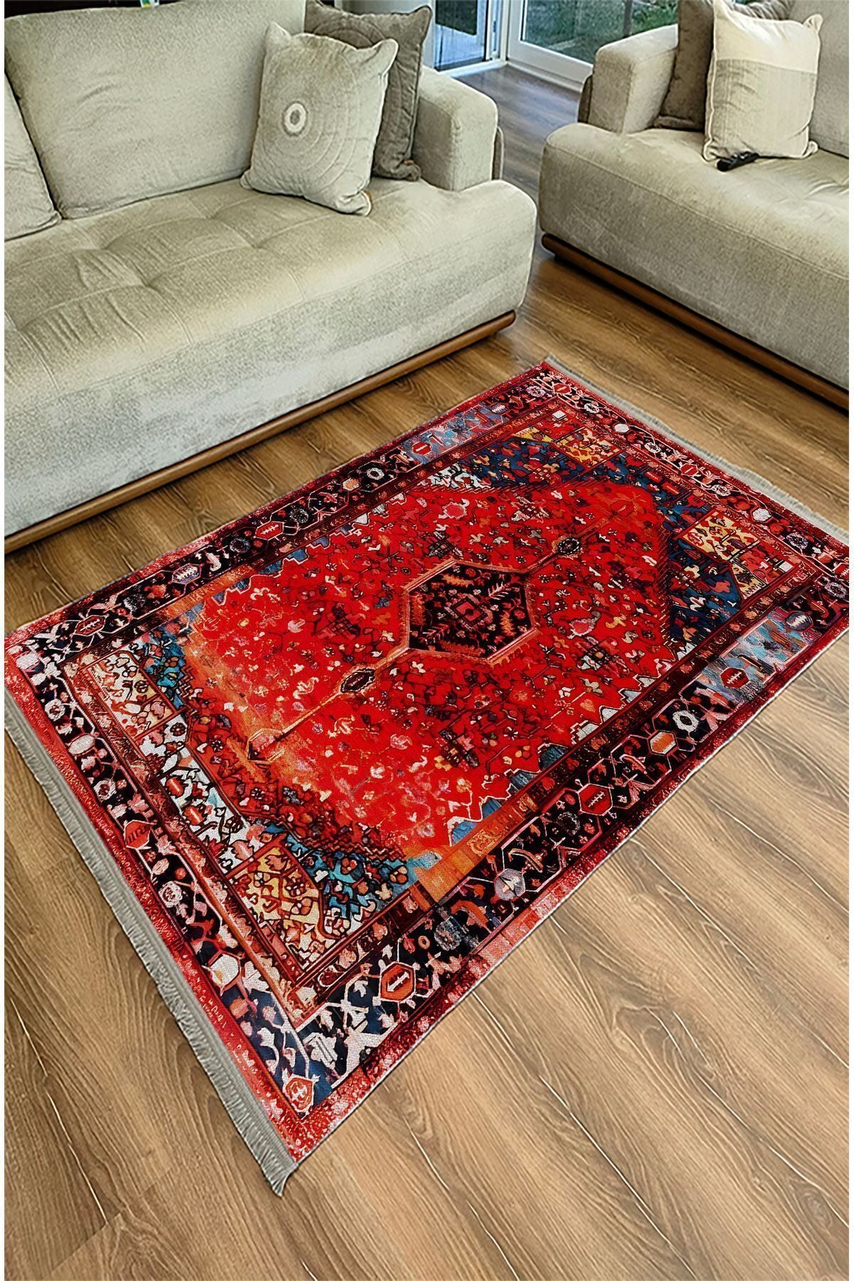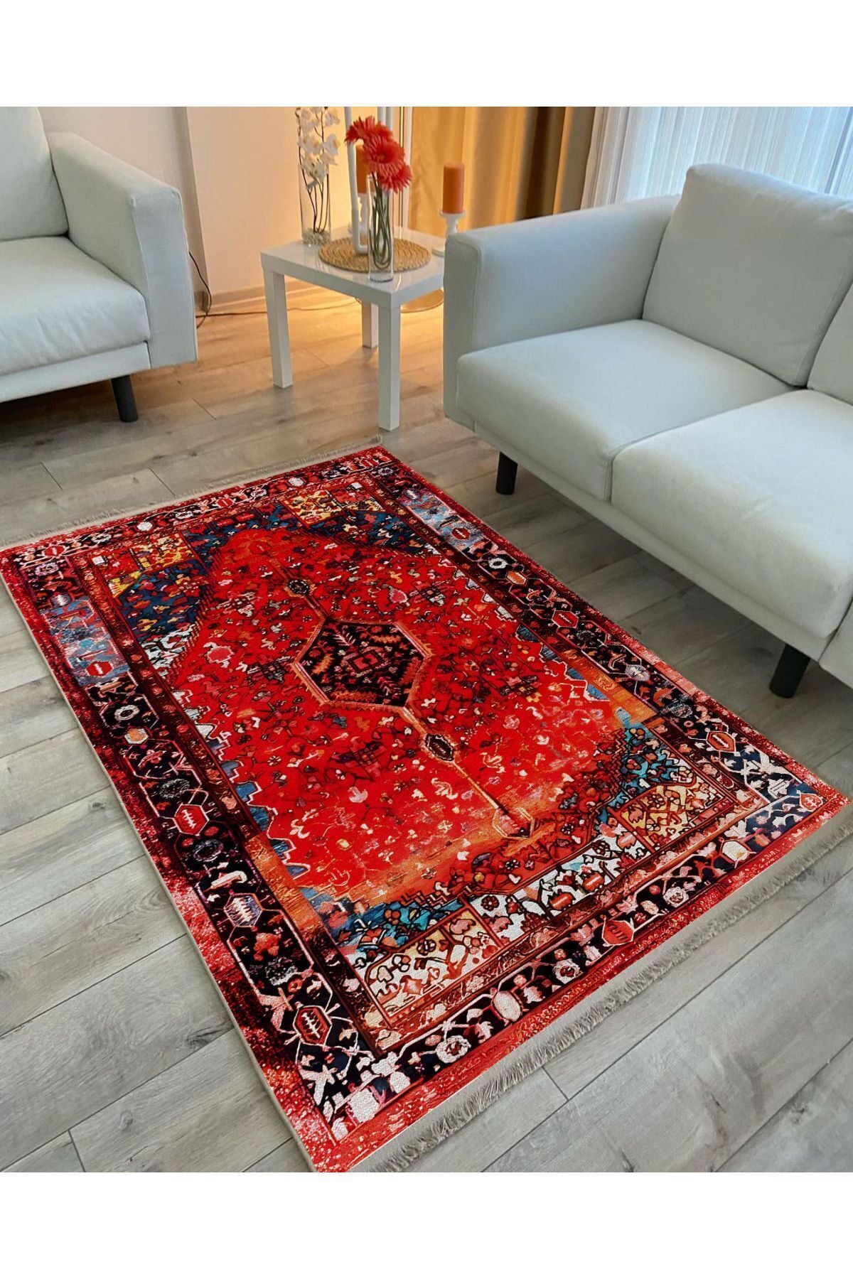 Halı Vagonu Halı95 Kırmızı Tonlarında Klasık Dekoratif Halı Salon Halısı Saçaklı Yıkanabilen Halı