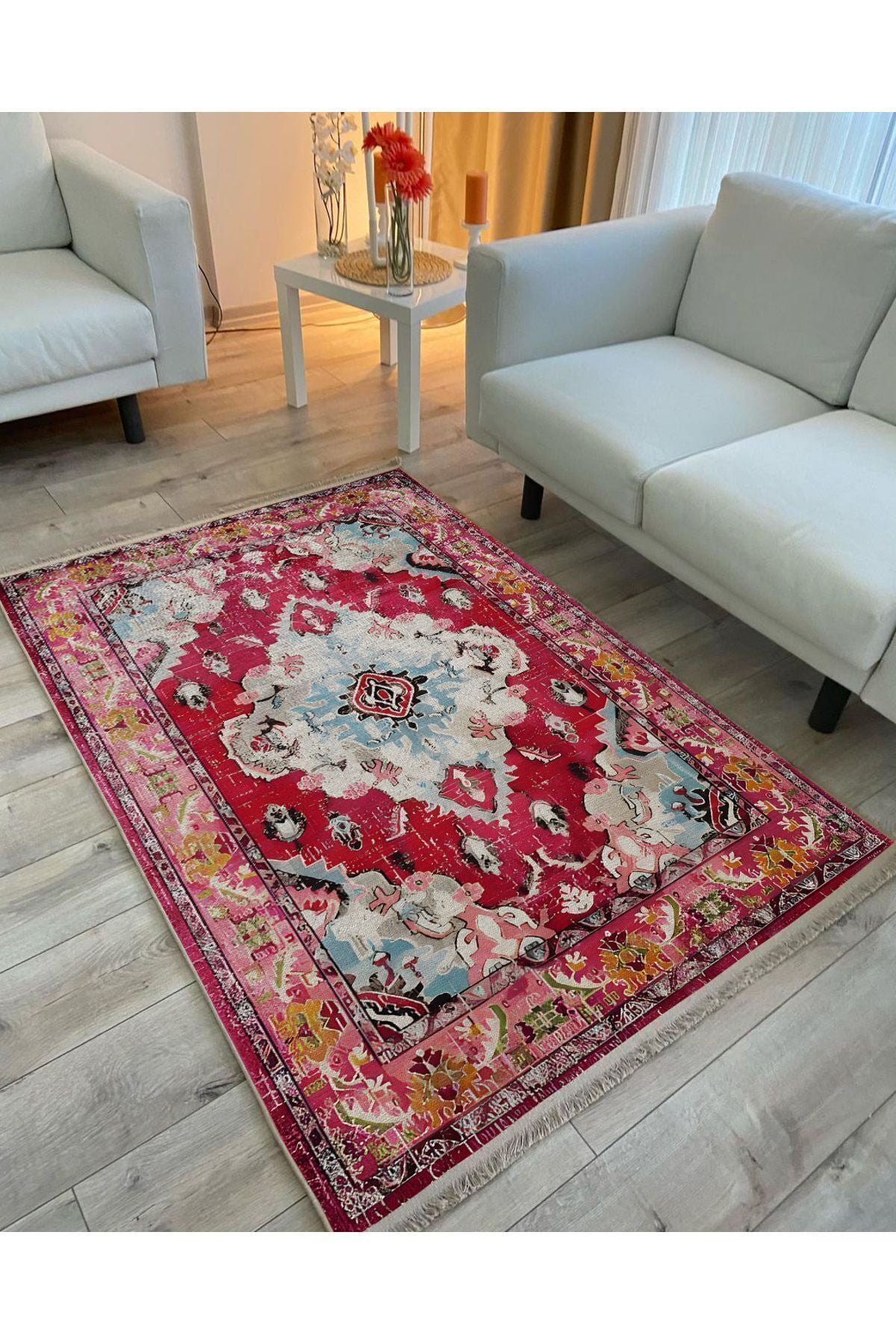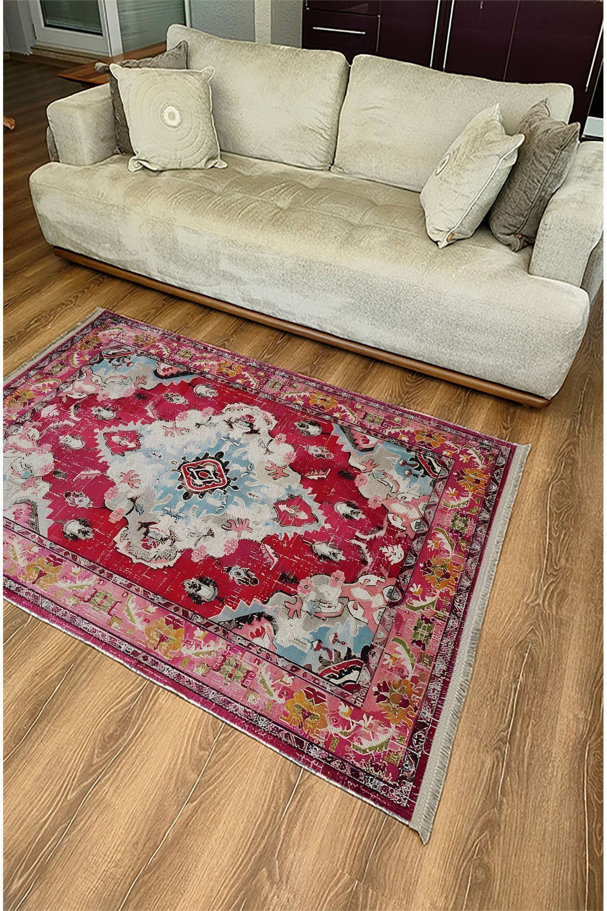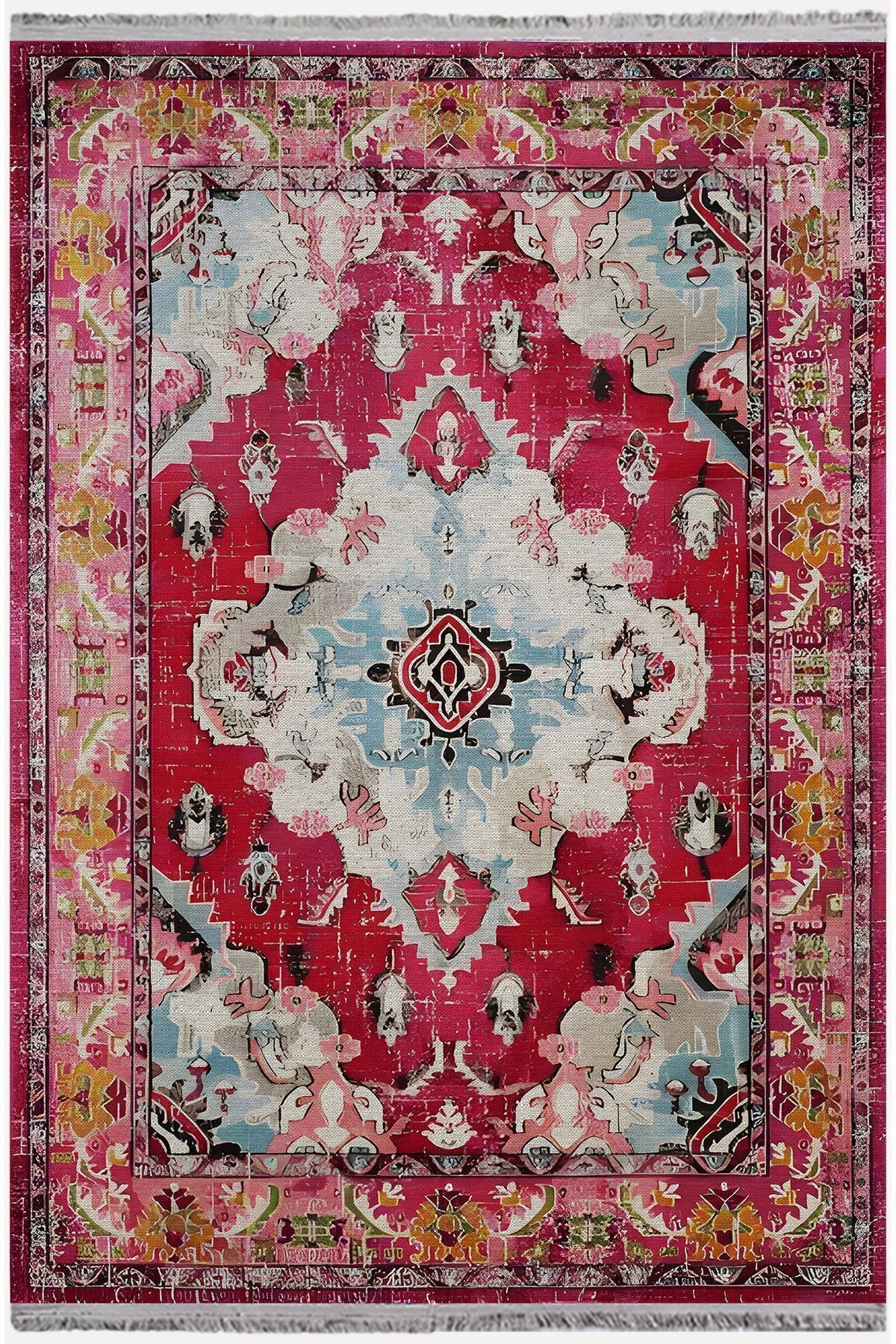 Halı Vagonu Halı98 Fuşya Tonlarında Klasık Dekoratif Halı Salon Halısı Saçaklı Yıkanabilen Halı