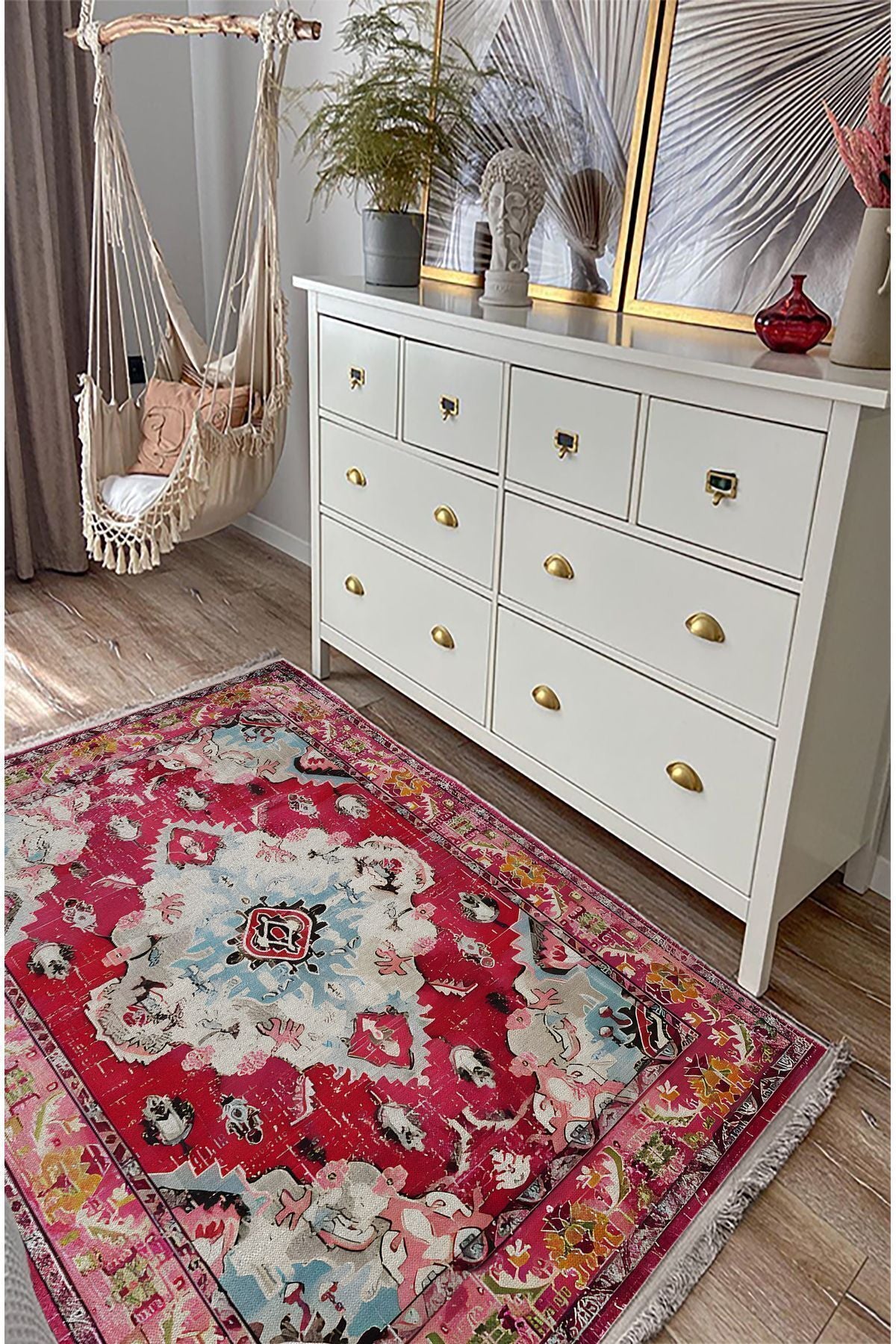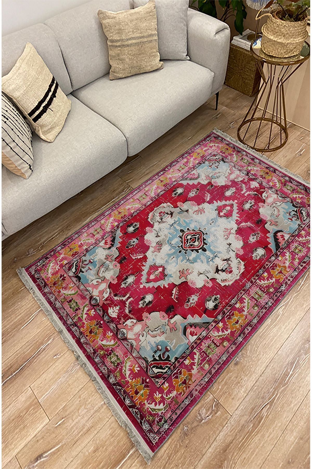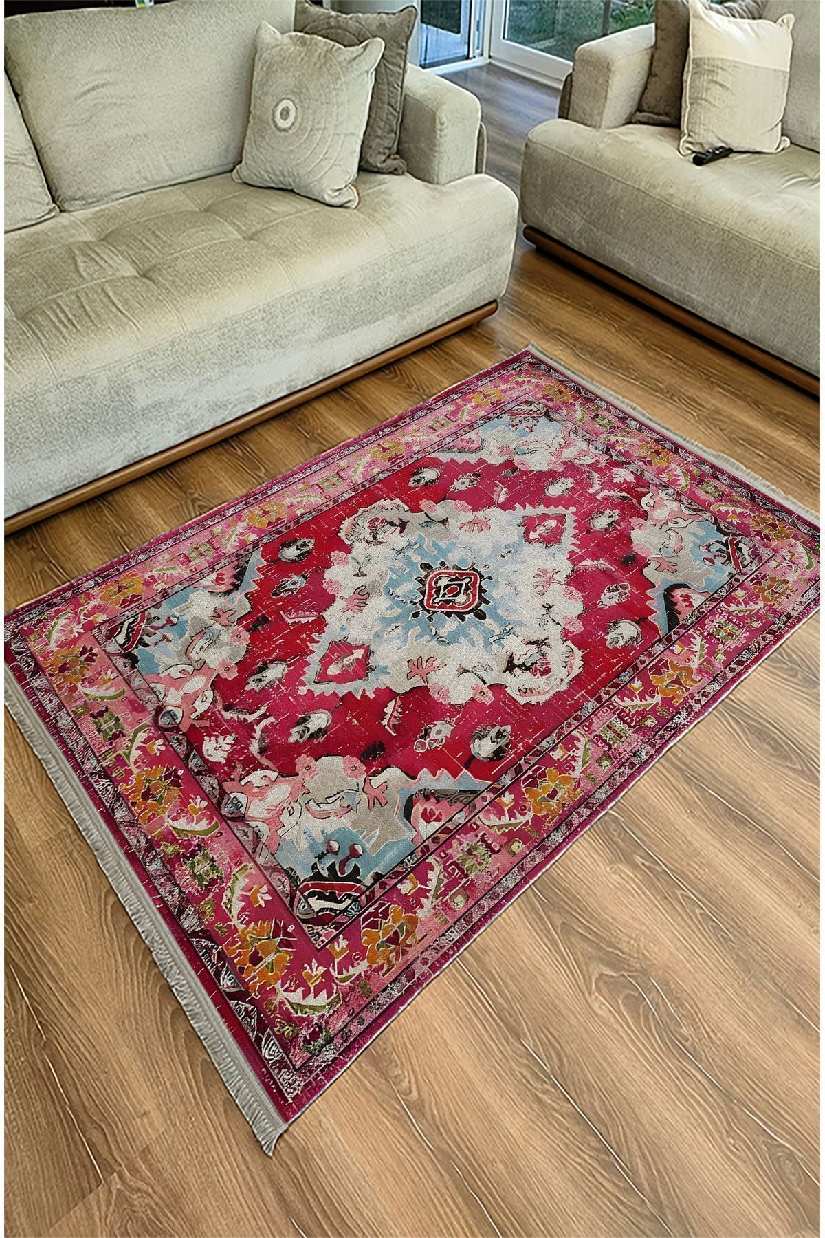 Halı Vagonu Halı98 Fuşya Tonlarında Klasık Dekoratif Halı Salon Halısı Saçaklı Yıkanabilen Halı
