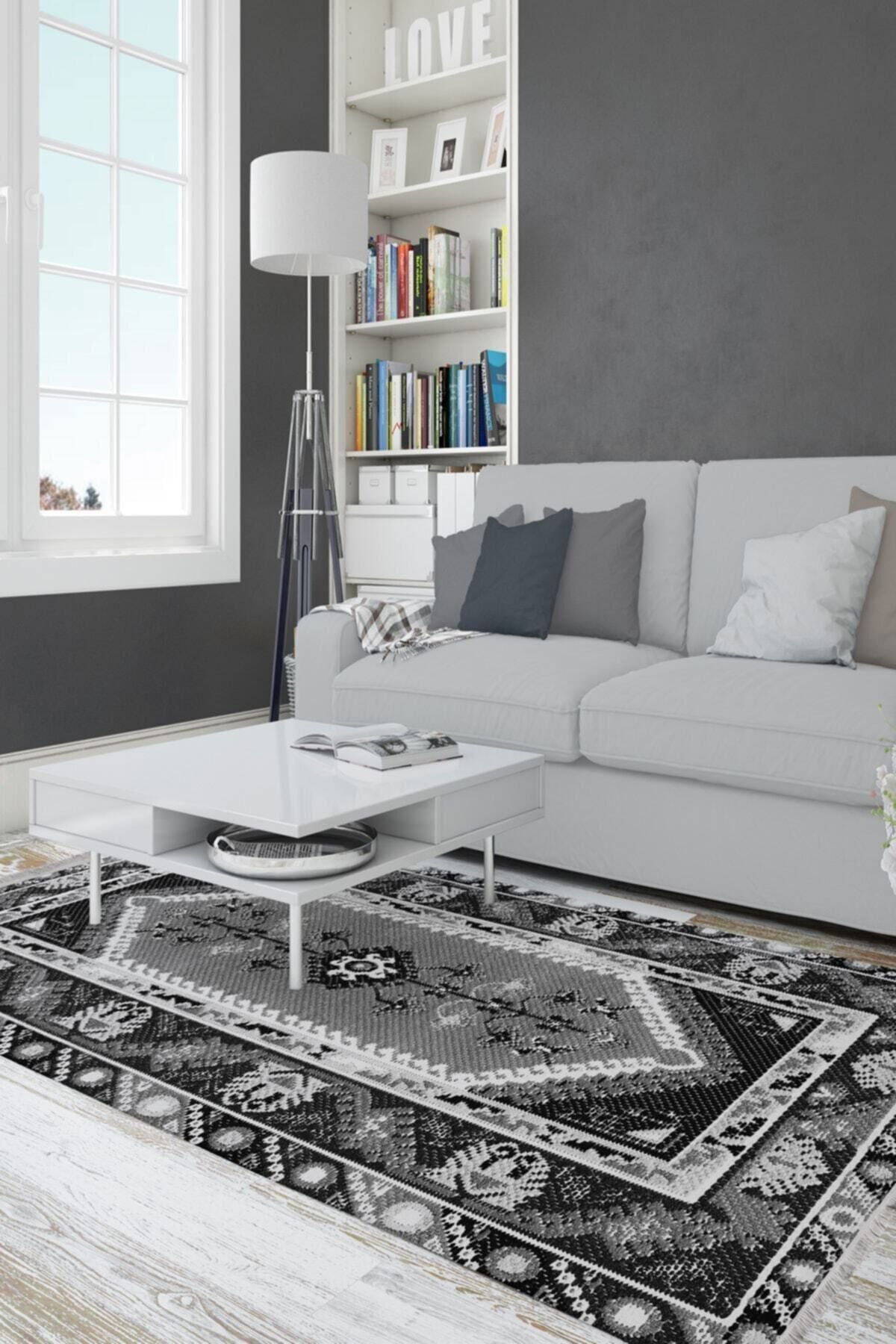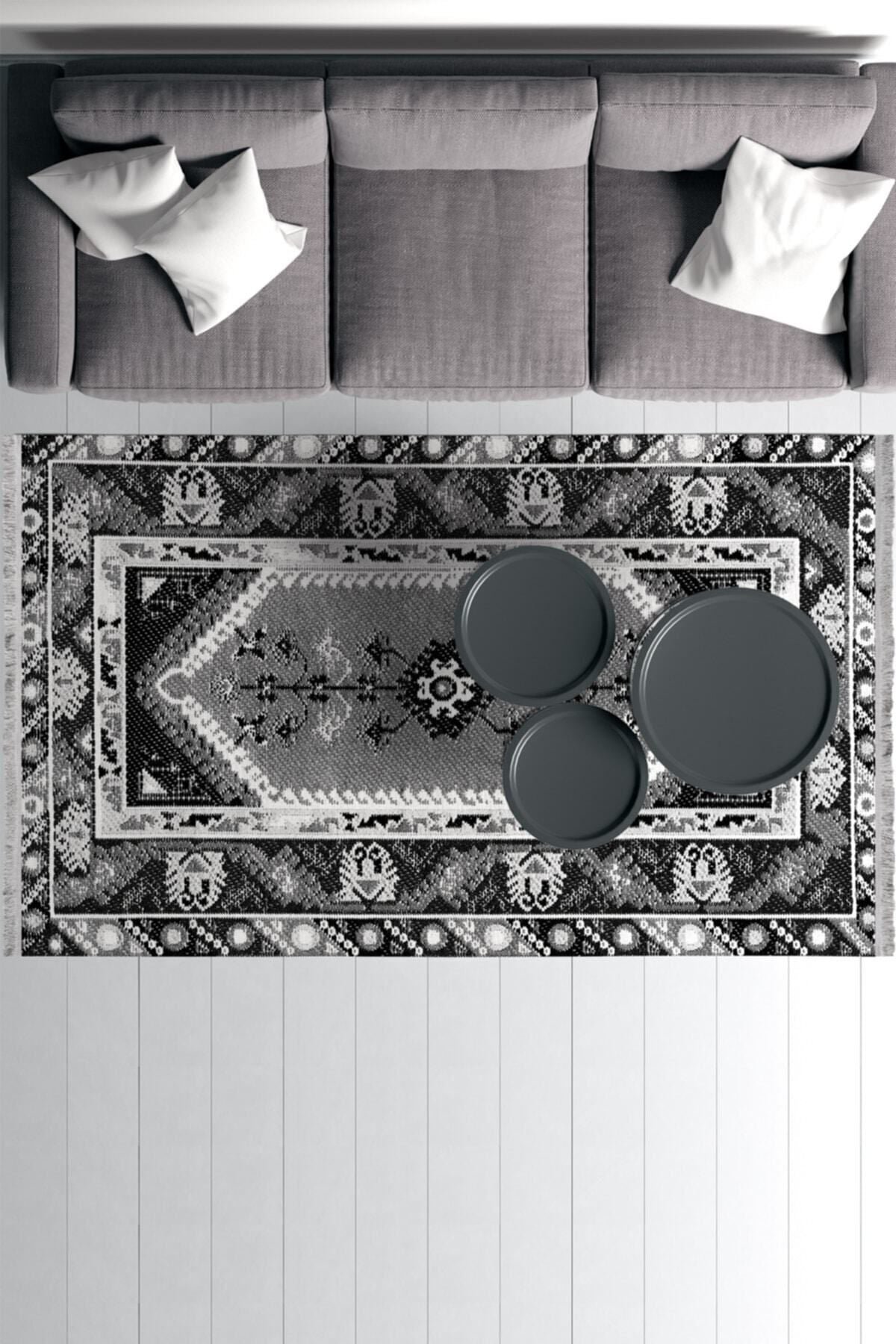 Halı Vagonu Serisi Açık Mavi Tonlarında Bordürlü Desen Kaymaz Taban Şönil Halı