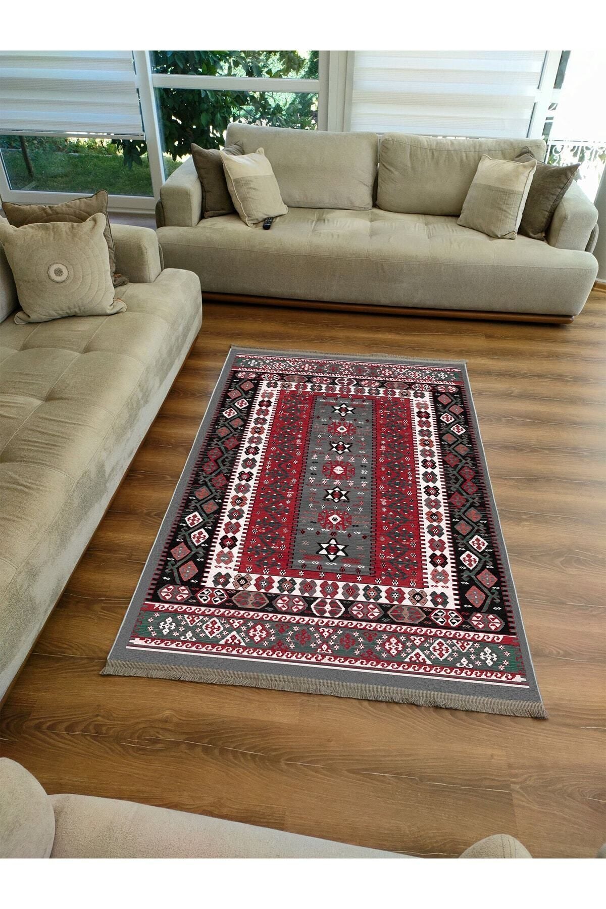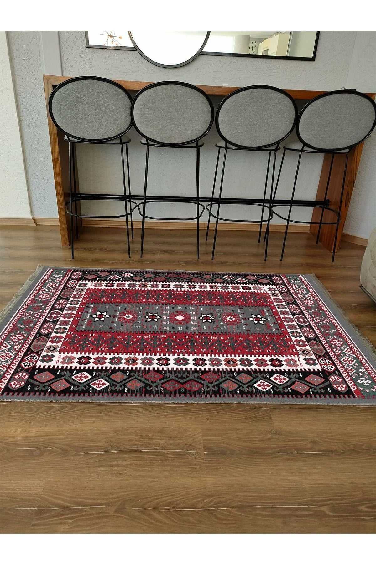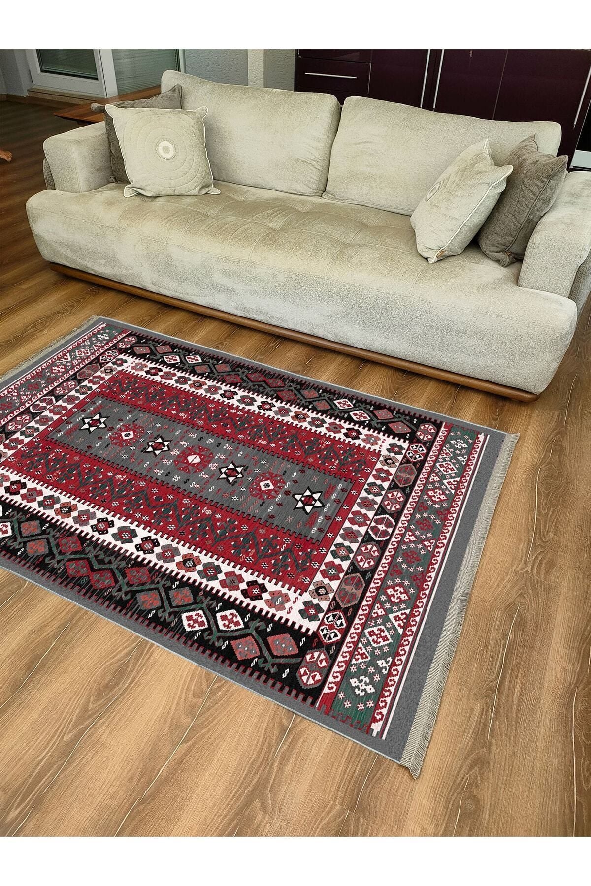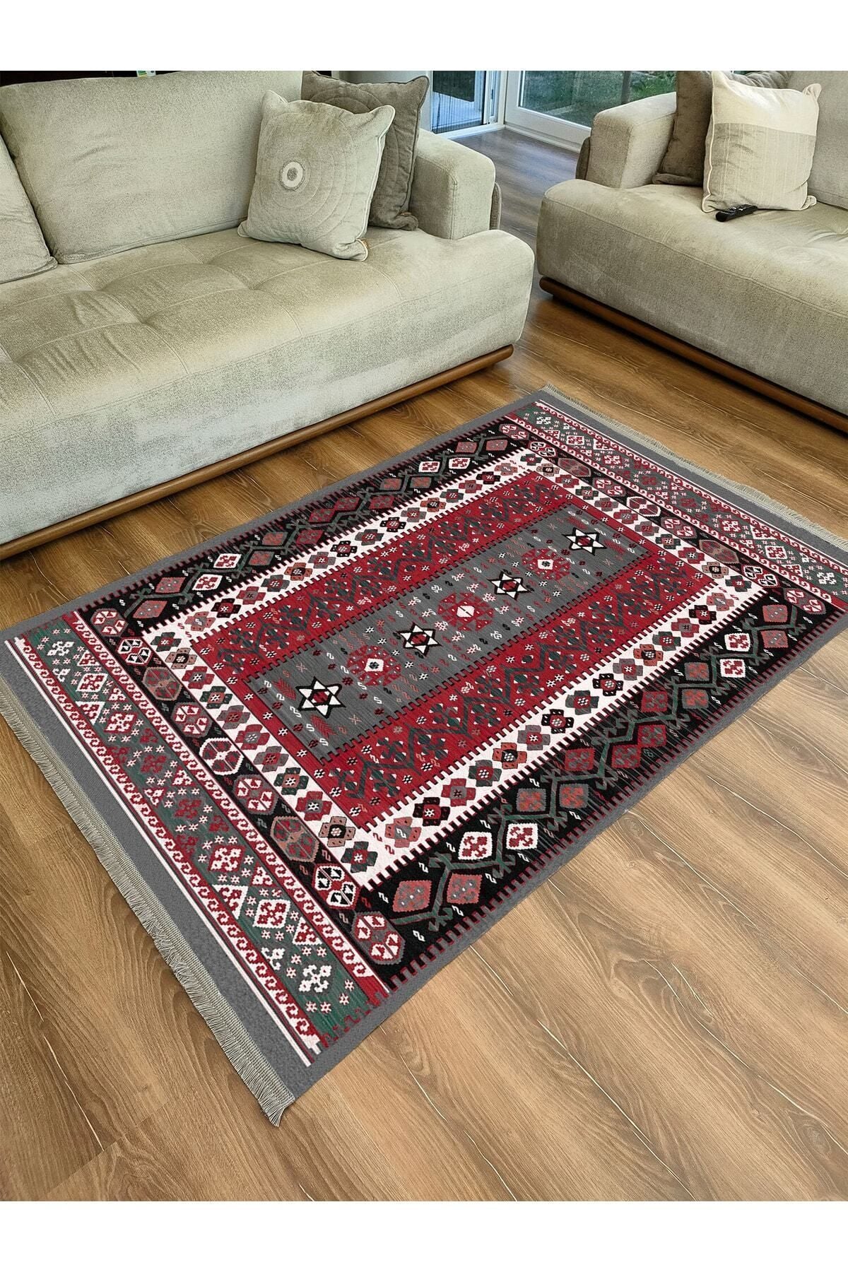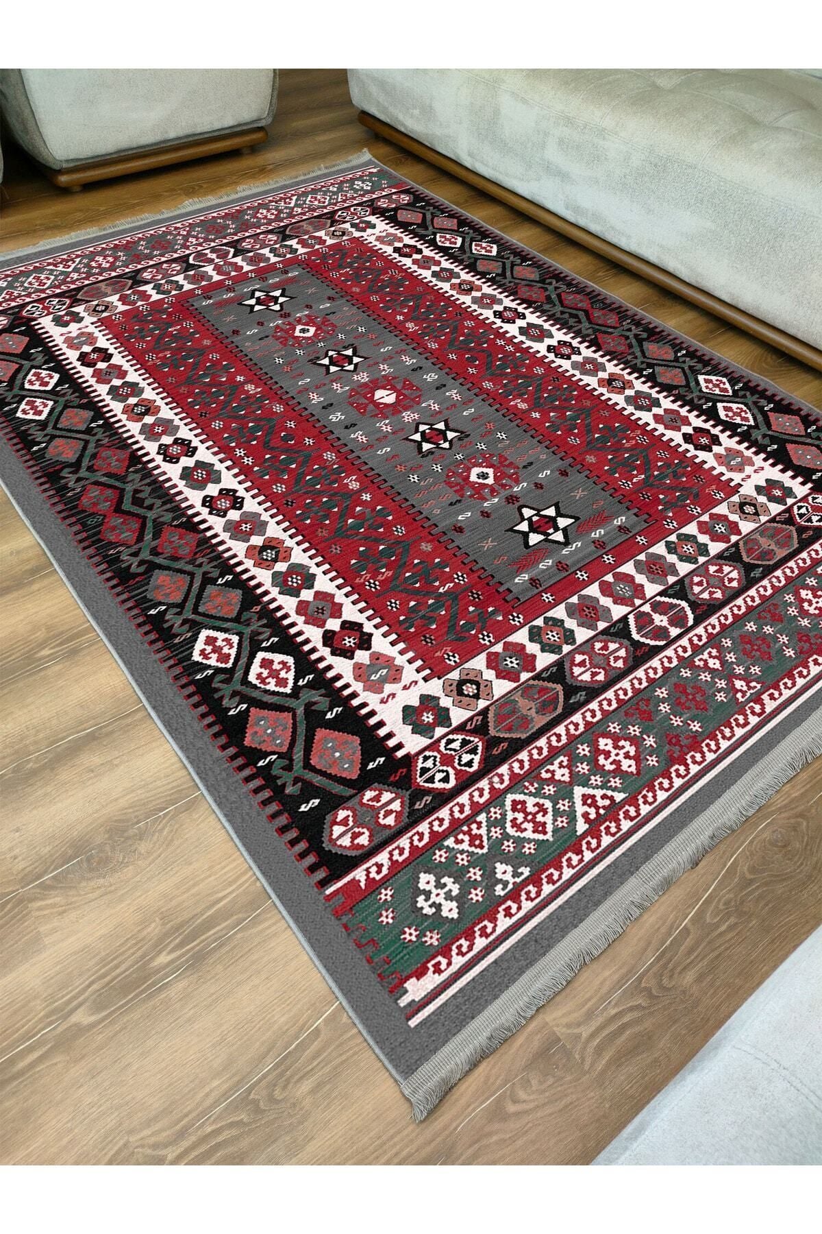 Halı Vagonu Serisi Antik Kırmızı Ve Siyah Tonlarında Otantik Desen Kaymaz Taban Şönil Halı