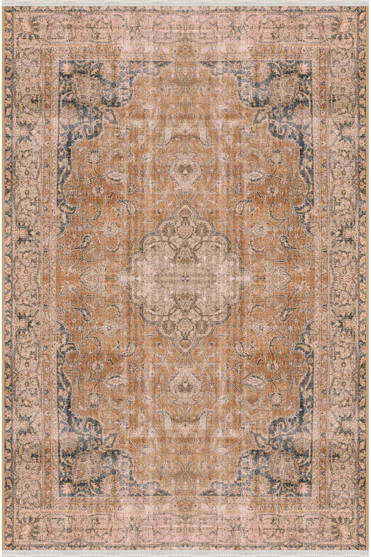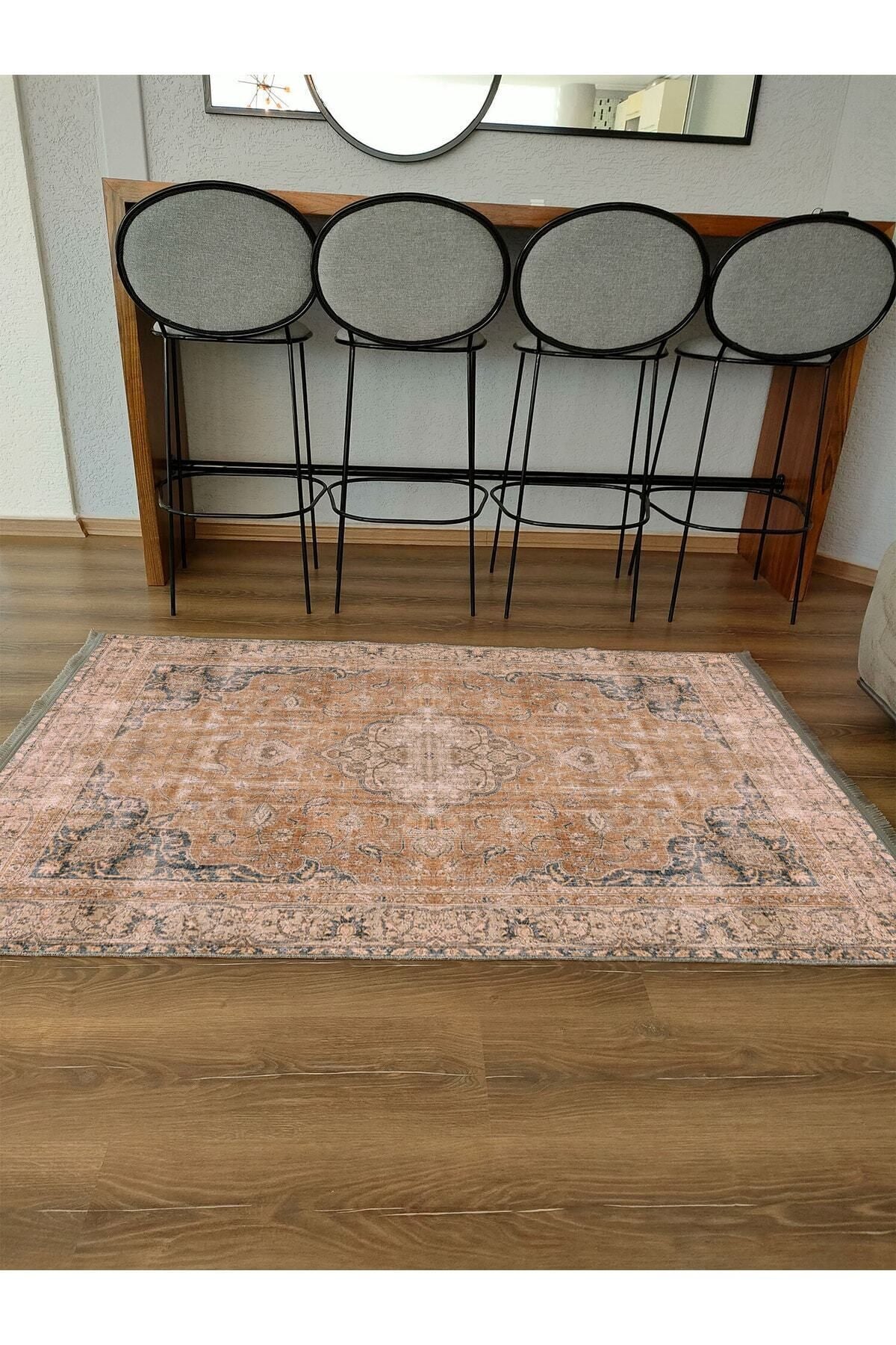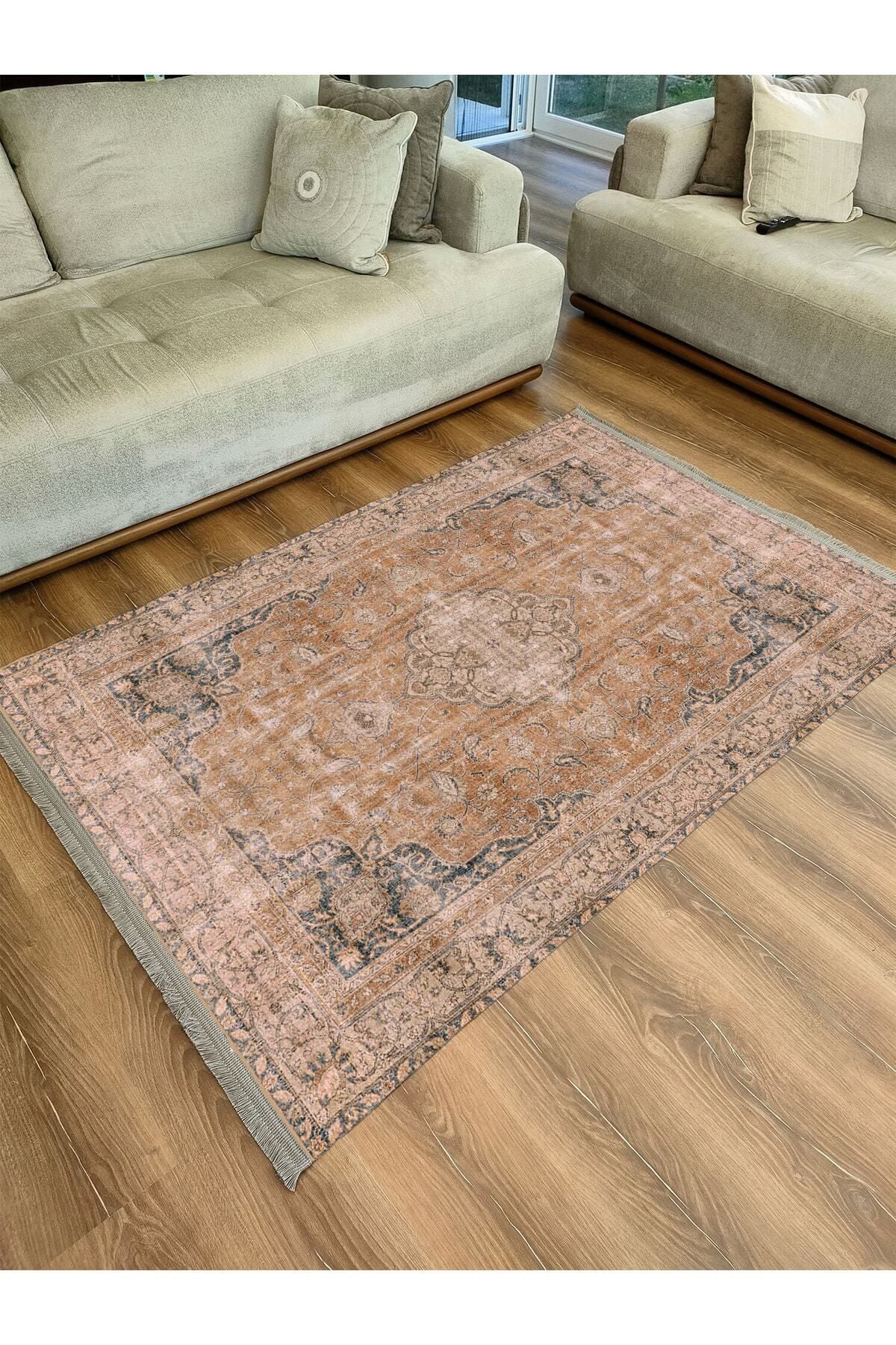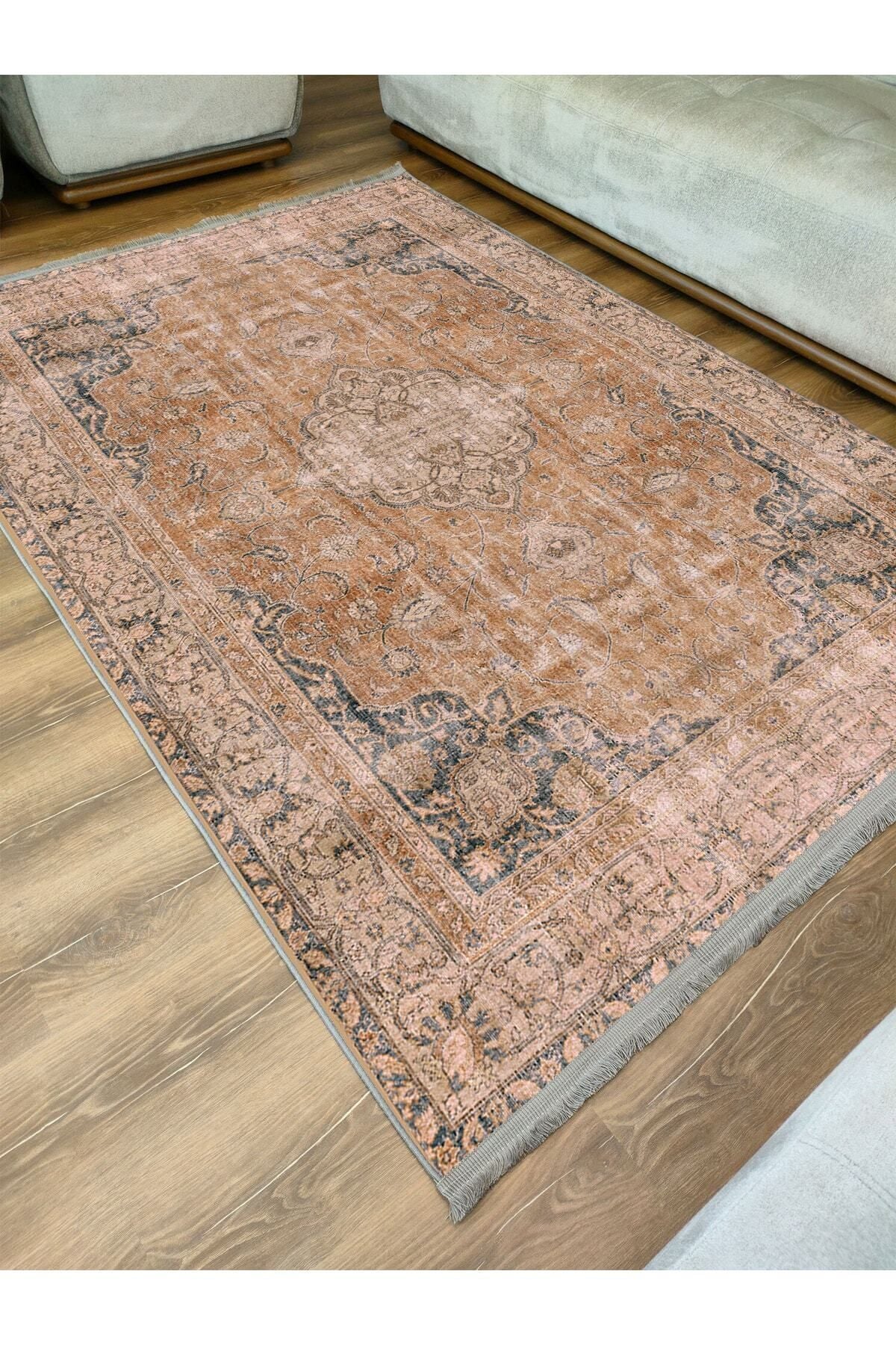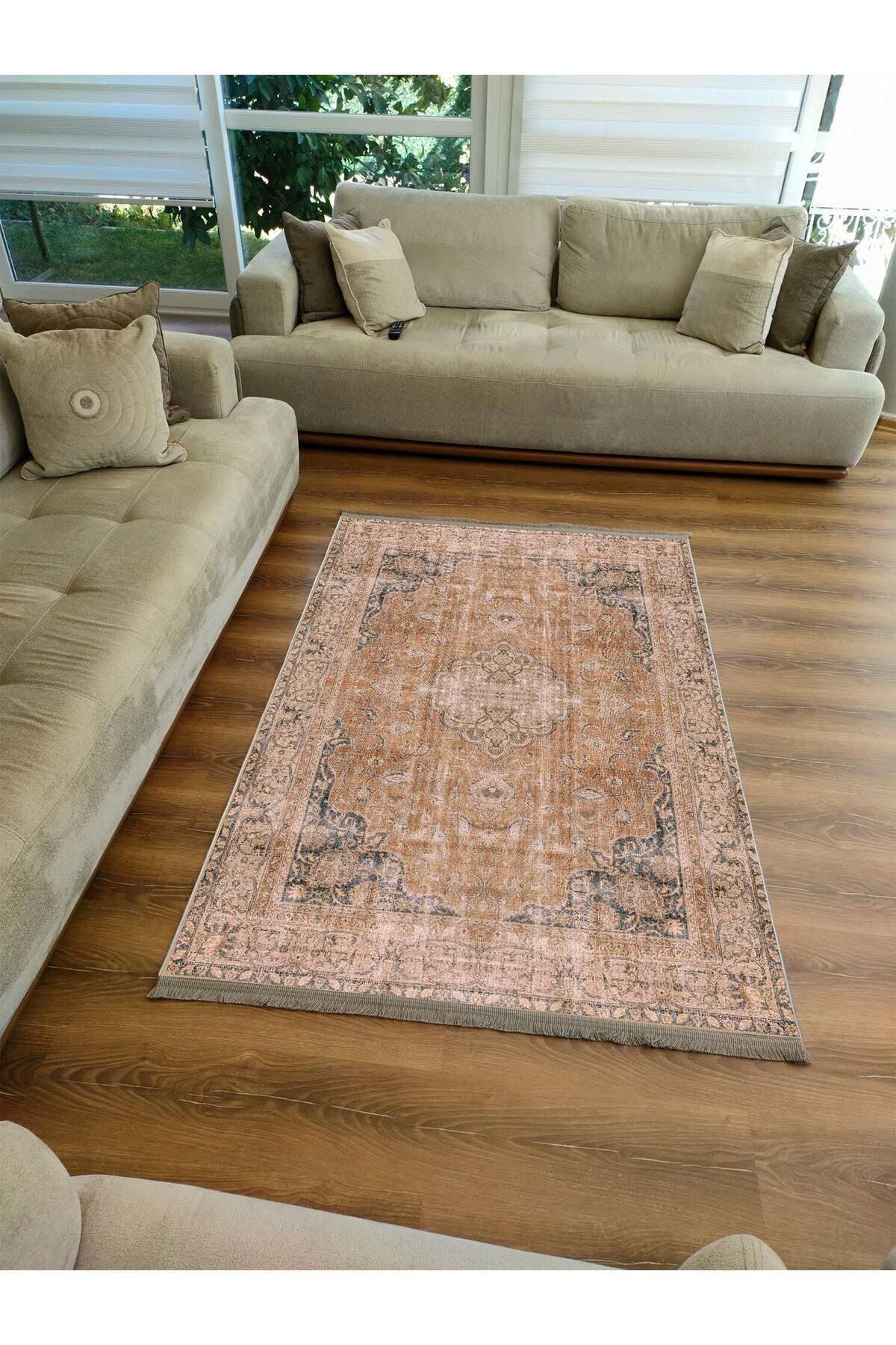 Halı Vagonu Serisi Hardal Eskitme Antika Desen Kaymaz Taban Şönil Halı