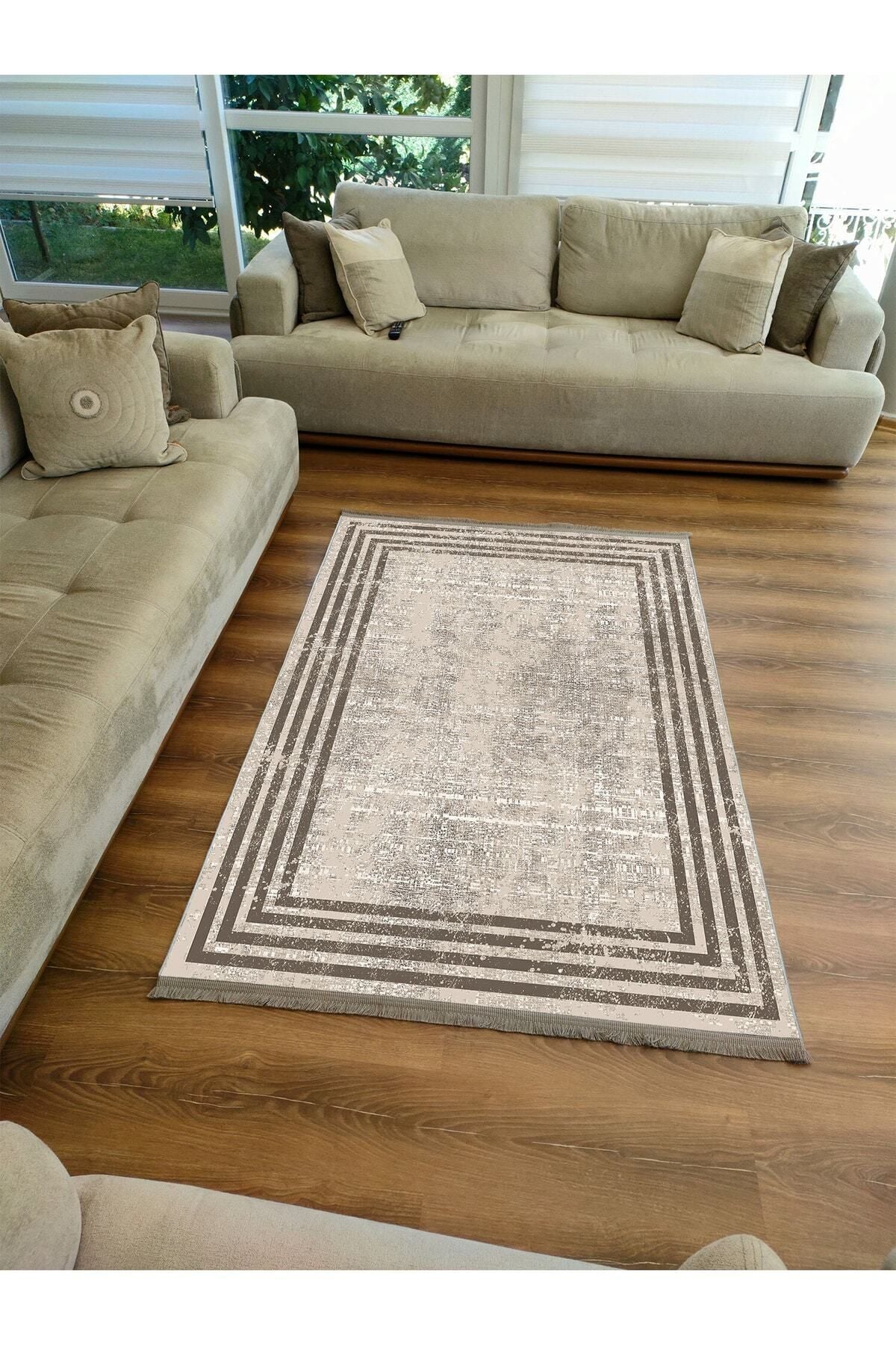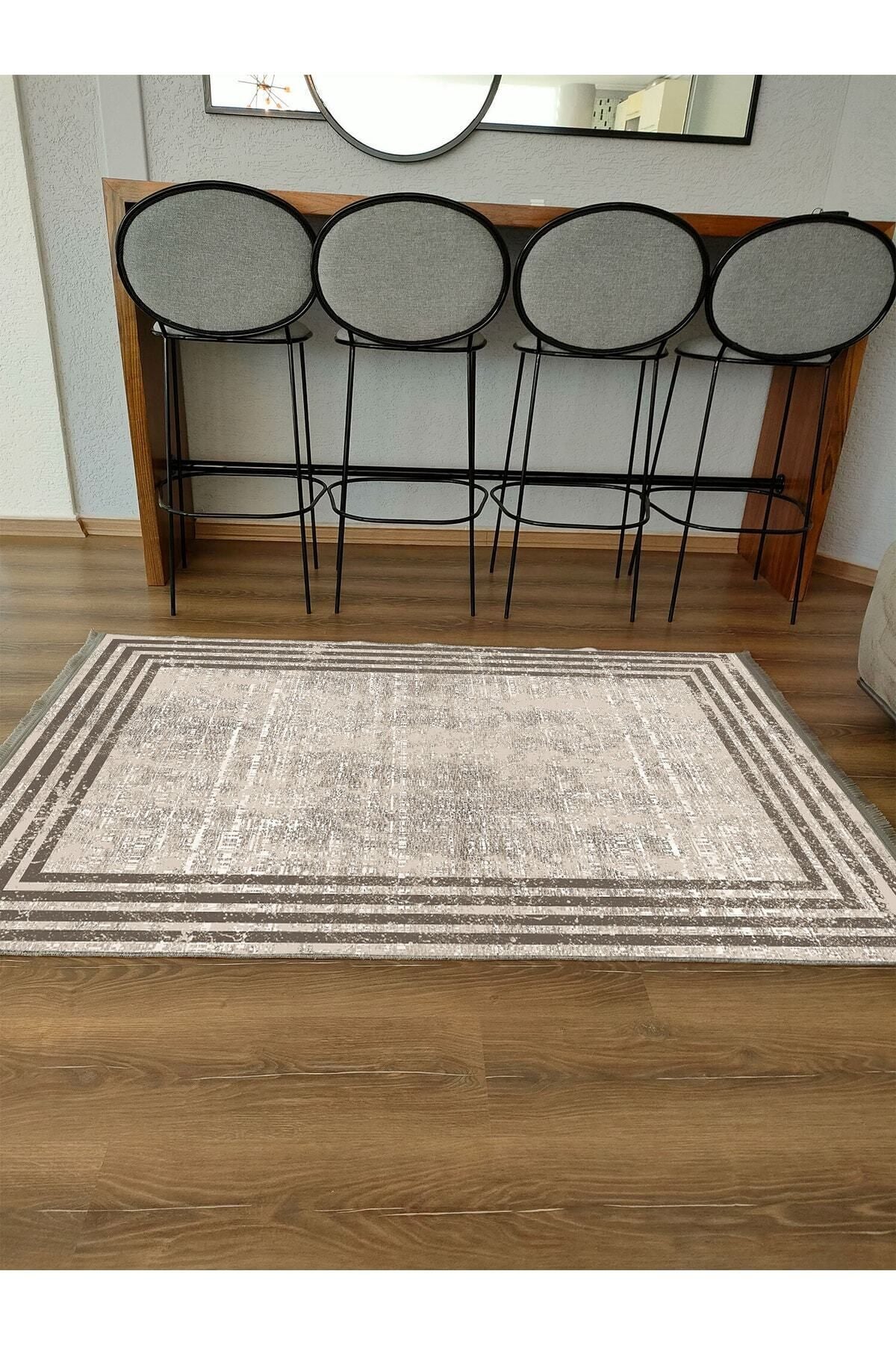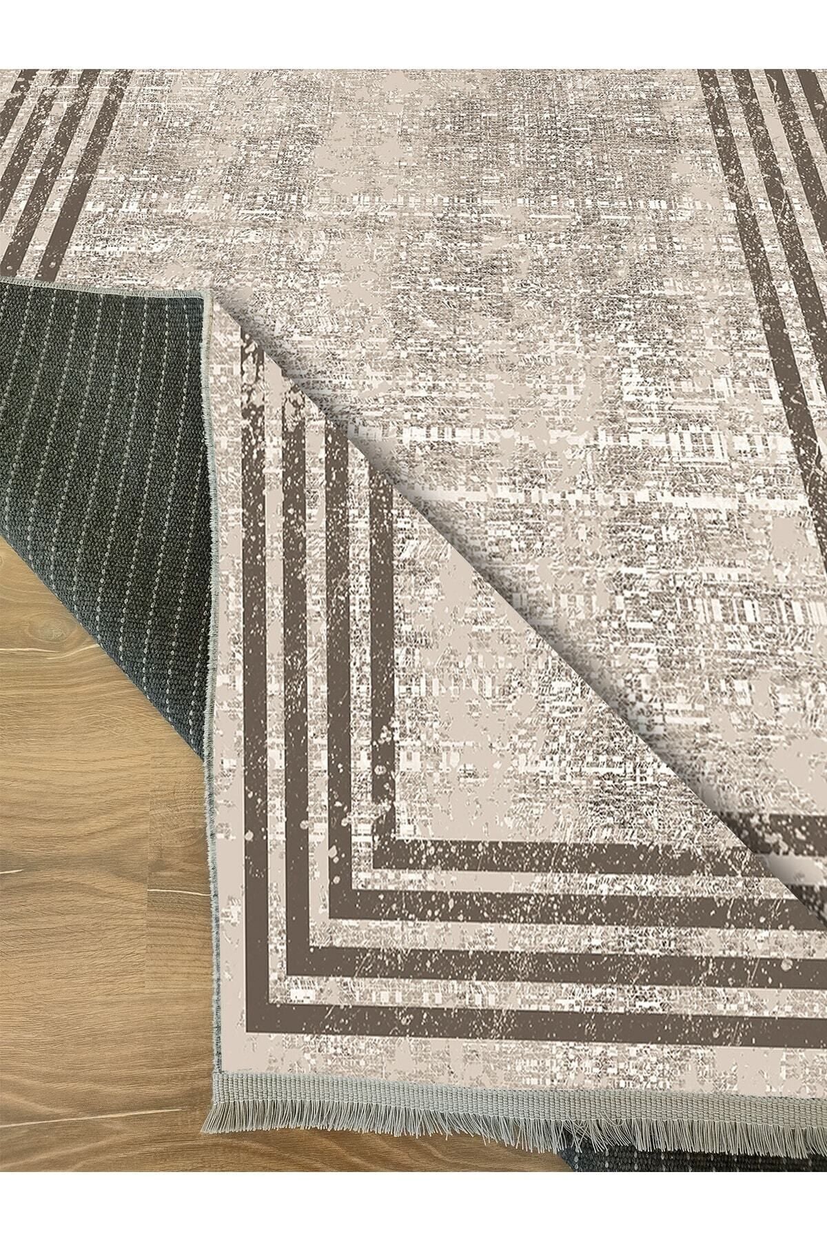 Halı Vagonu Serisi Kahve Tonlarında Çizgili Etnik Desen Kaymaz Taban Şönil Halı