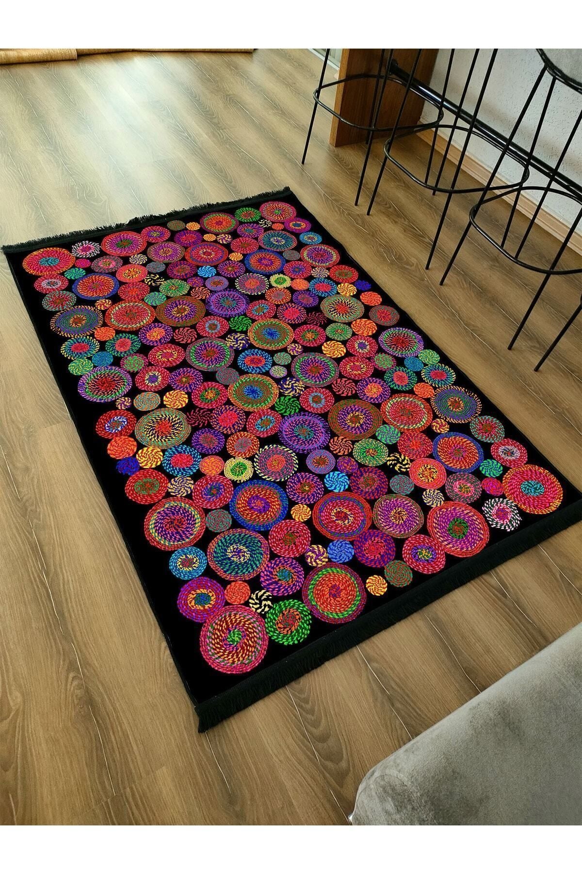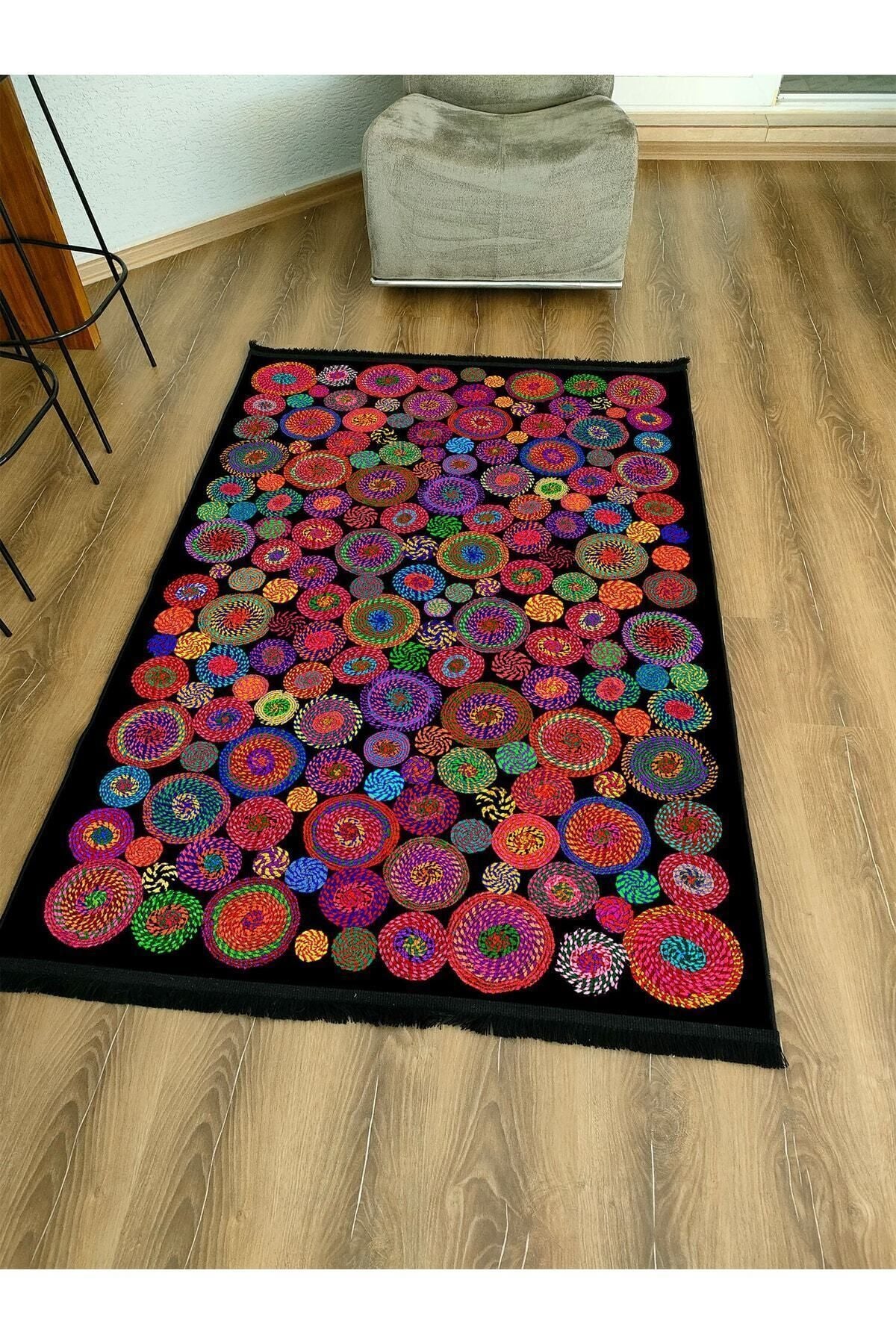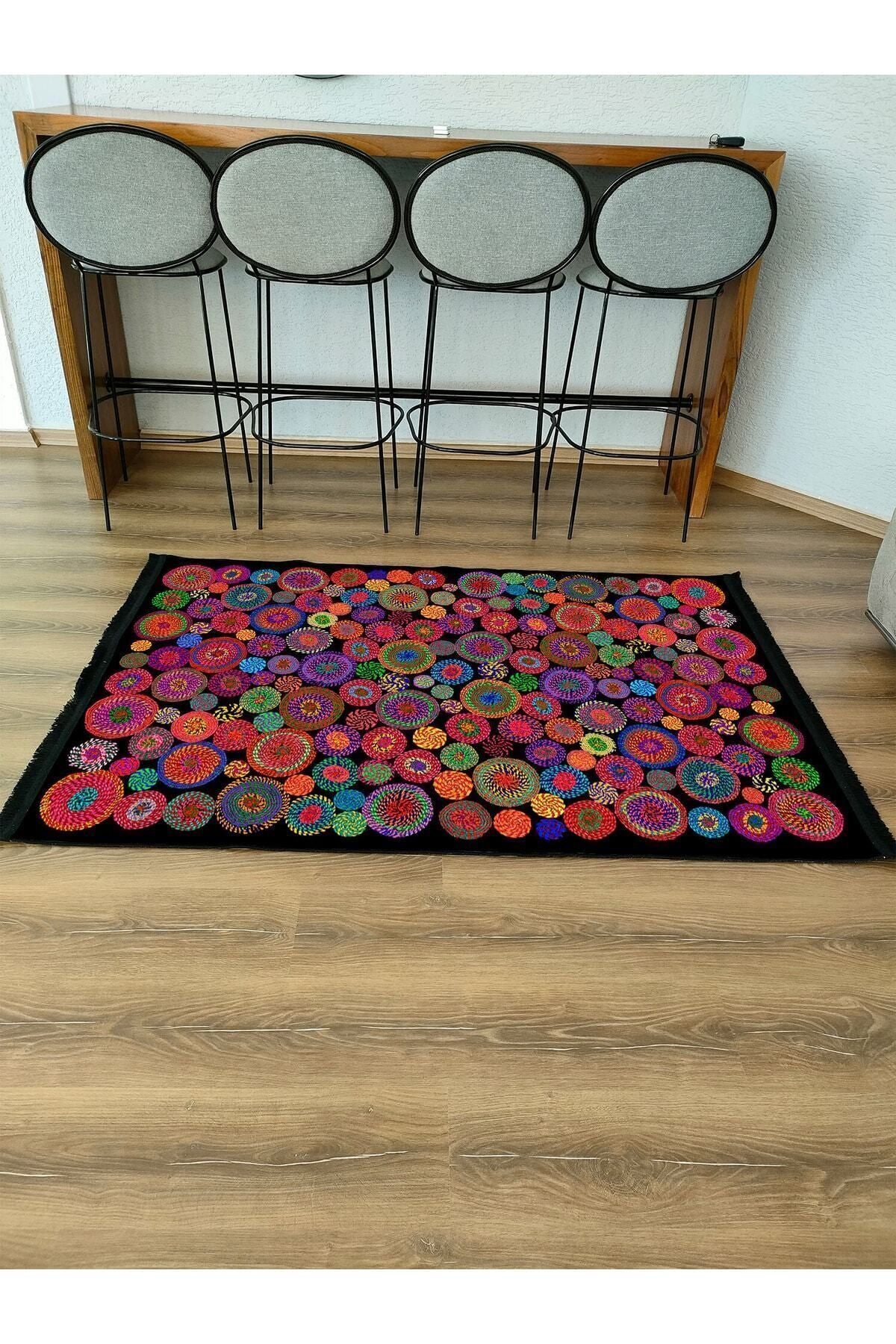 Halı Vagonu Serisi Siyah Rengin Üzerinde Multy Tonlarında Çiçekli Desen Kaymaz Taban Şönil Halı