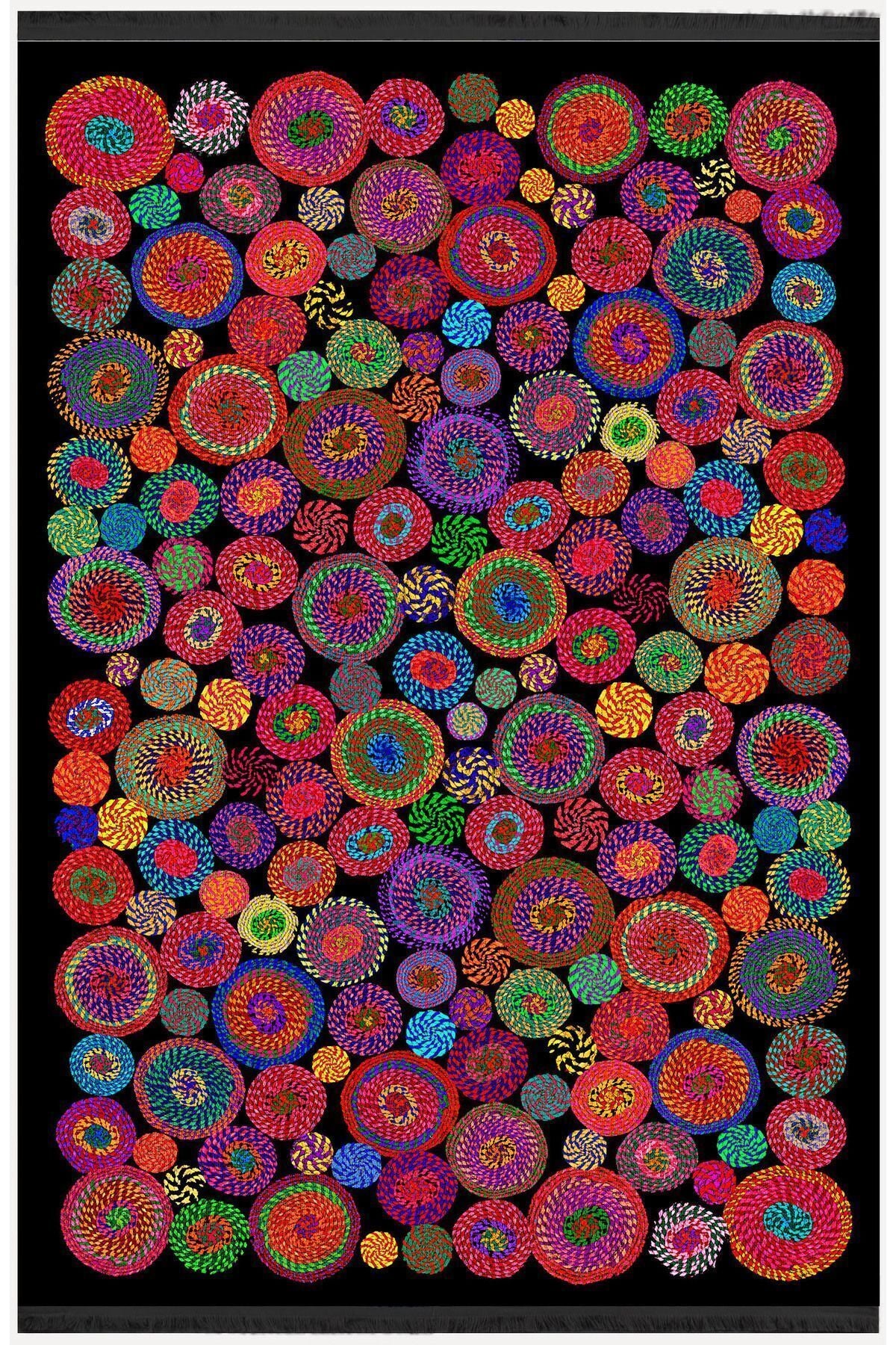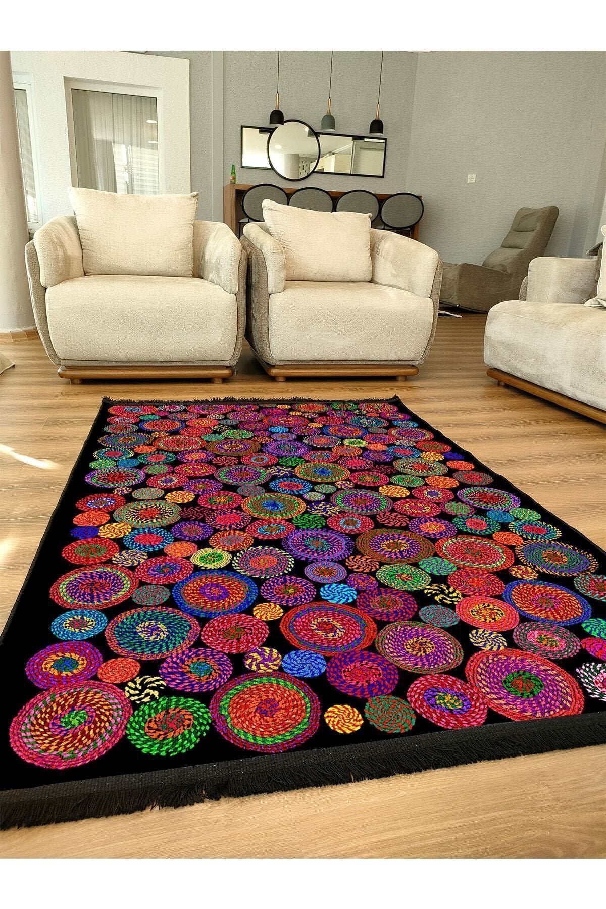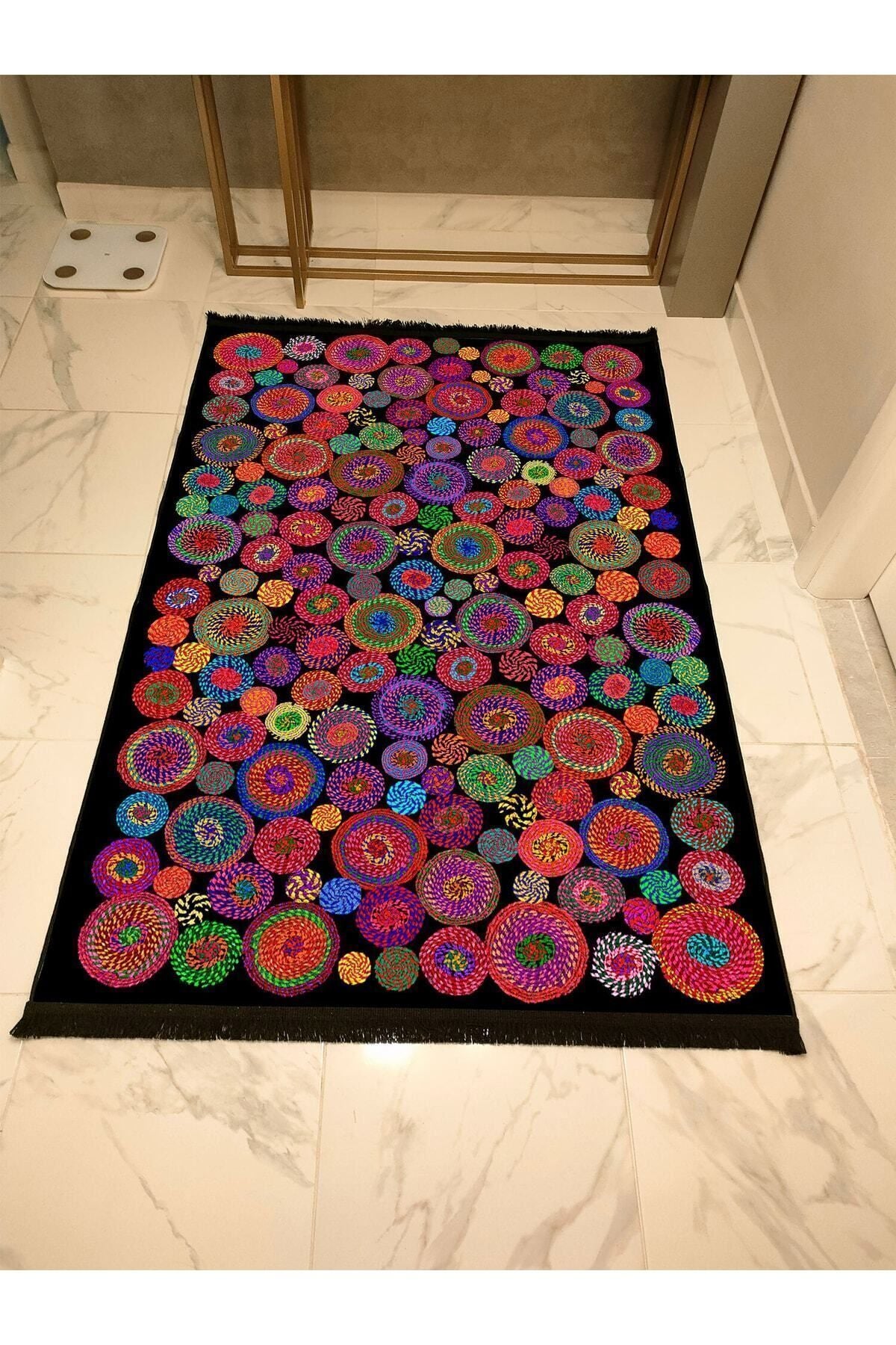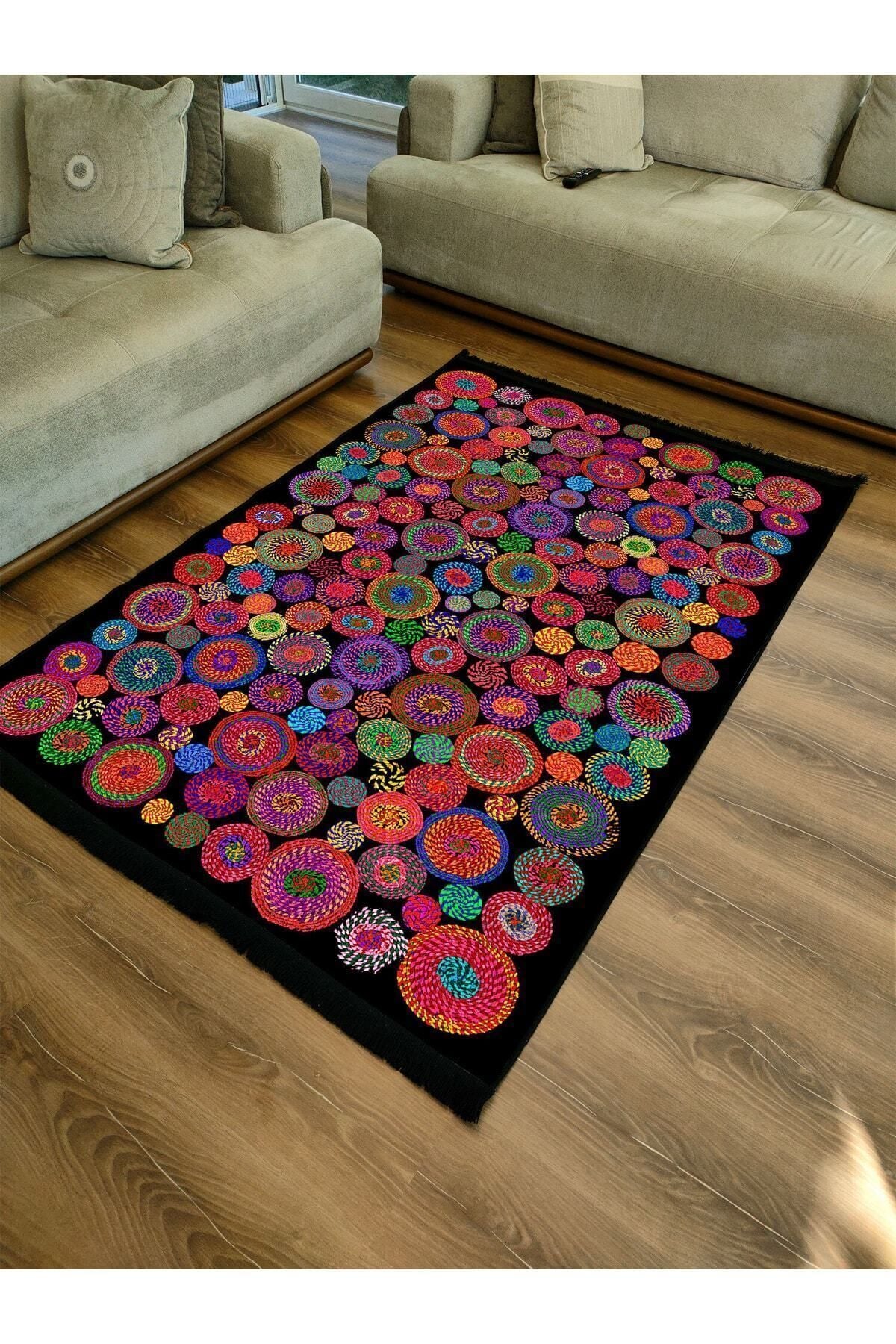 Halı Vagonu Serisi Siyah Rengin Üzerinde Multy Tonlarında Çiçekli Desen Kaymaz Taban Şönil Halı