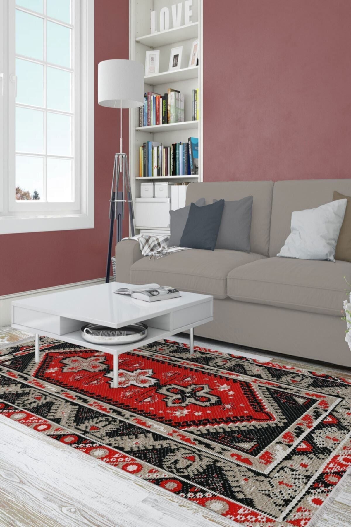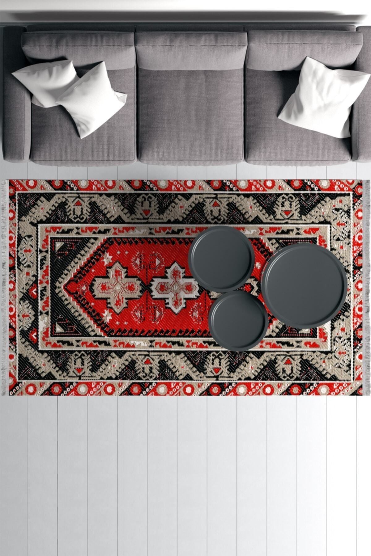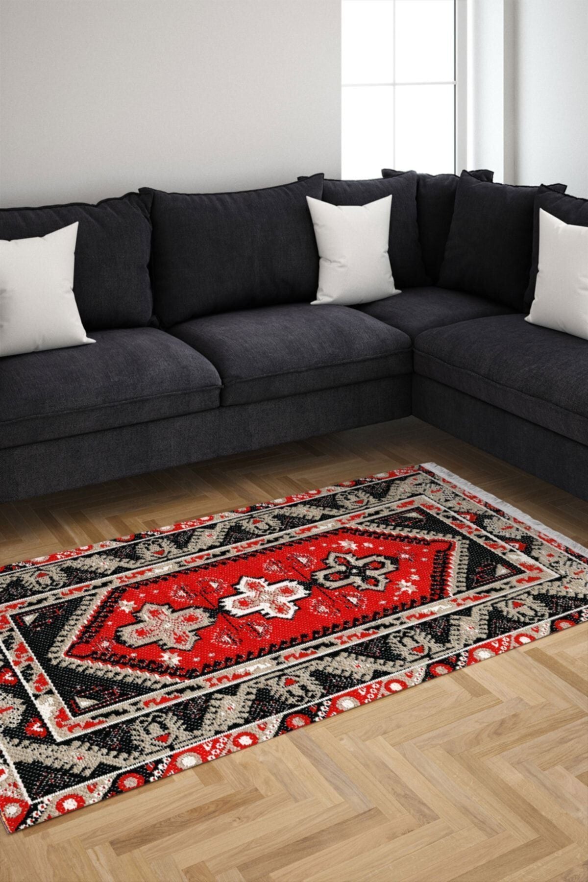 Halı Vagonu Serisi Siyah Tonlarında Bordürlü Desen Kaymaz Taban Şönil Halı