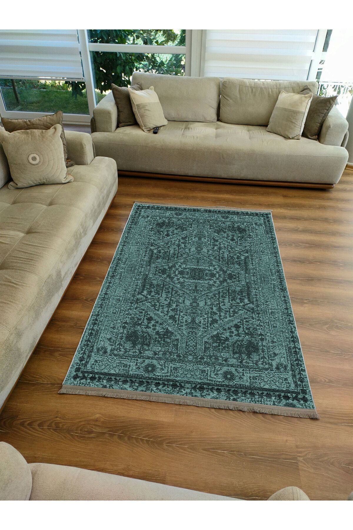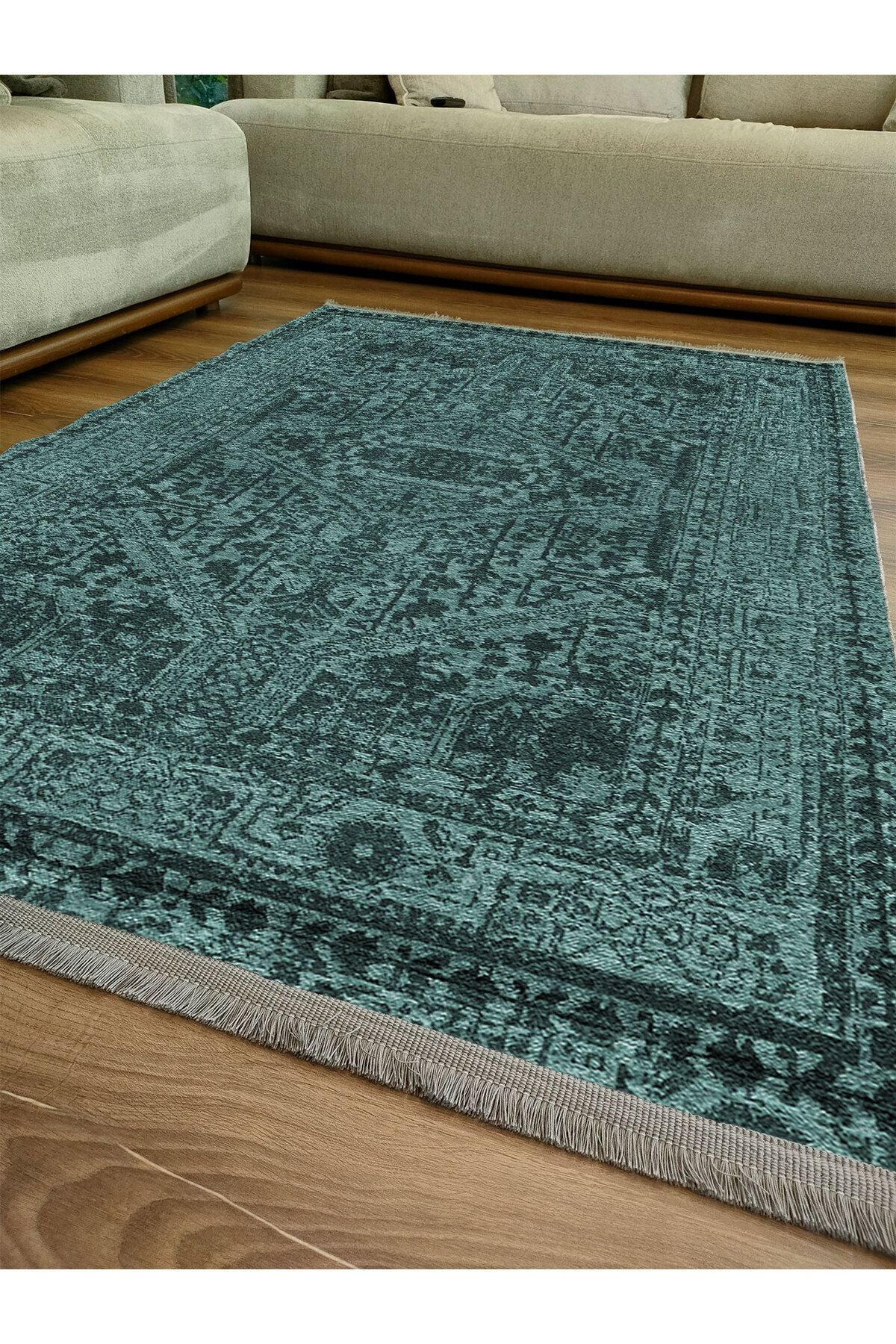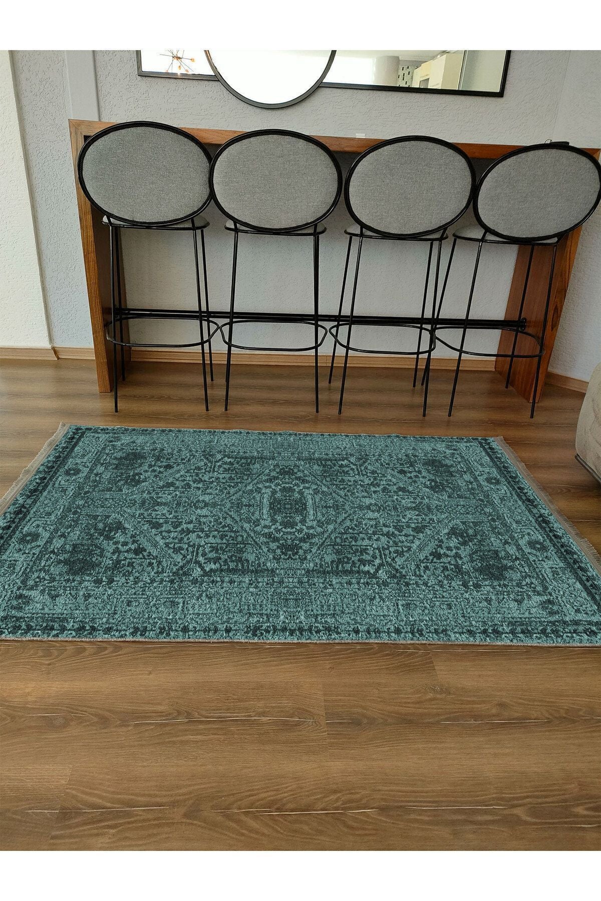 Halı Vagonu Serisi Su Yeşili Etnik Otantik Eskitme Desen Kaymaz Taban Şönil Halı
