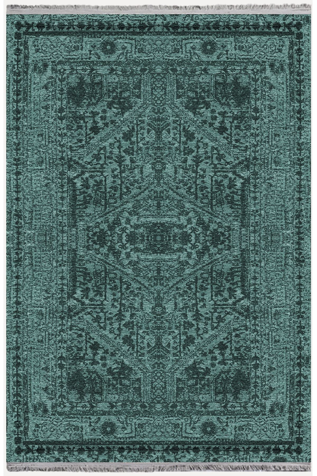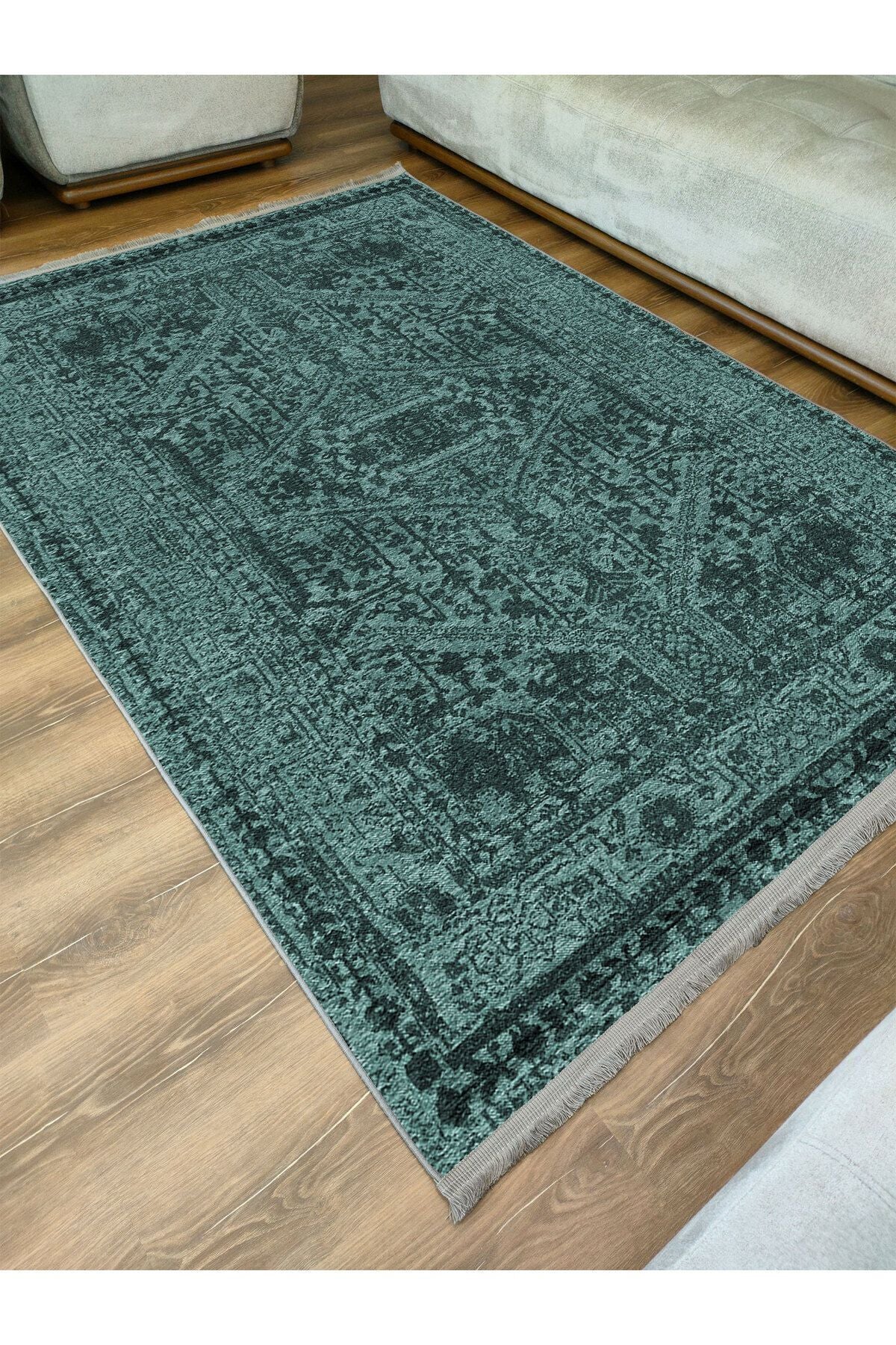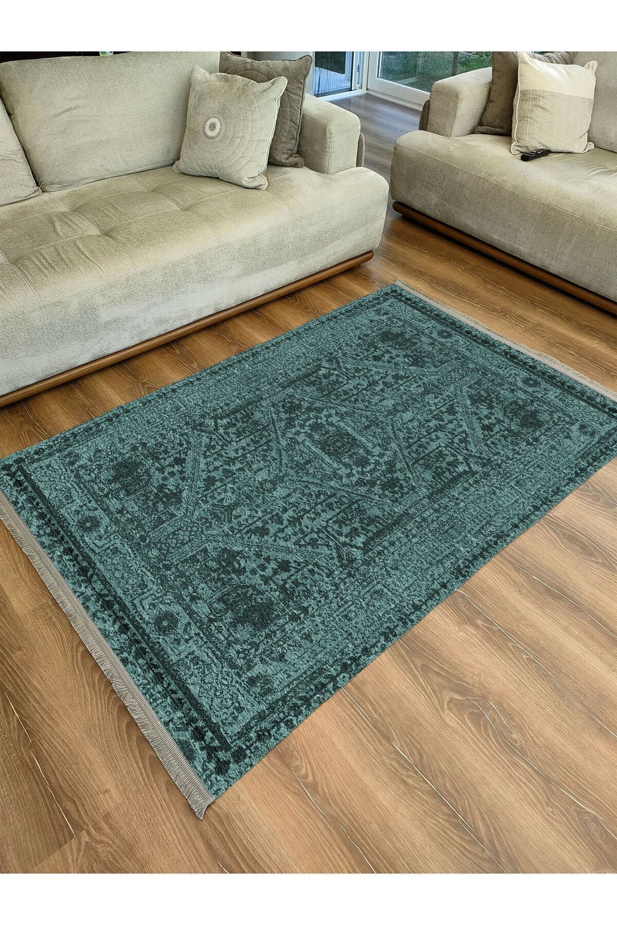 Halı Vagonu Serisi Su Yeşili Etnik Otantik Eskitme Desen Kaymaz Taban Şönil Halı