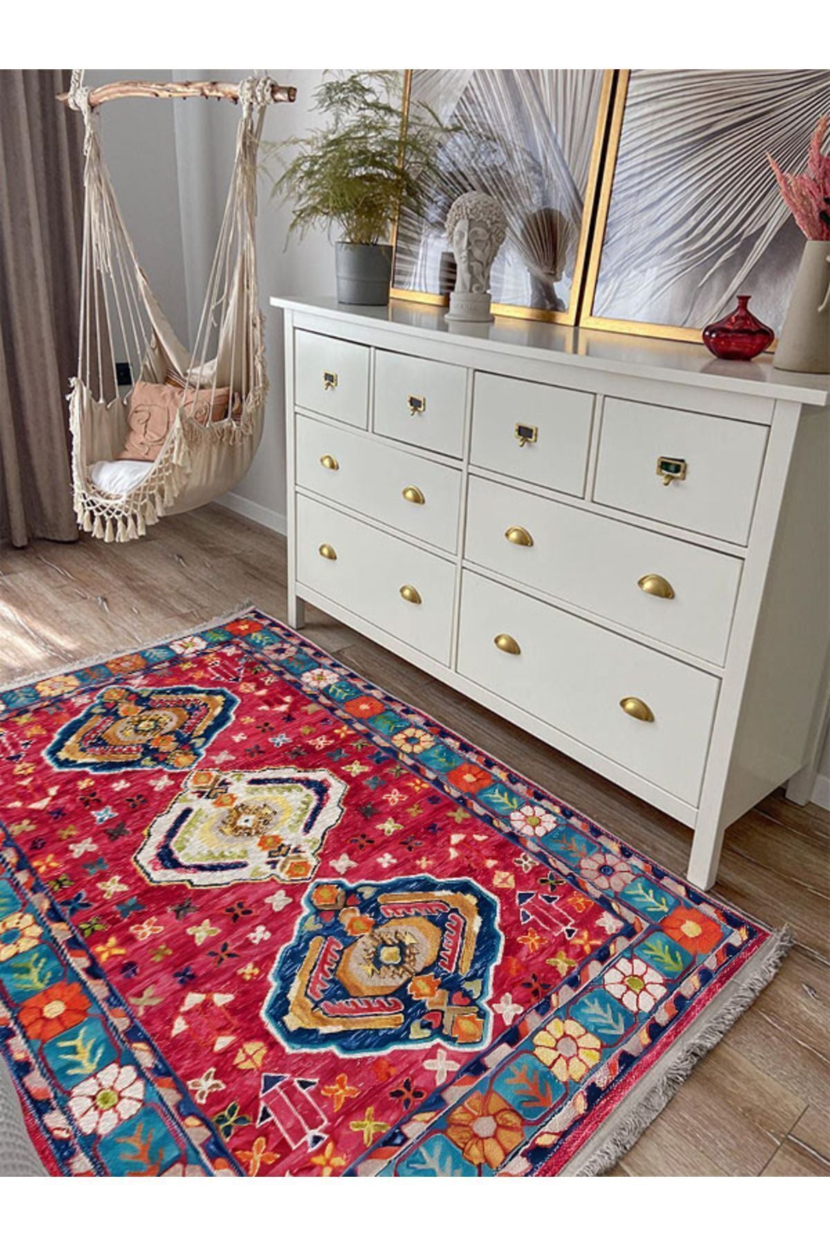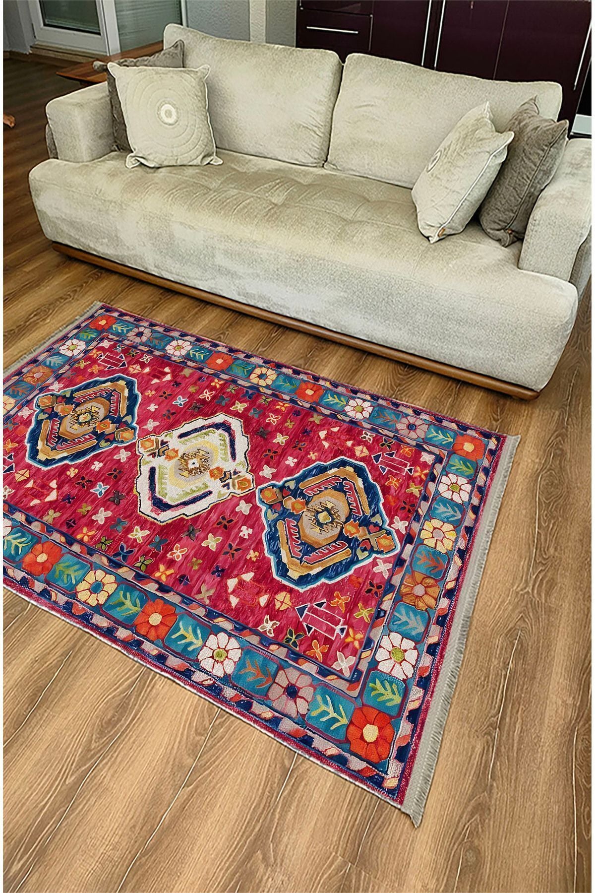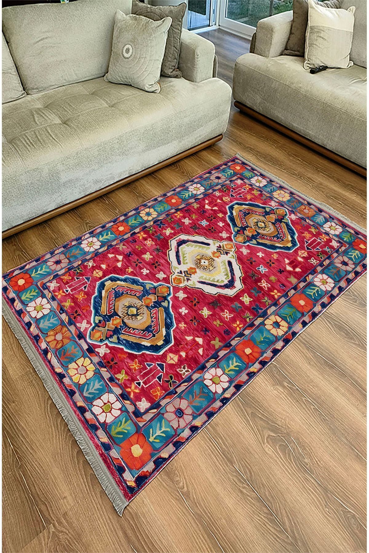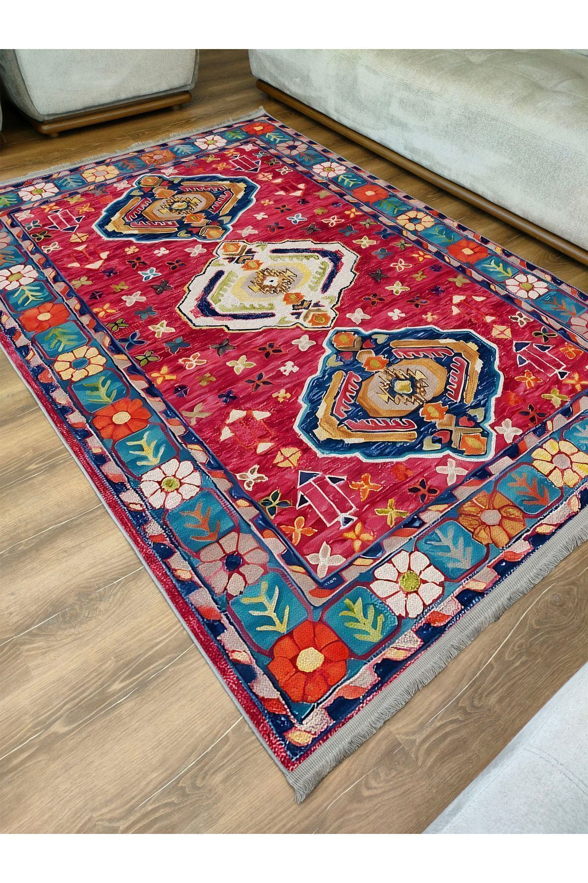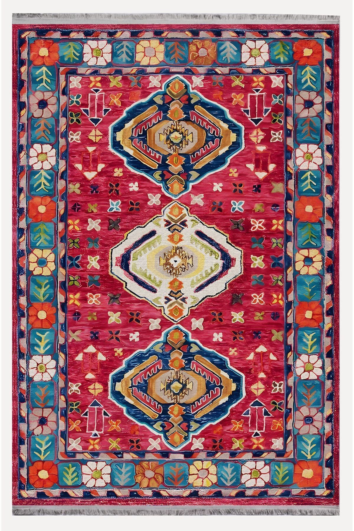 Halı Vagonu111 Etnik Anadolu Halısı Dekoratif Salon Halısı Saçaklı Yıkanabilen Halı