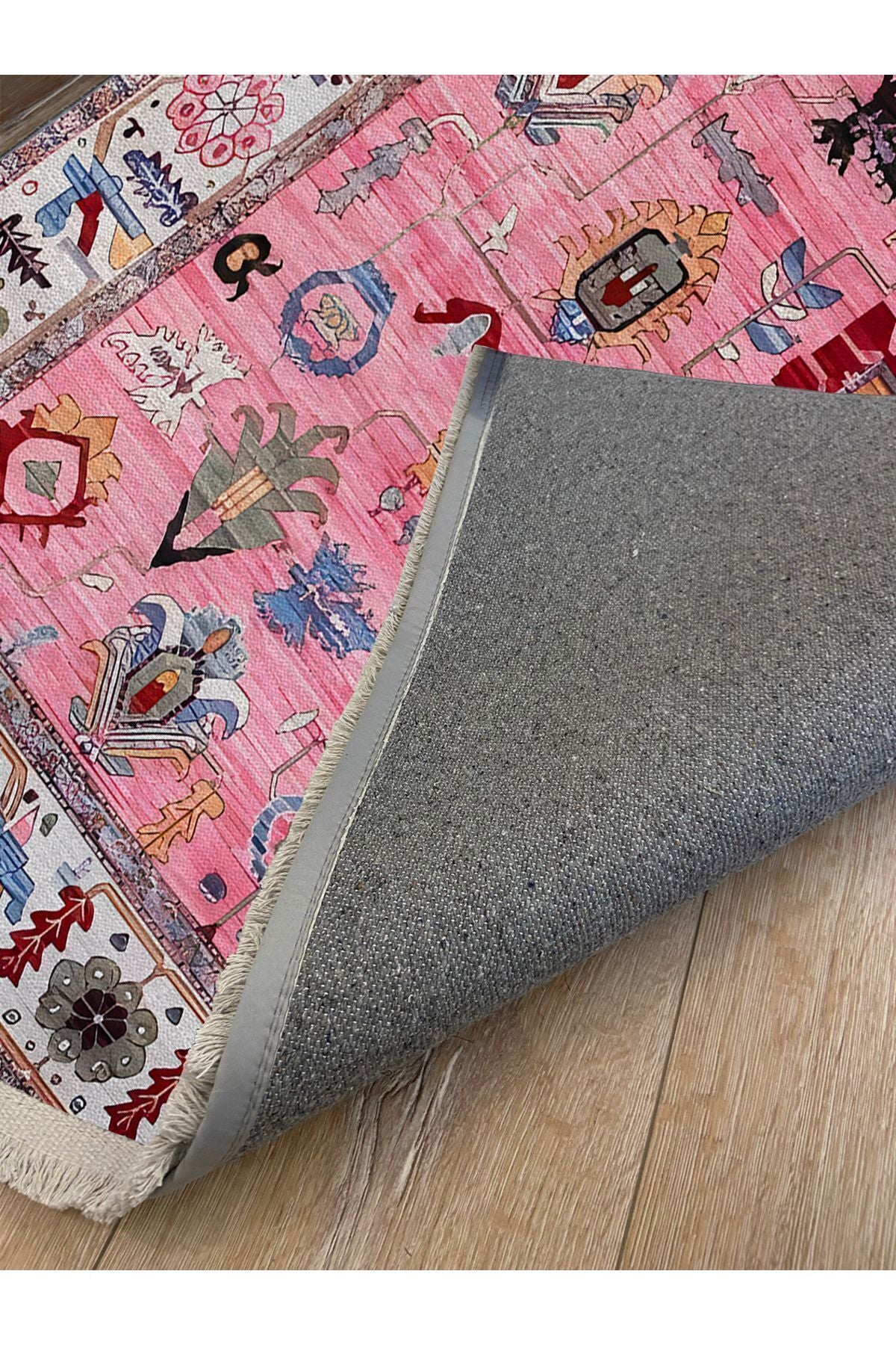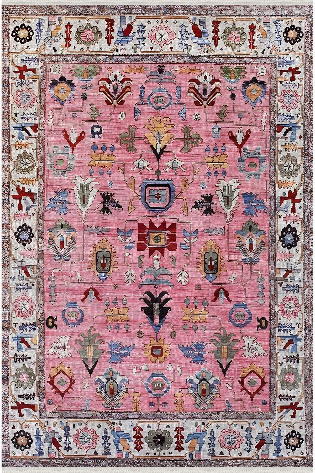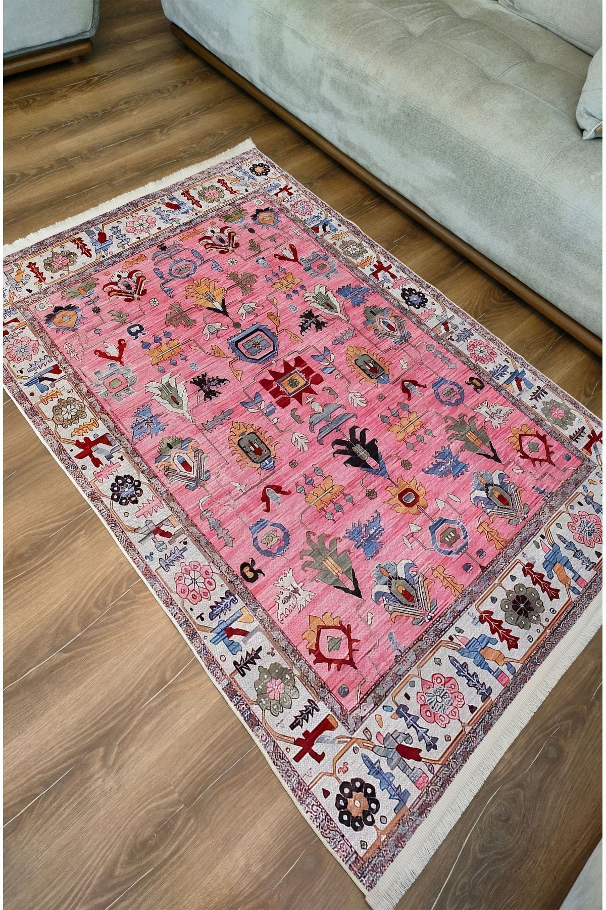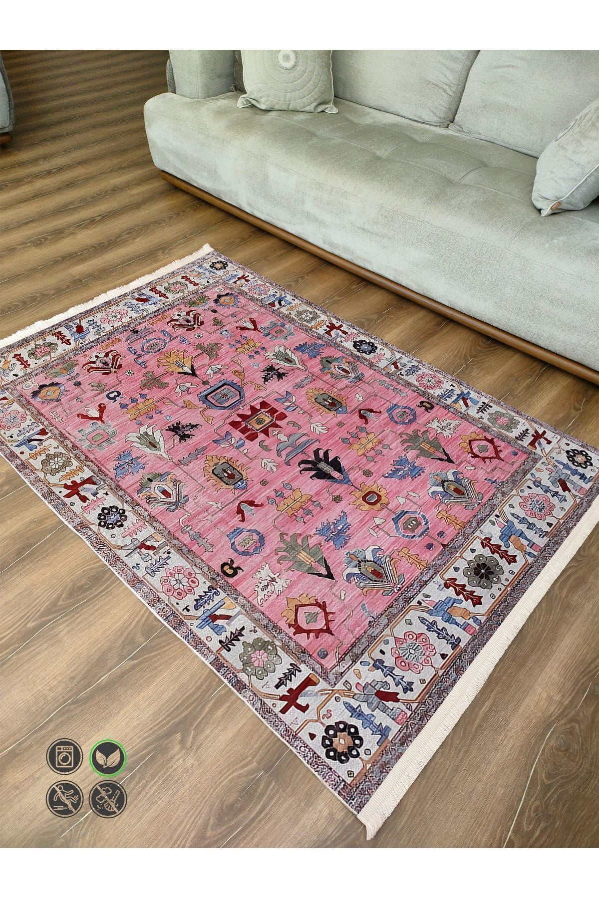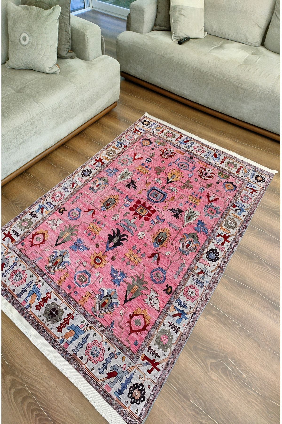 Halı Vagonu71 Fuşya Tonlarında Dekoratif Salon Halısı Klasik Halı Saçaklı Yıkanabilen Halı