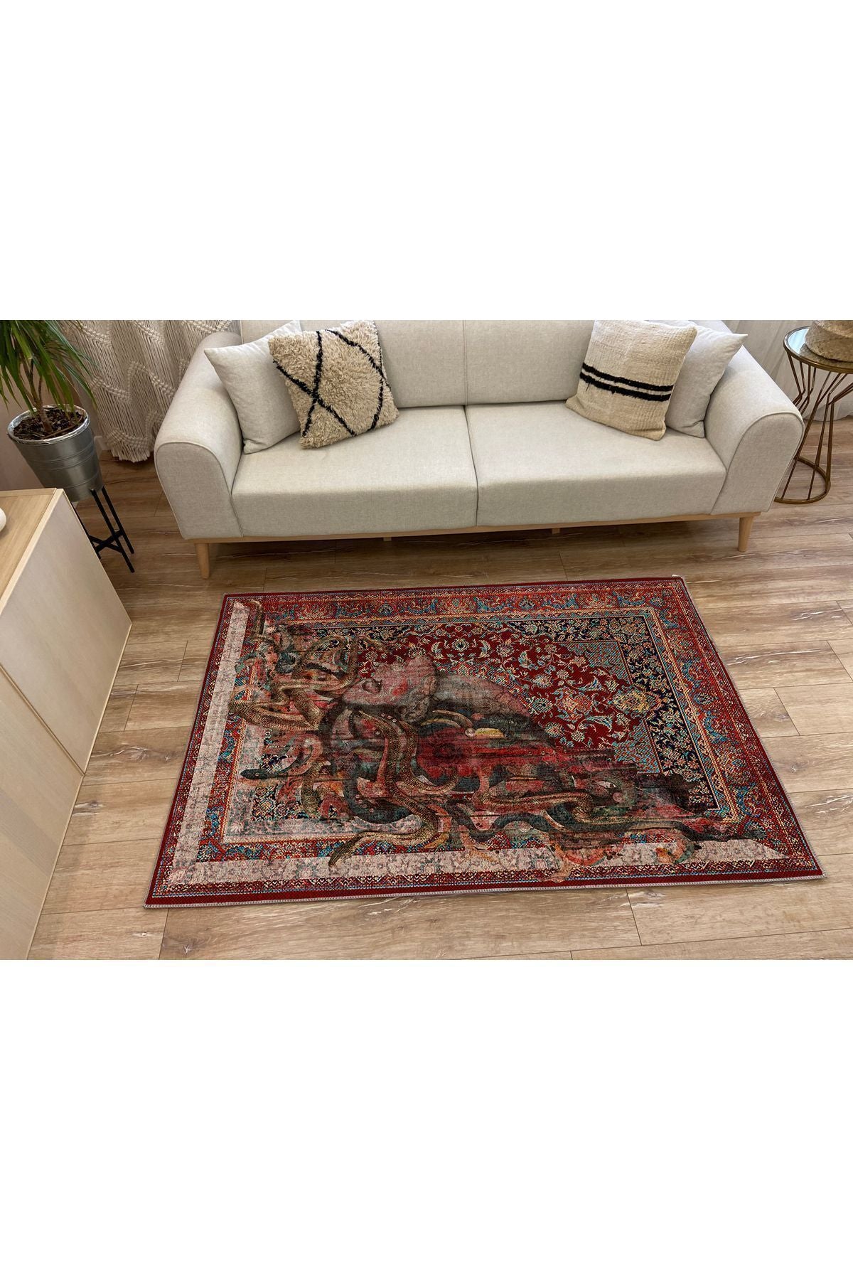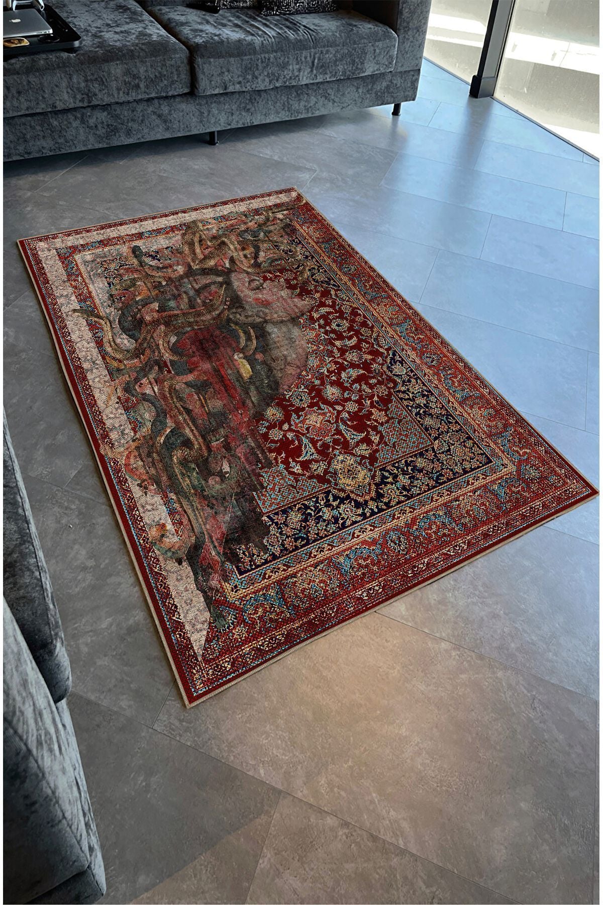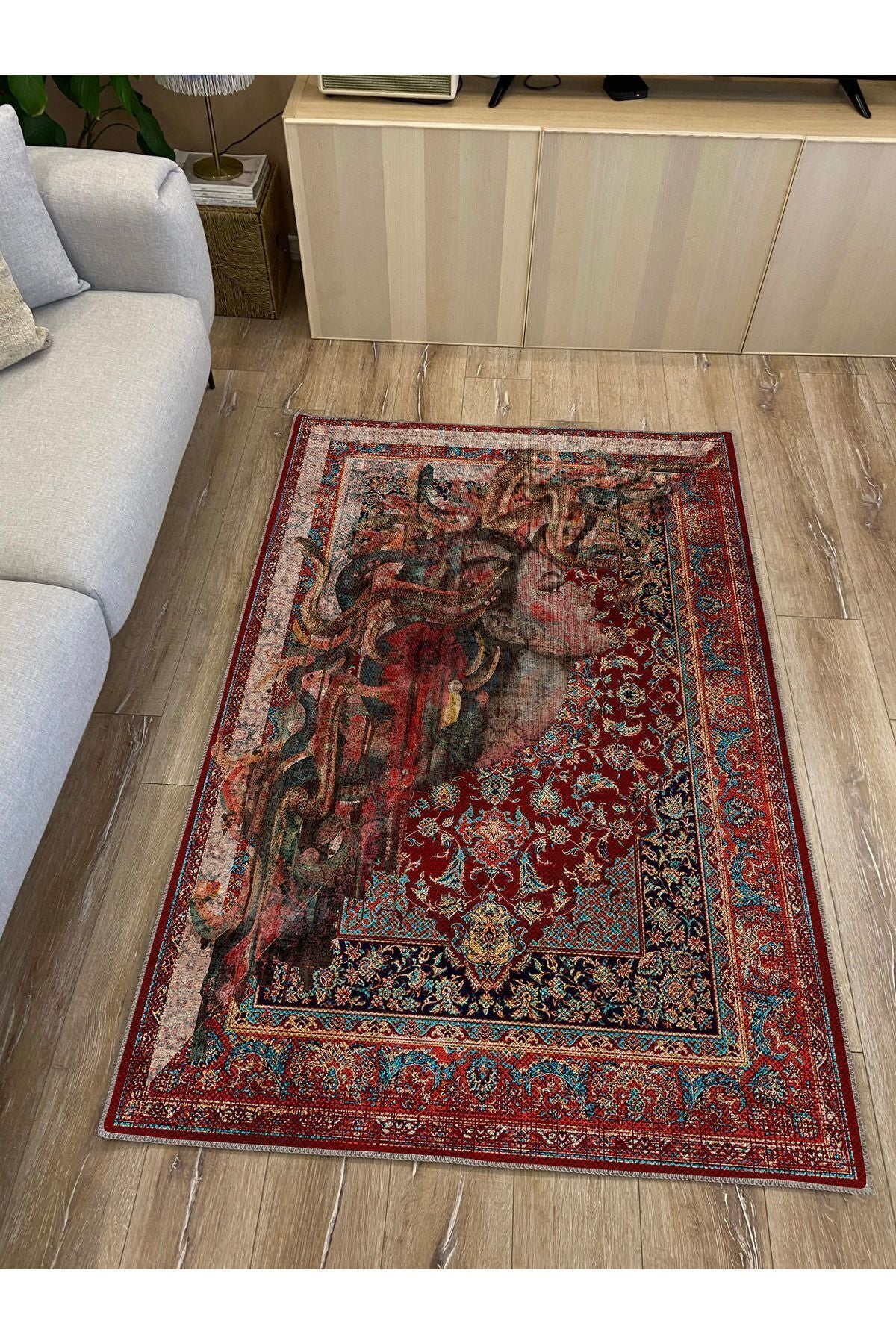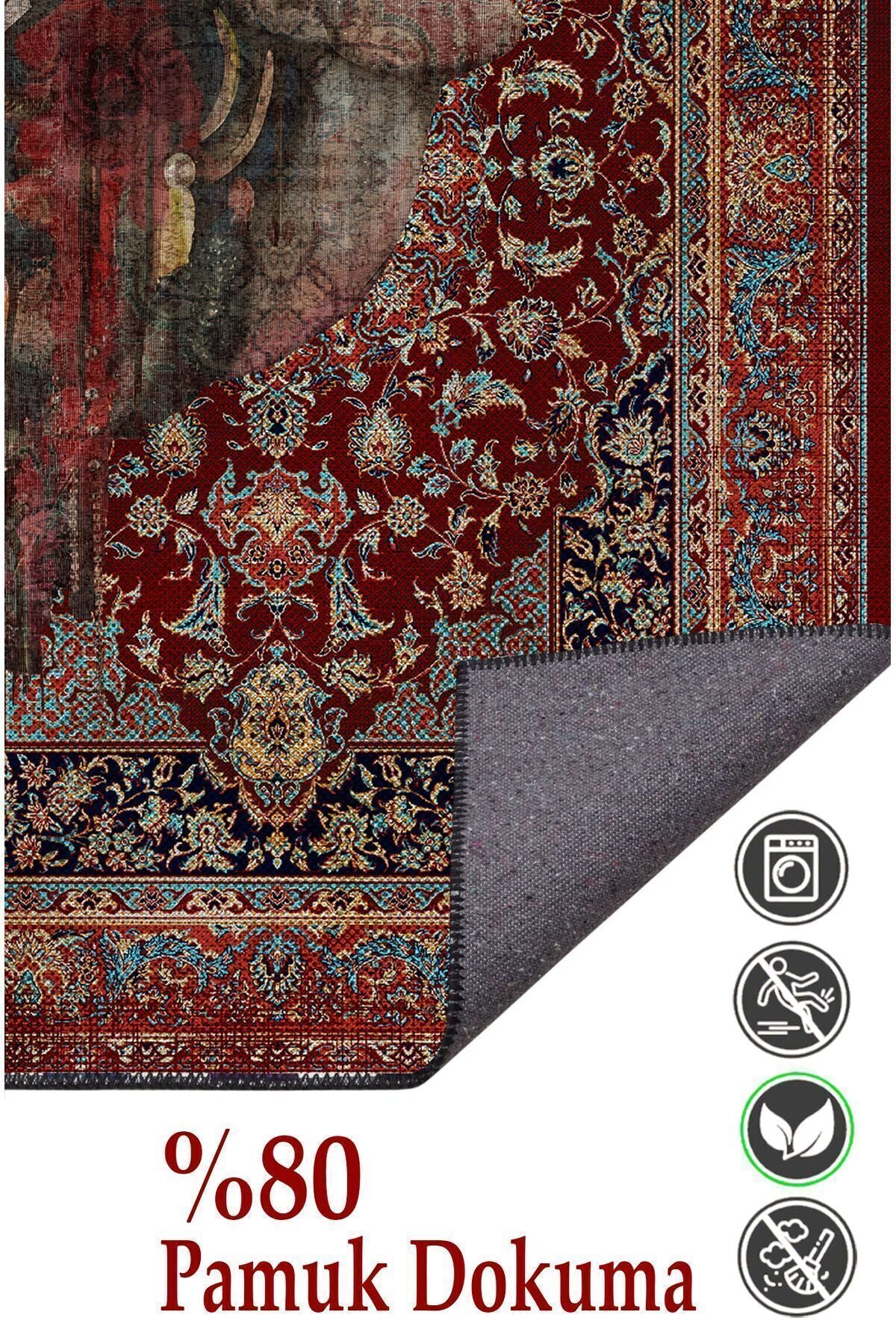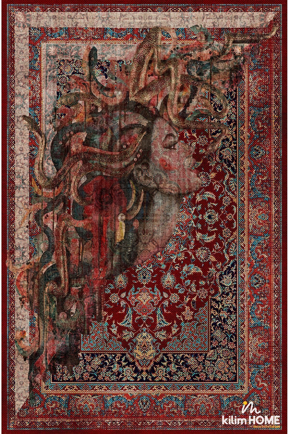 HV 123 Etnik Anadolu Halı Üzerine Kadın Suratı Dekoratif Salon Halısı Saçaklı Yıkanabilen Halı