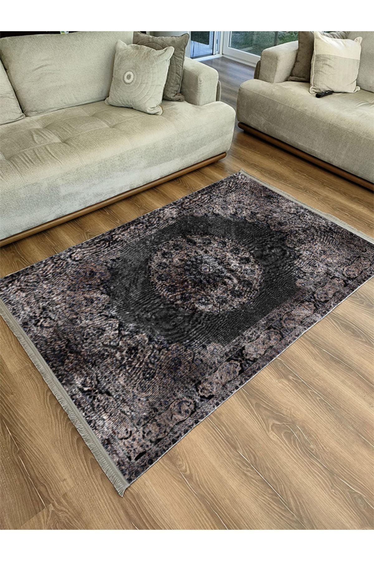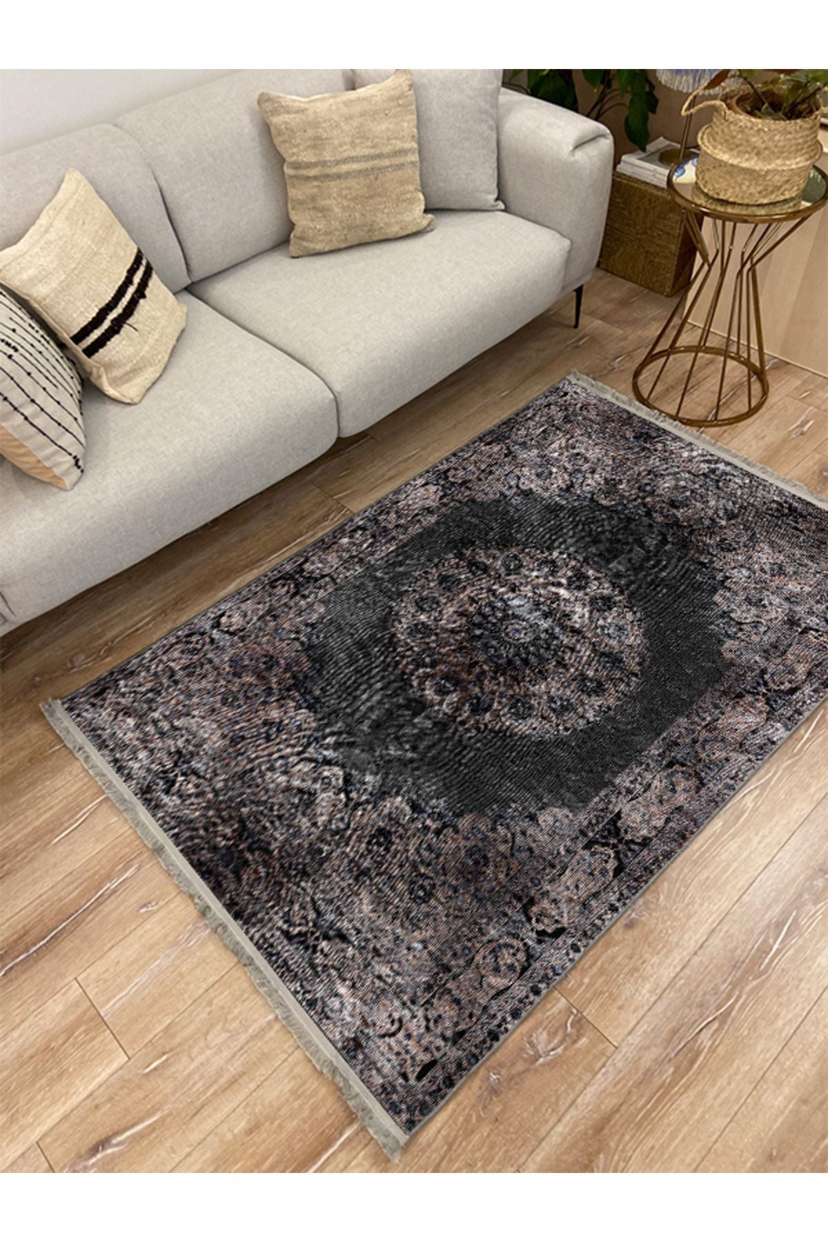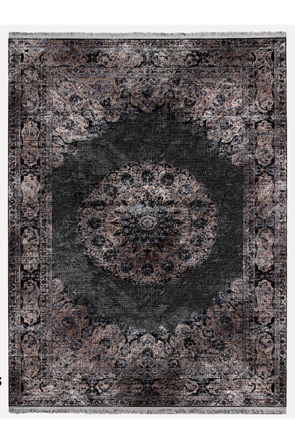 HV 2187 Siyah Ve Kahve Temalı Geleneksel Motifli Etnik Desenli Vintage Yıkanabilen Dekoratif Halı