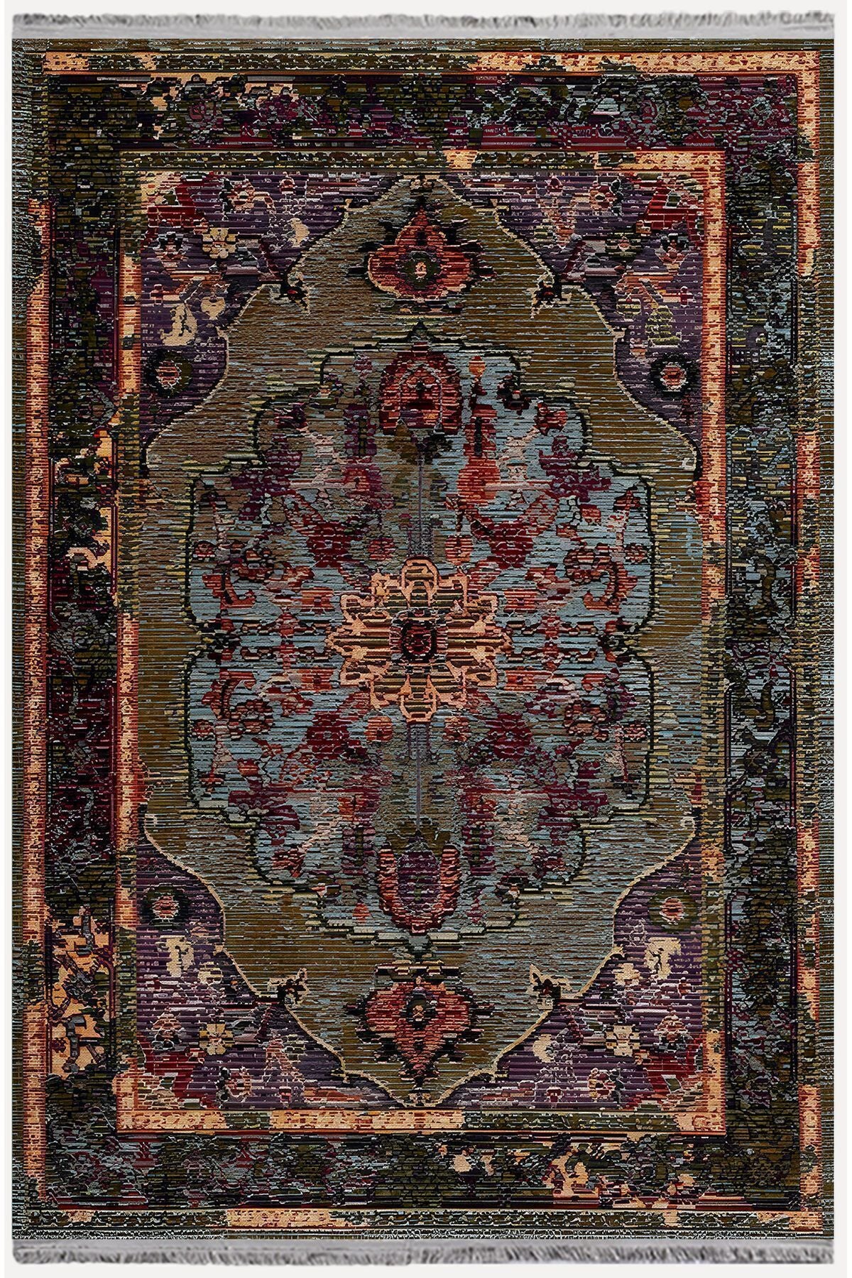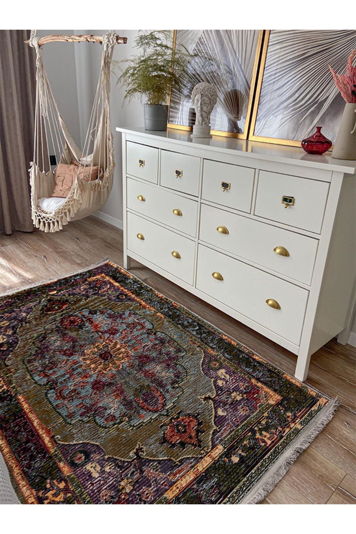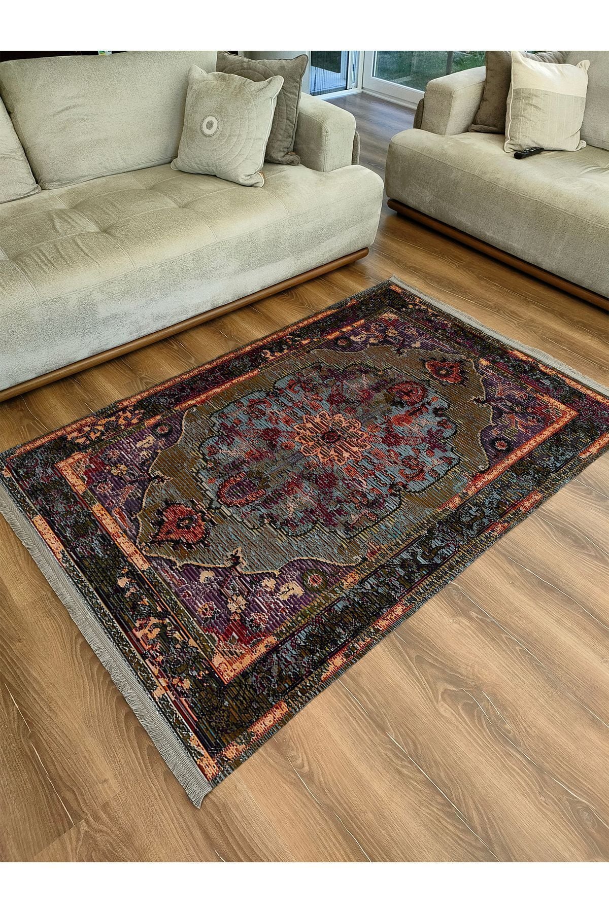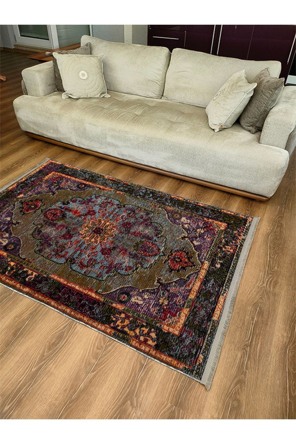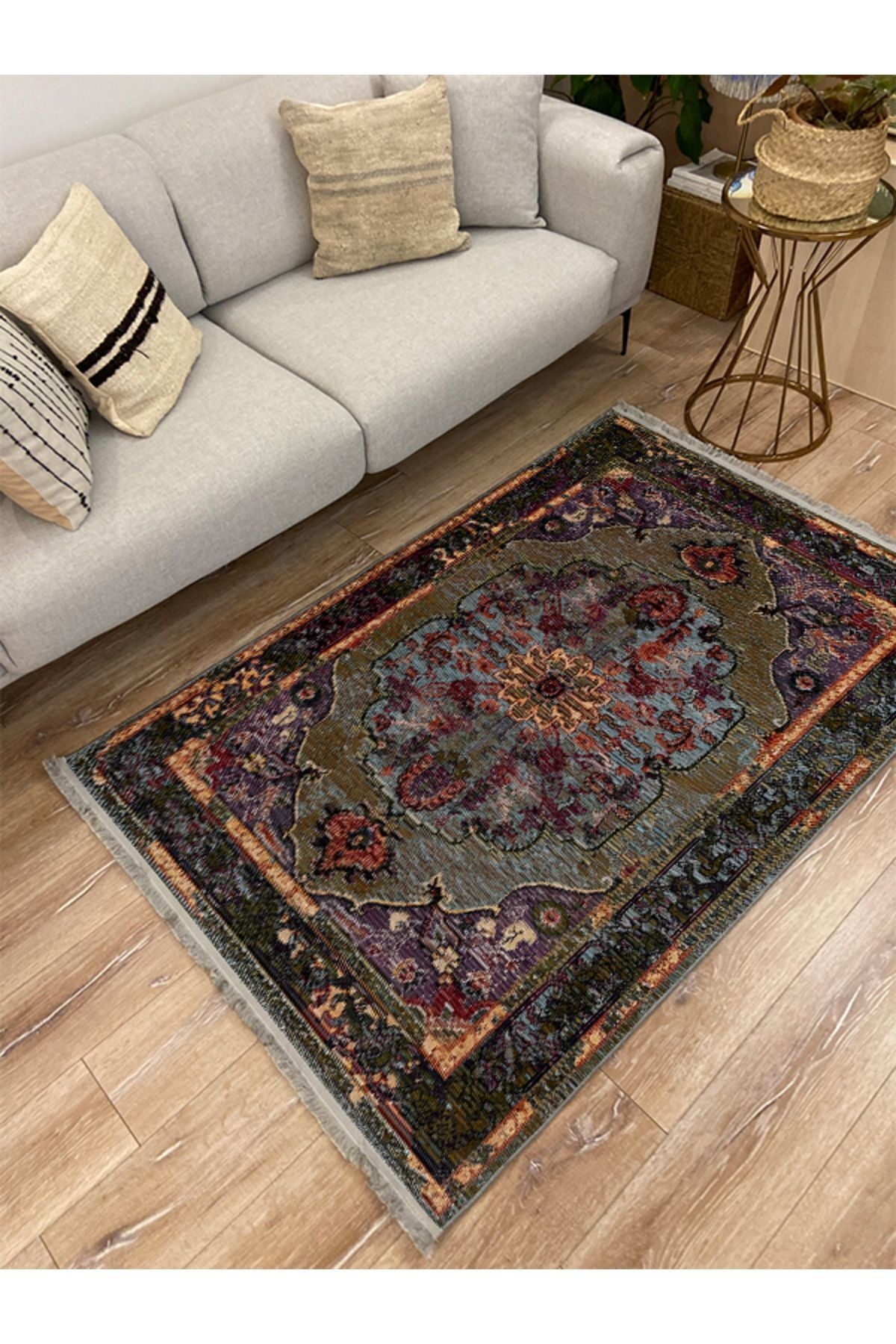HV 69 Siyah Ve Koyu Yeşil Tonlarında Dekoratif Salon Halısı Klasik Halı Saçaklı Yıkanabilen Halı