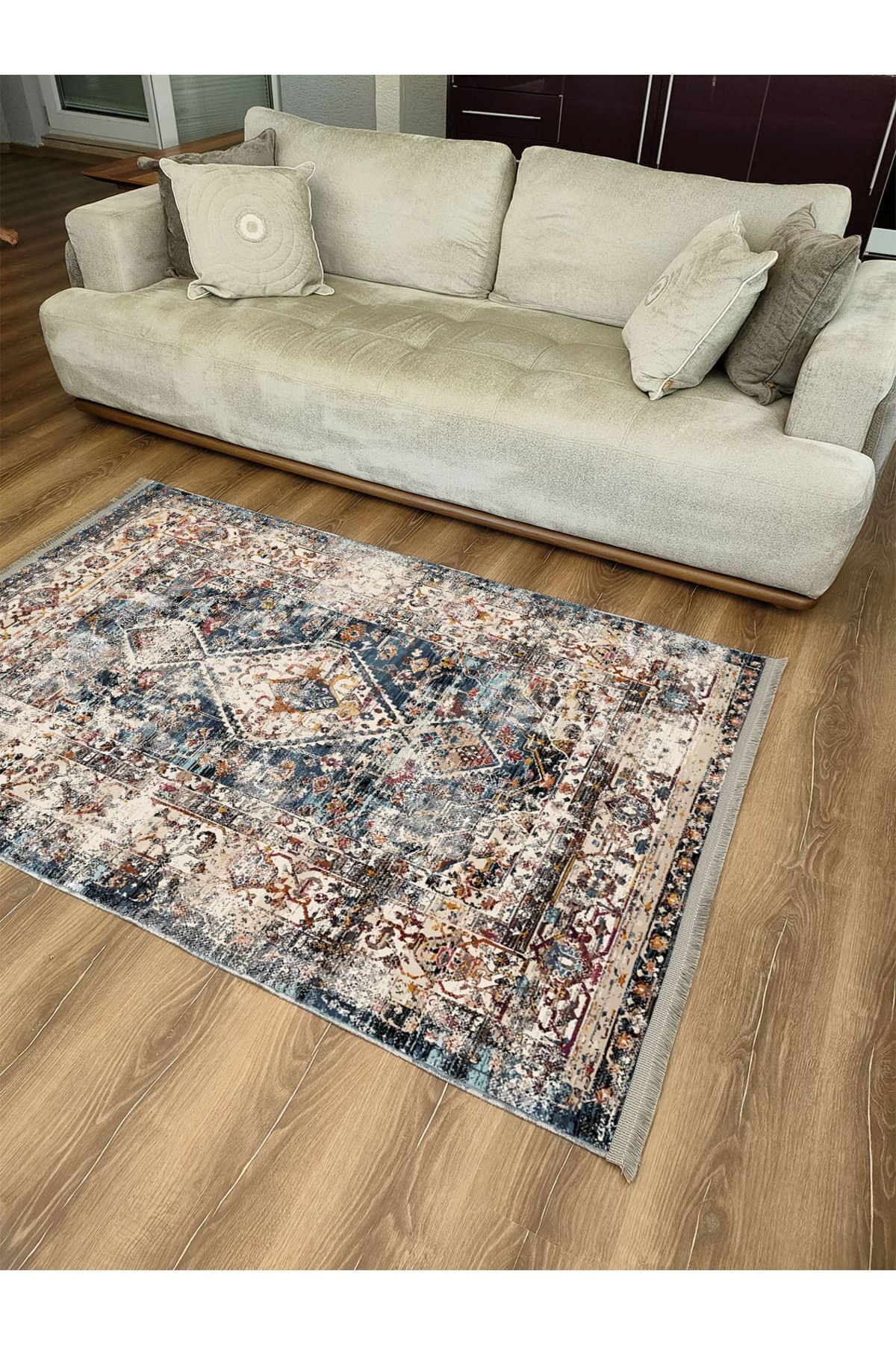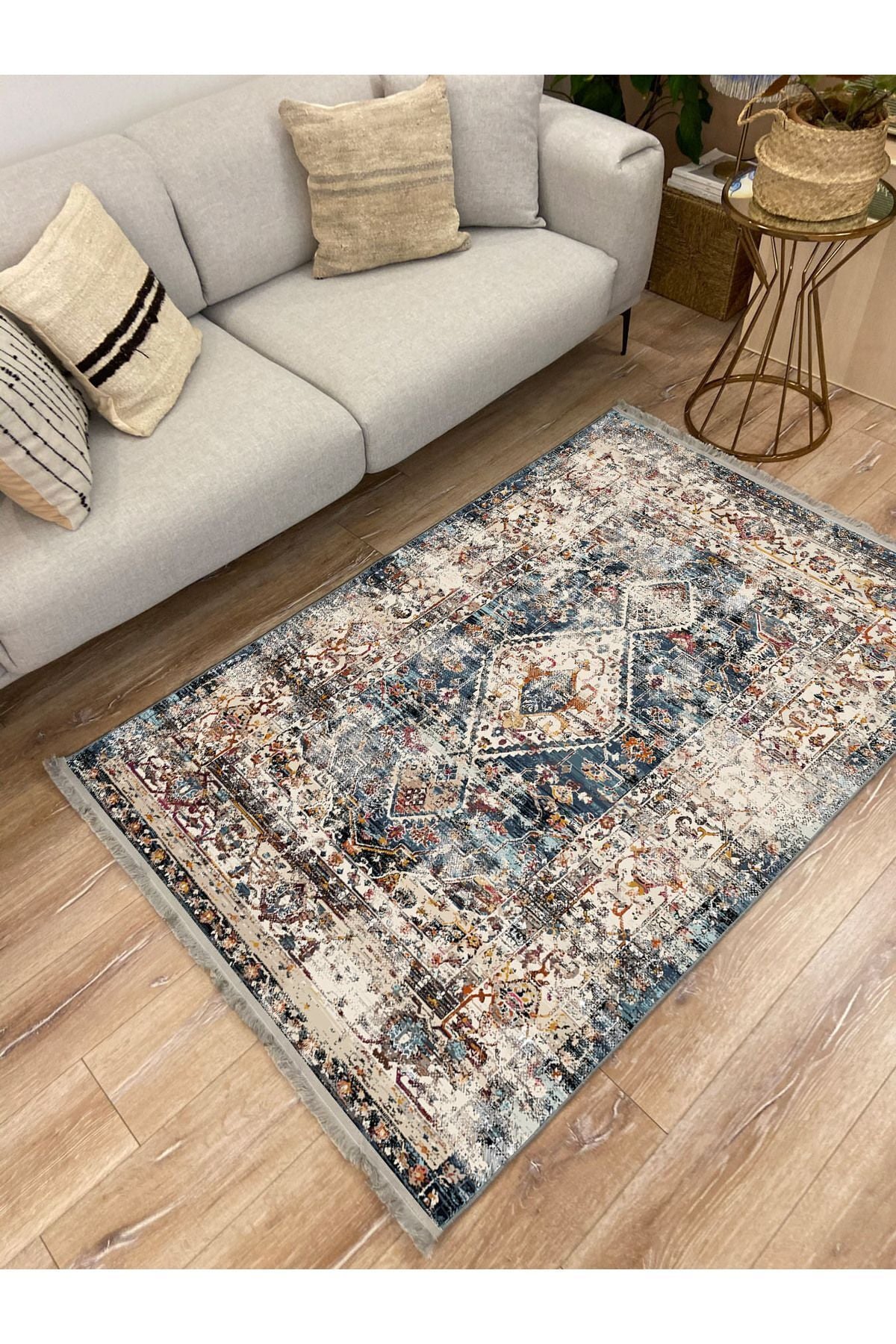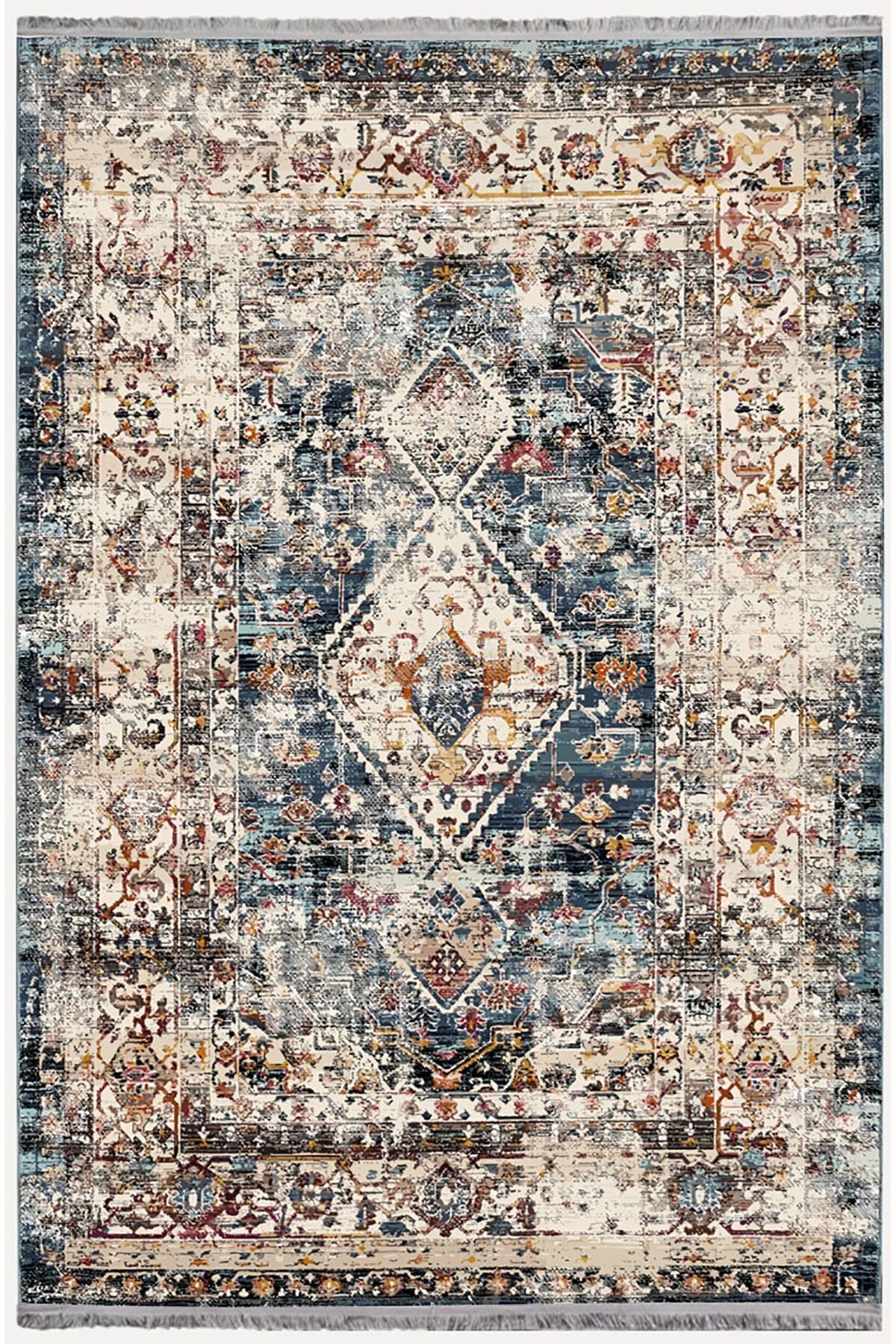 Mars 2162 Krem Ve Mavi Tonlarında Klasik Eskitme Desen Saçakli Dekoratif Halı