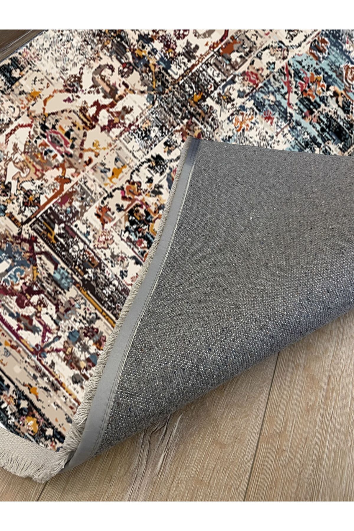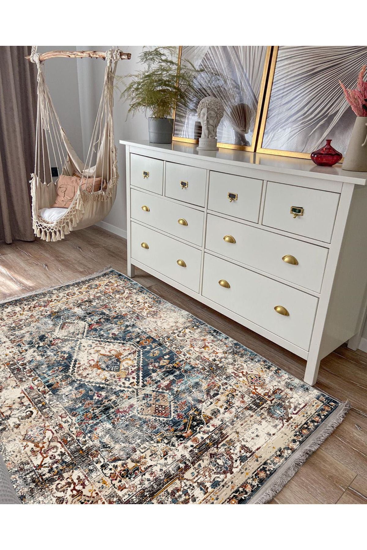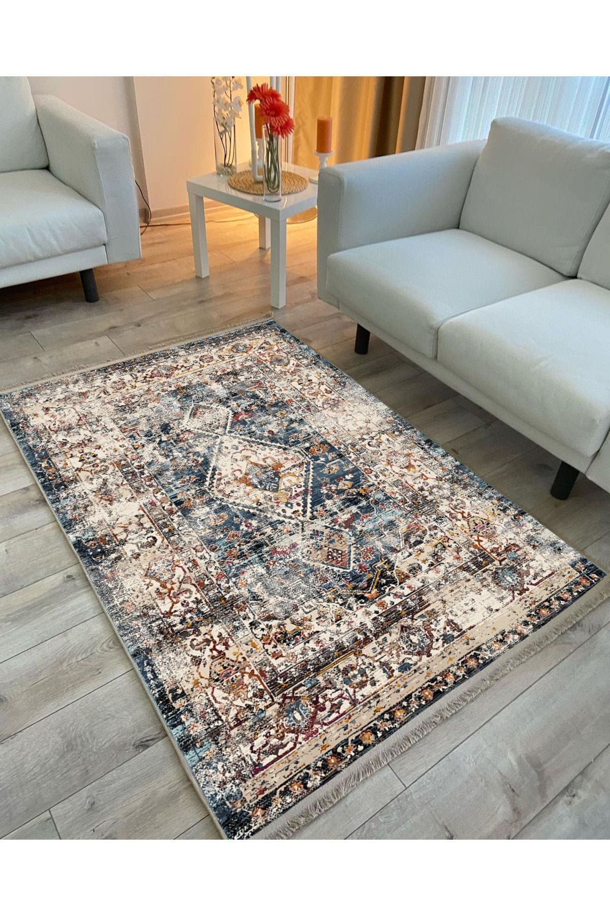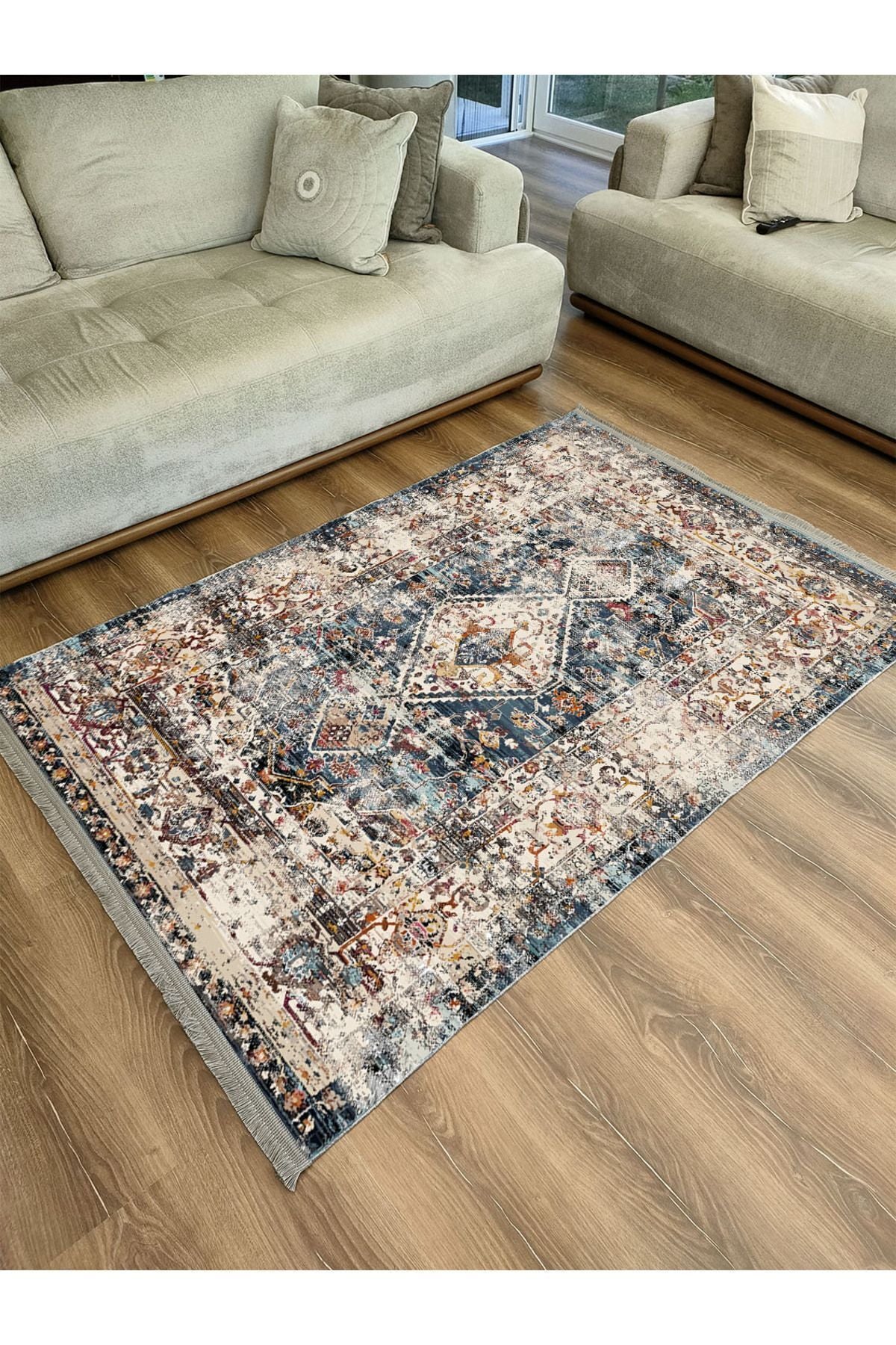 Mars 2162 Krem Ve Mavi Tonlarında Klasik Eskitme Desen Saçakli Dekoratif Halı