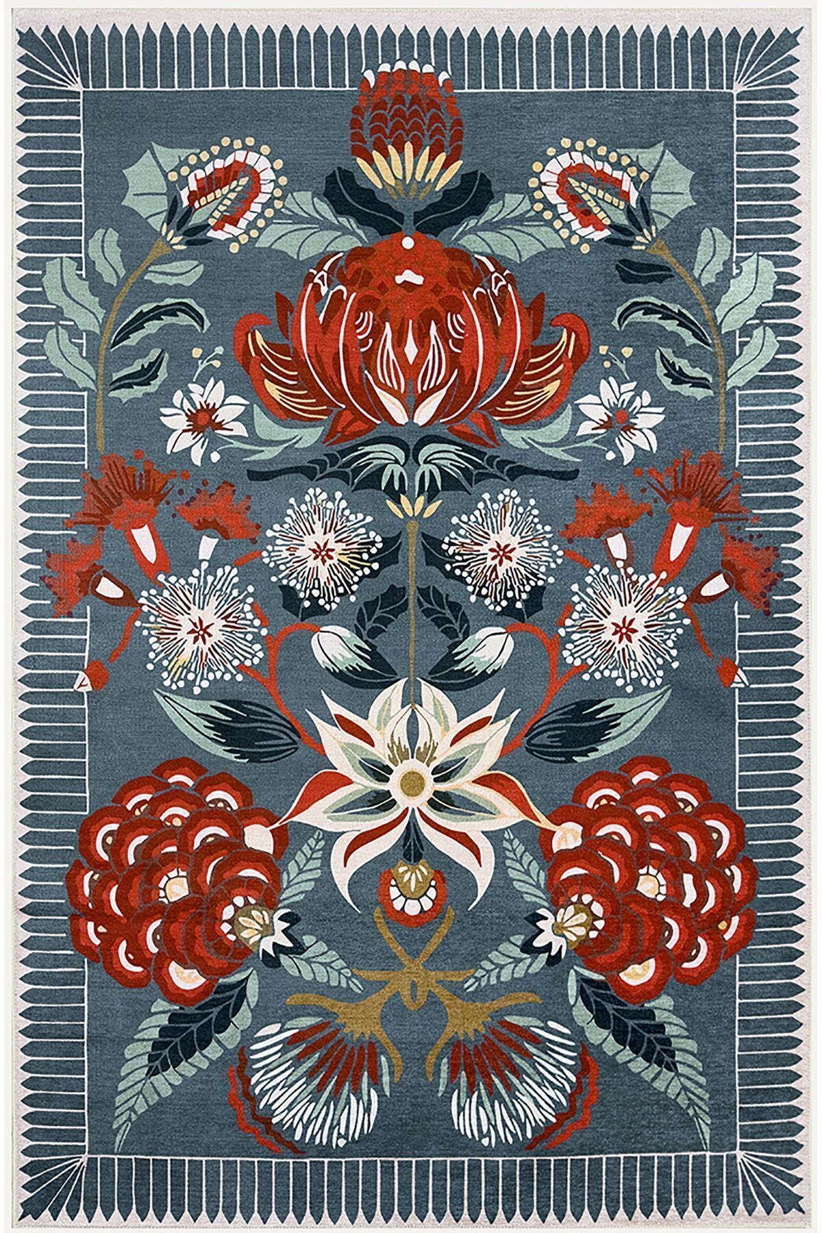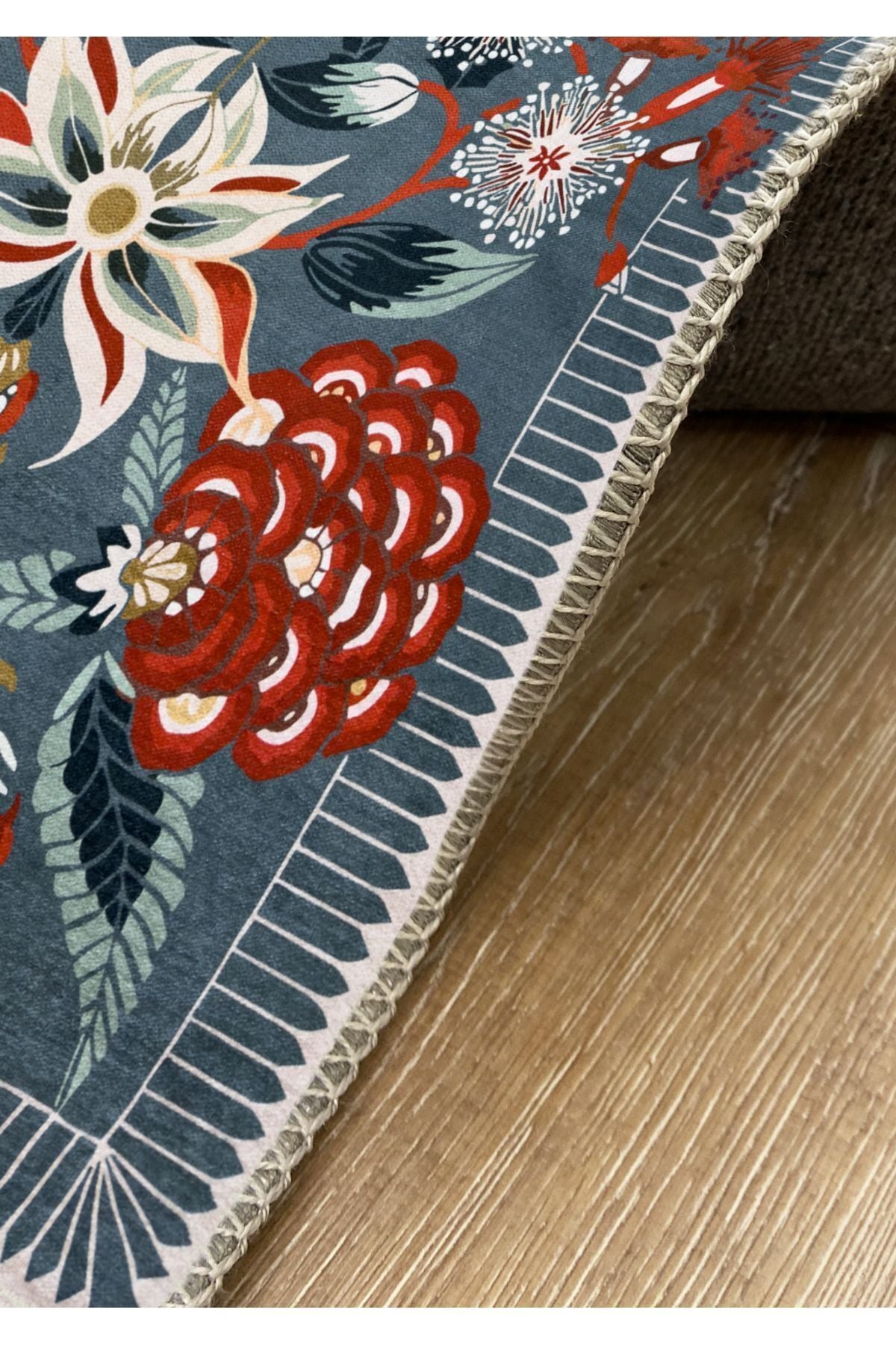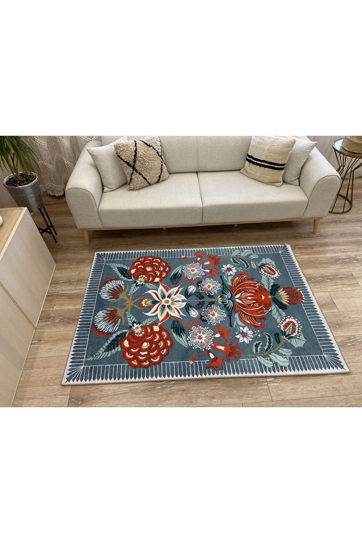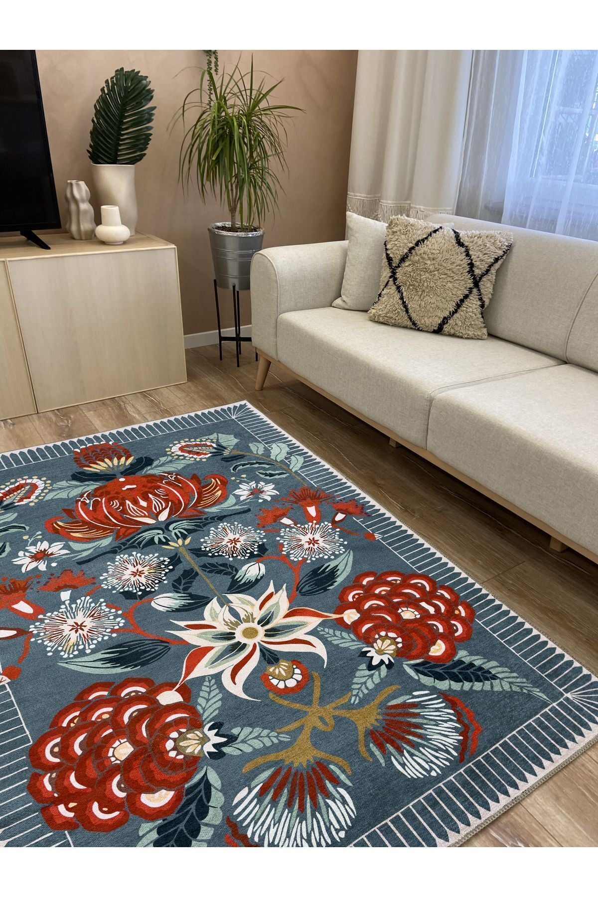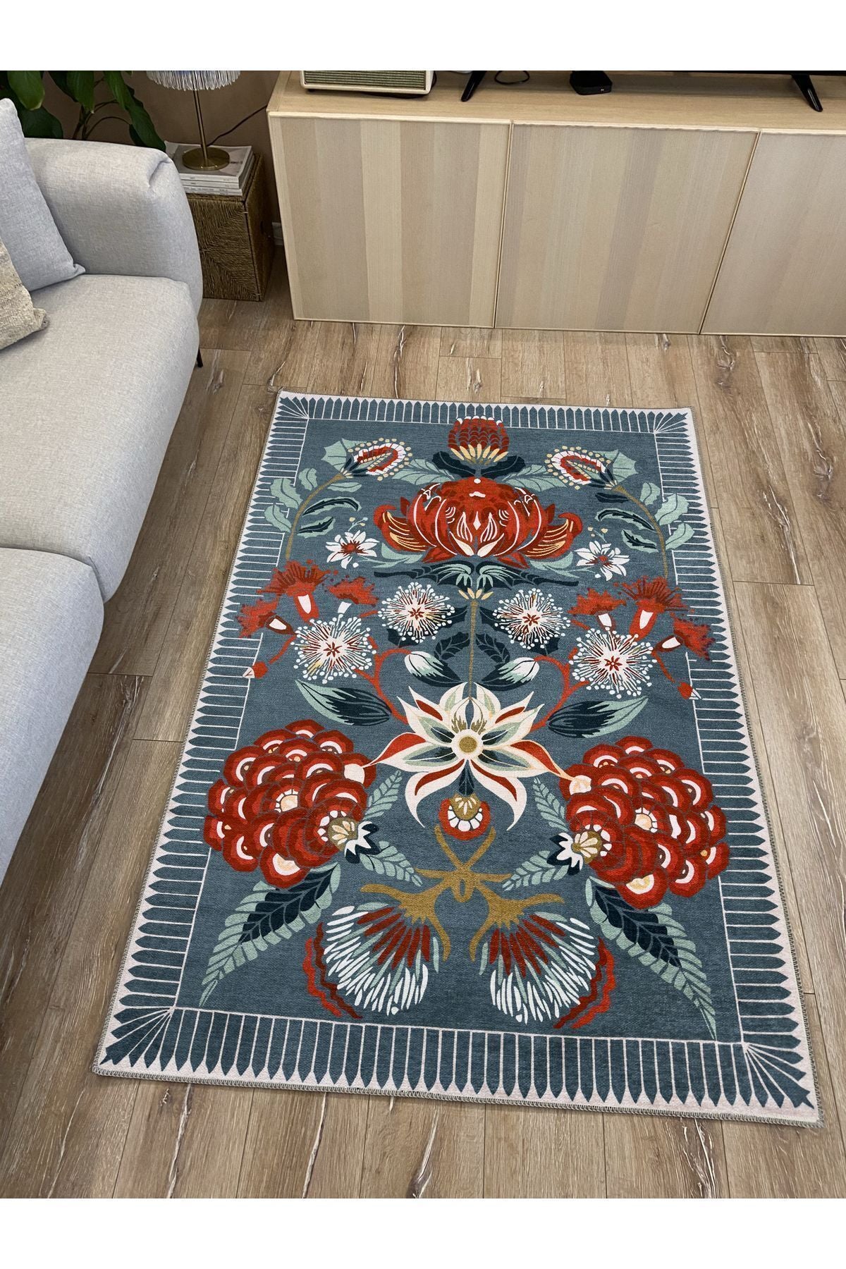 Yeşil Temalı Kırmızı Gül Tonlarında Klasik Modeli Pamuk Dokuma Saçaklı Yakanabilir Halı Vagonu2179
