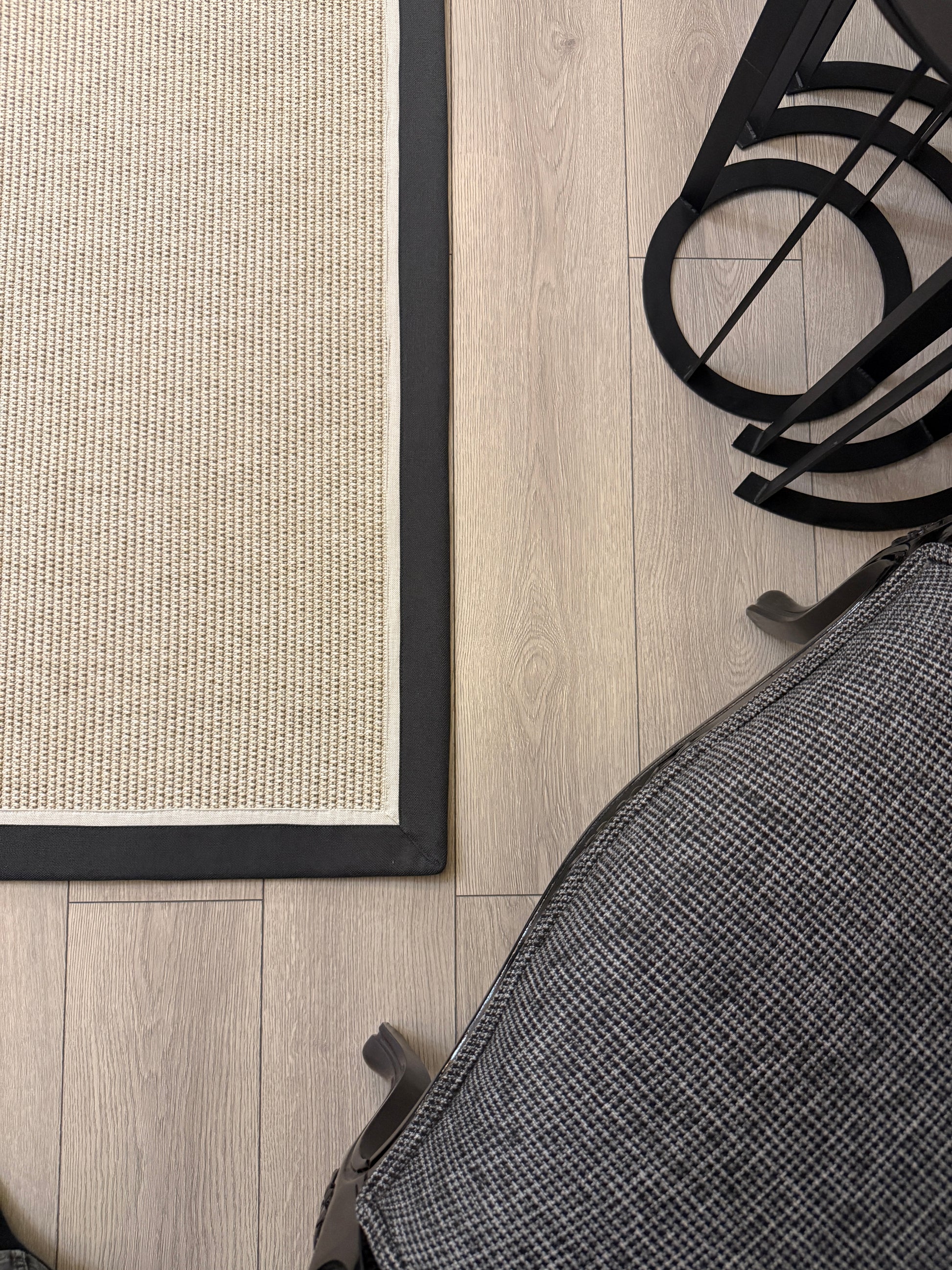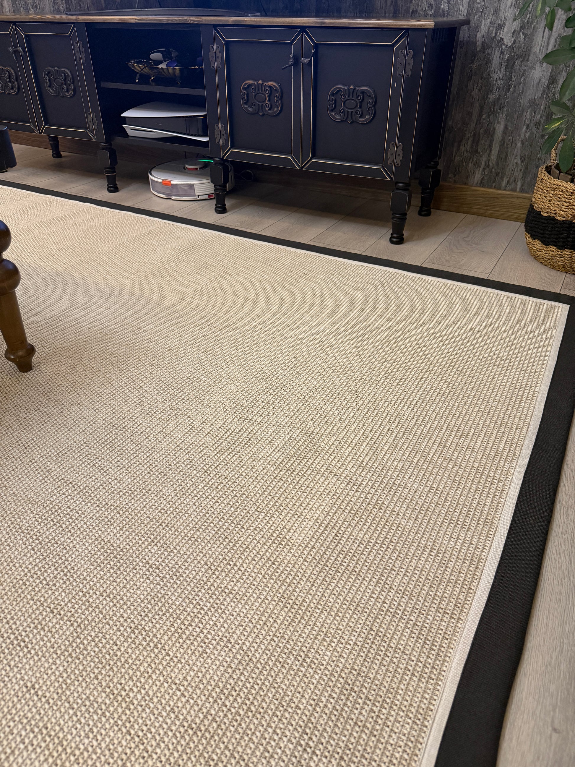 Evinize modern ve dayanıklı bir halı arıyorsanız, bu el yapımı kumaş bordürlü sisal halı tam size göre!