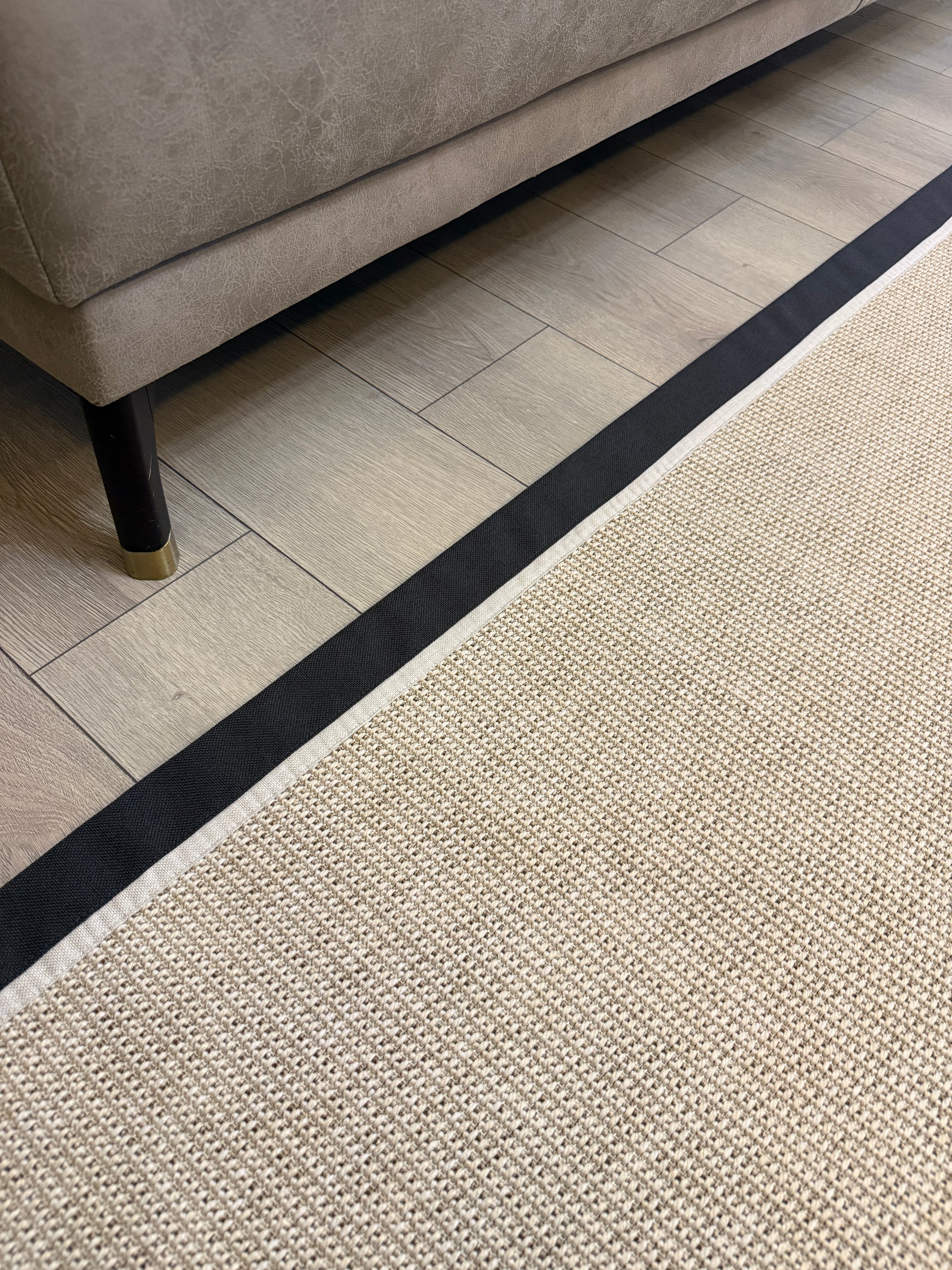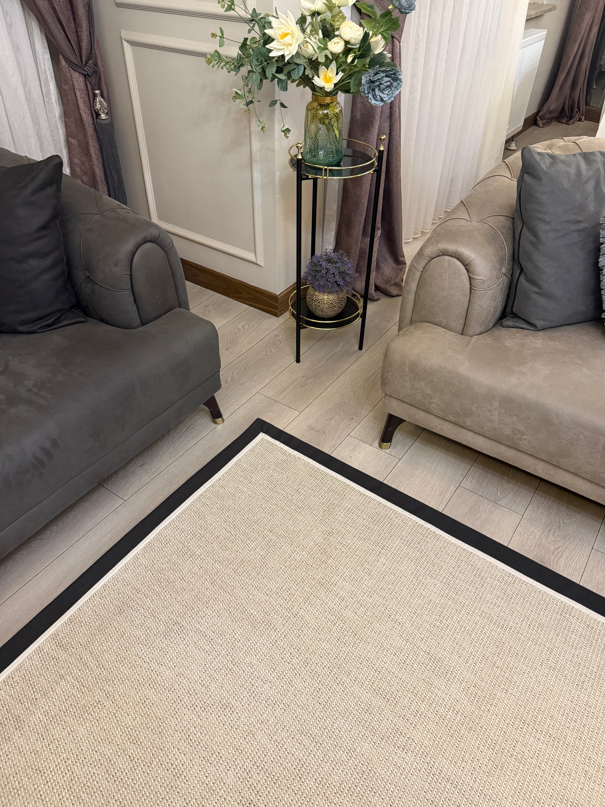 Evinize şık ve modern bir hava katacak sisal halımız, el yapımı kumaş bordürü ile estetik ve dayanıklı bir tasarım sunar. Özel ölçü ve renk seçenekleriyle tamamen kişiselleştirilebilir. Uzun ömürlü ve temizliği kolaydır.