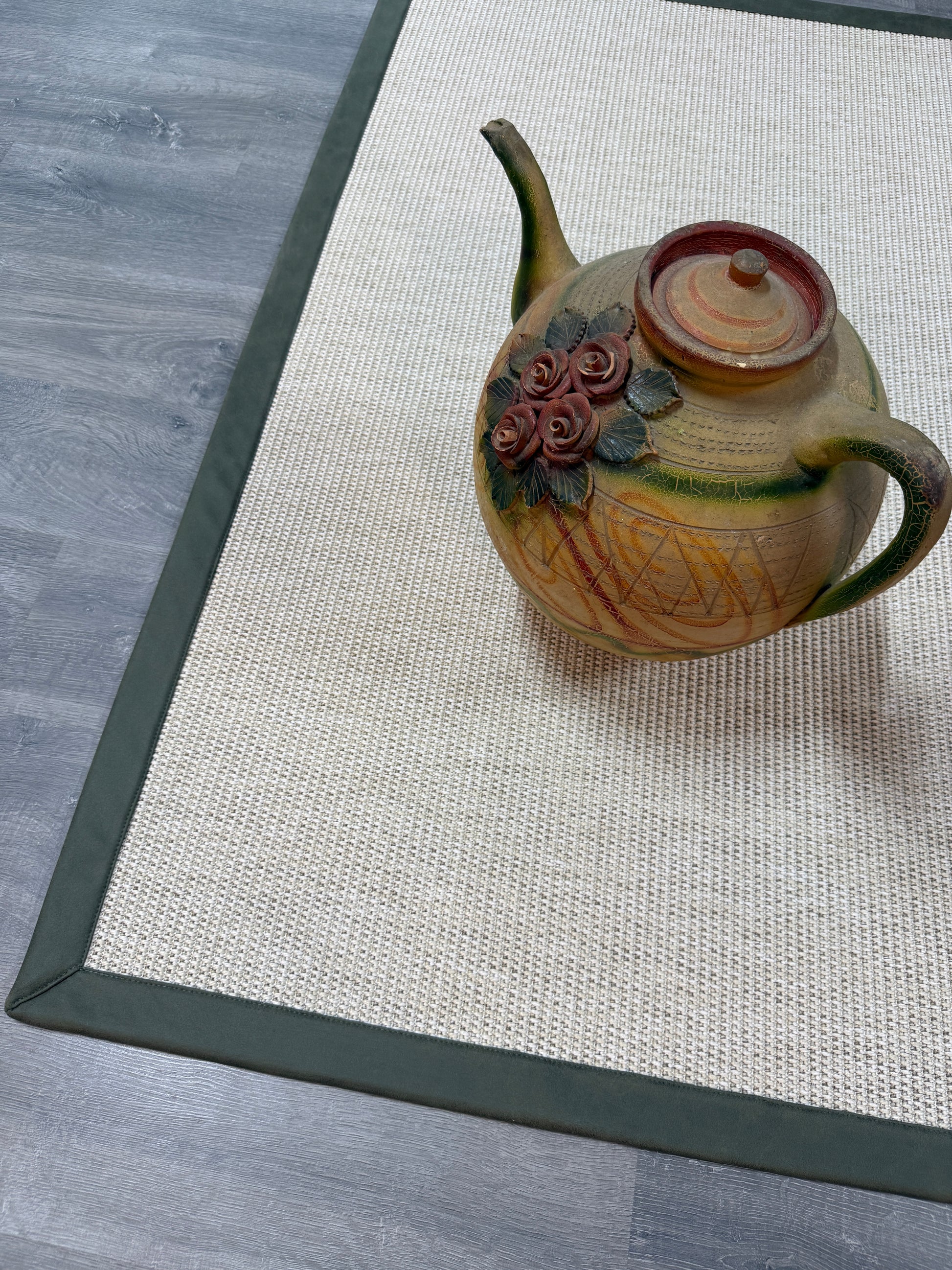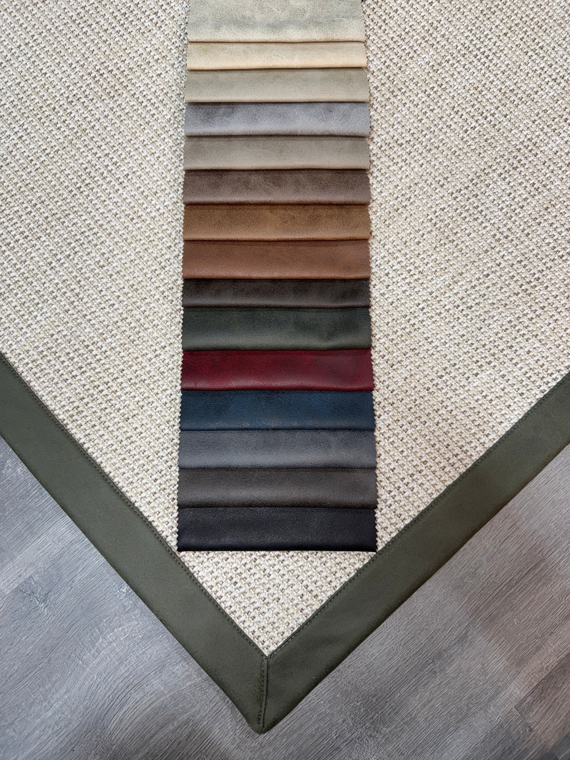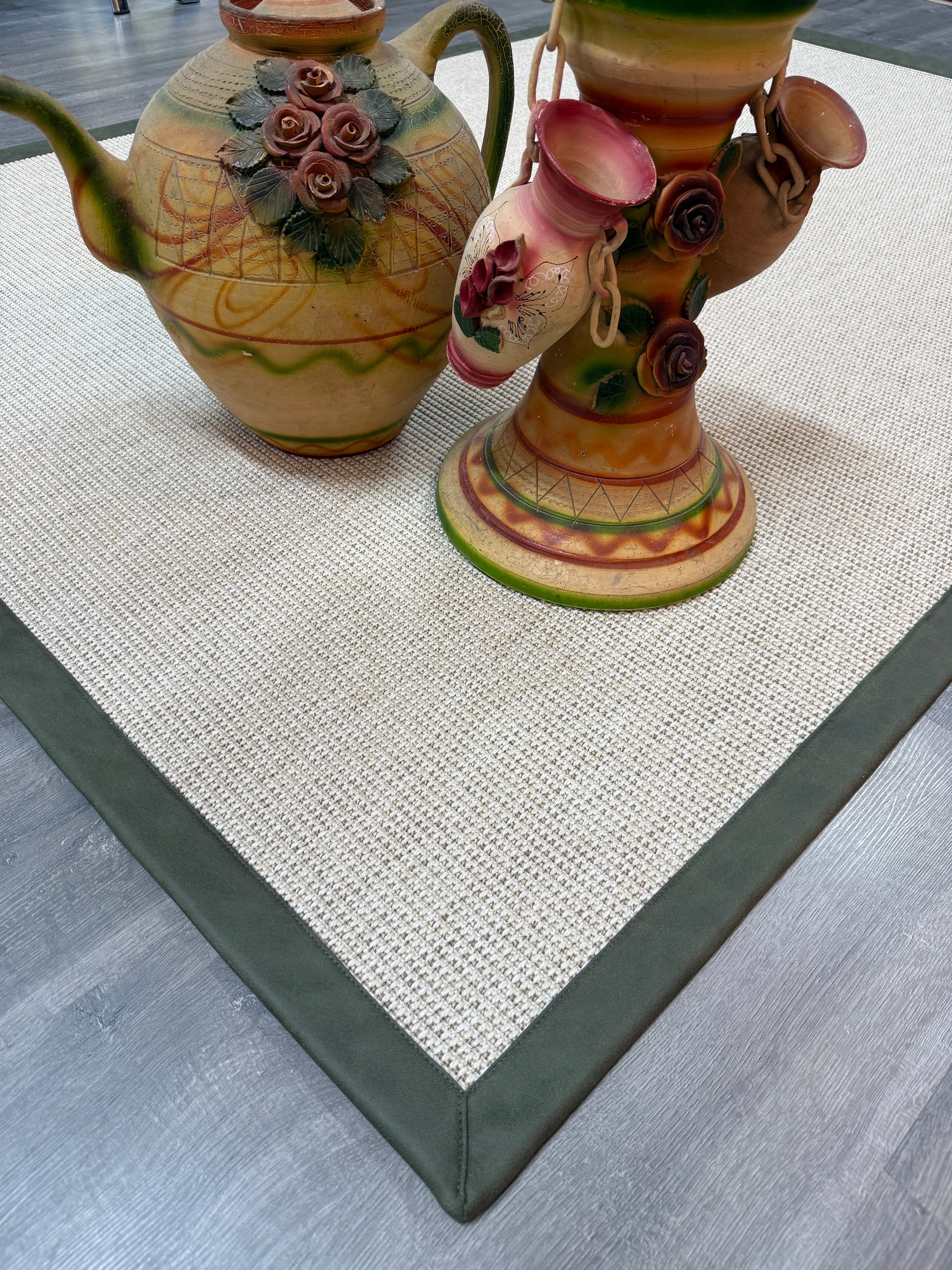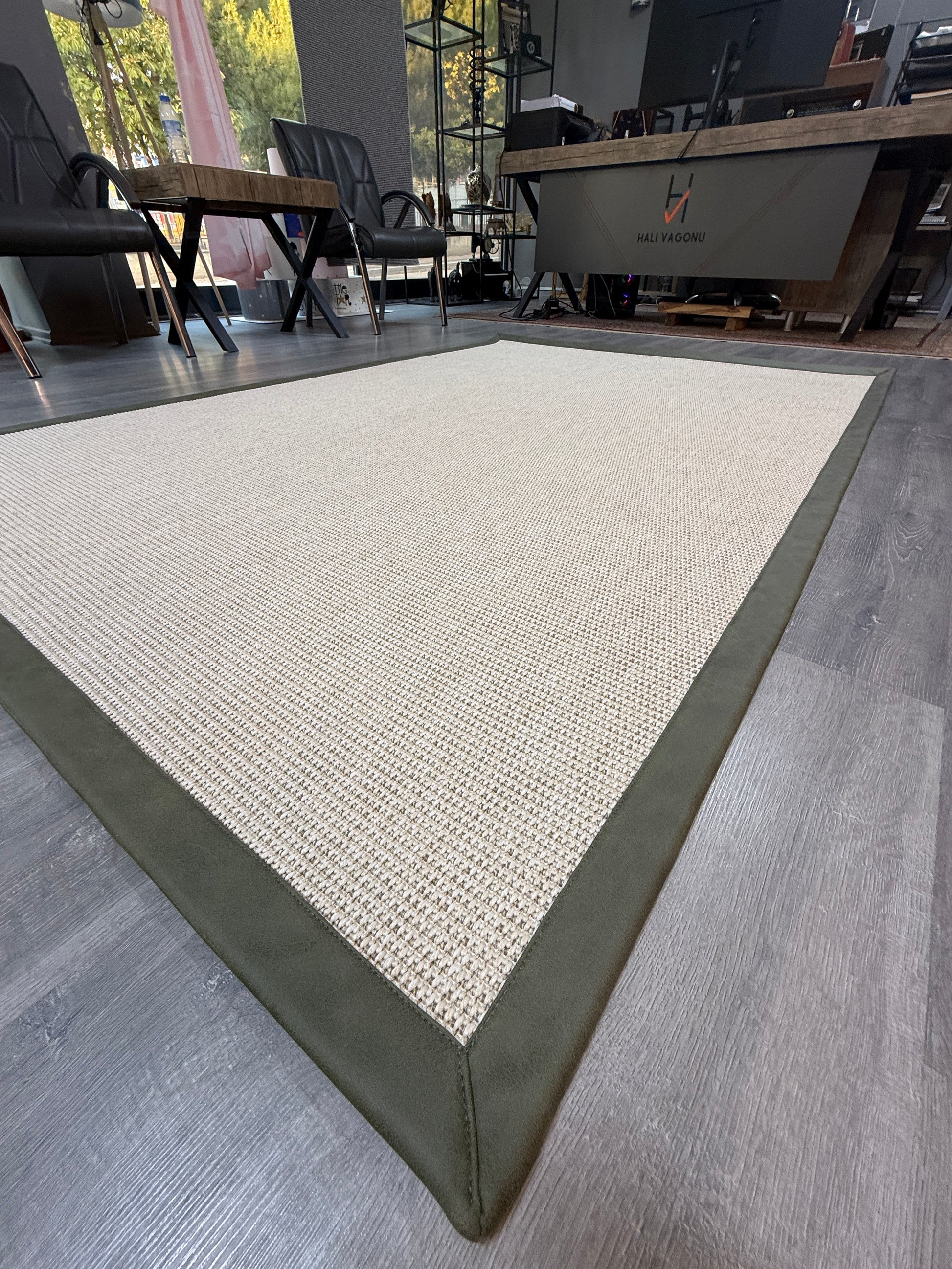 Evinize şık ve modern bir hava katacak sisal halımız, el yapımı suni deri bordürü ile estetik ve dayanıklı bir tasarım sunar. Özel ölçü ve renk seçenekleriyle tamamen kişiselleştirilebilir. Uzun ömürlü ve temizliği kolaydır.