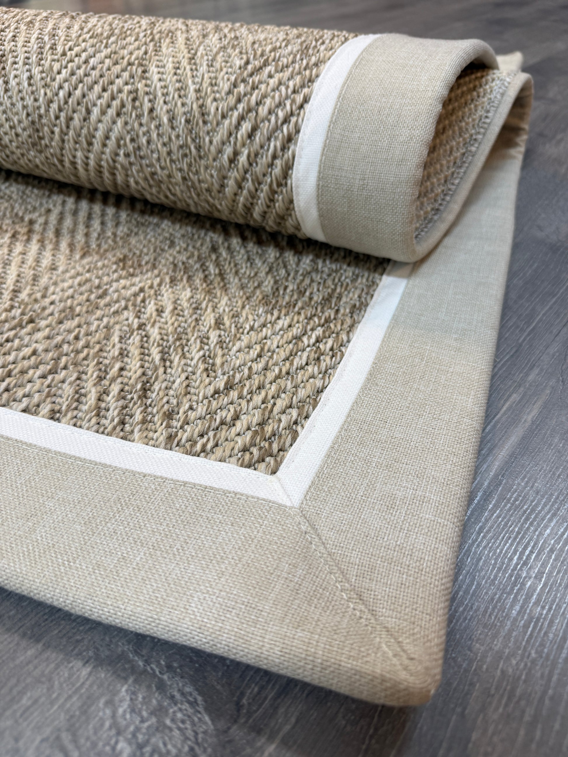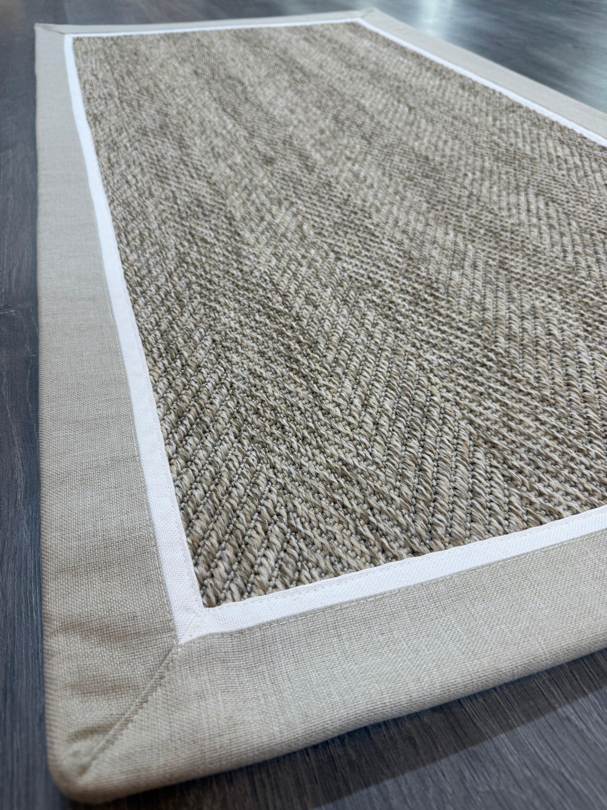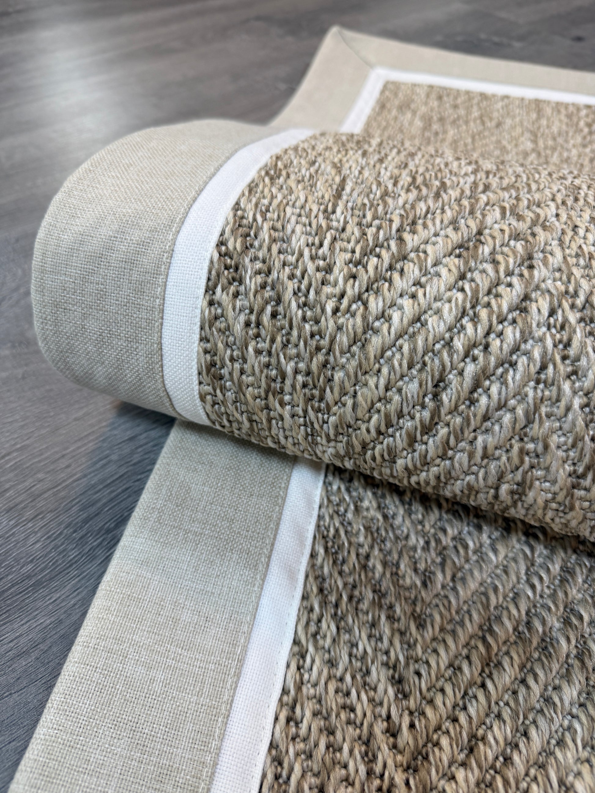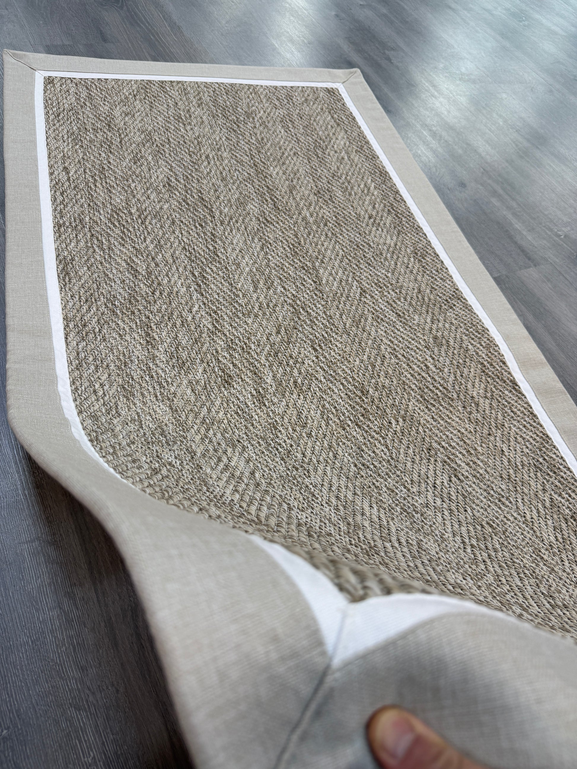 Evinize modern ve dayanıklı bir halı arıyorsanız, bu el yapımı kumaş bordürlü sisal halı tam size göre!