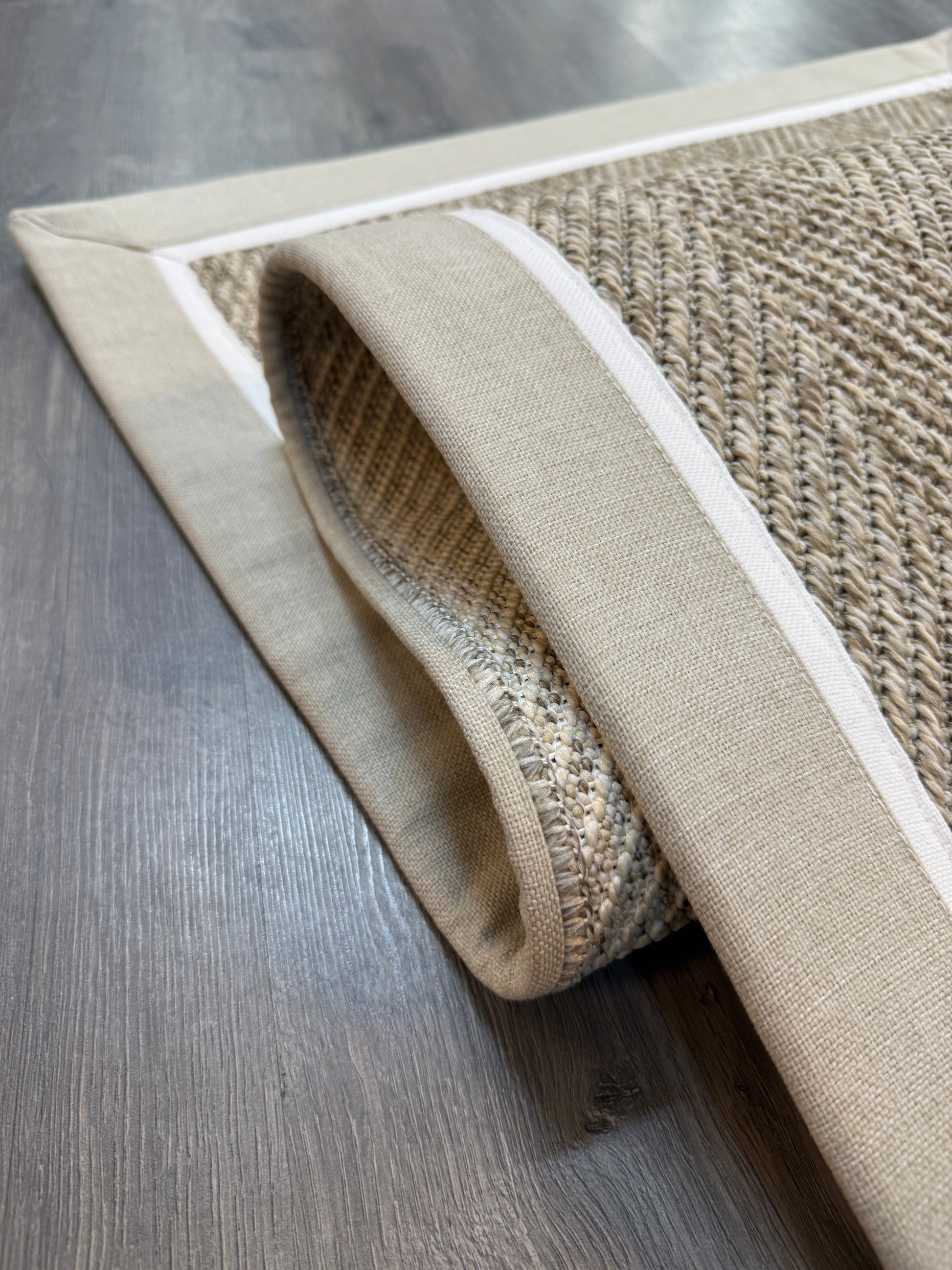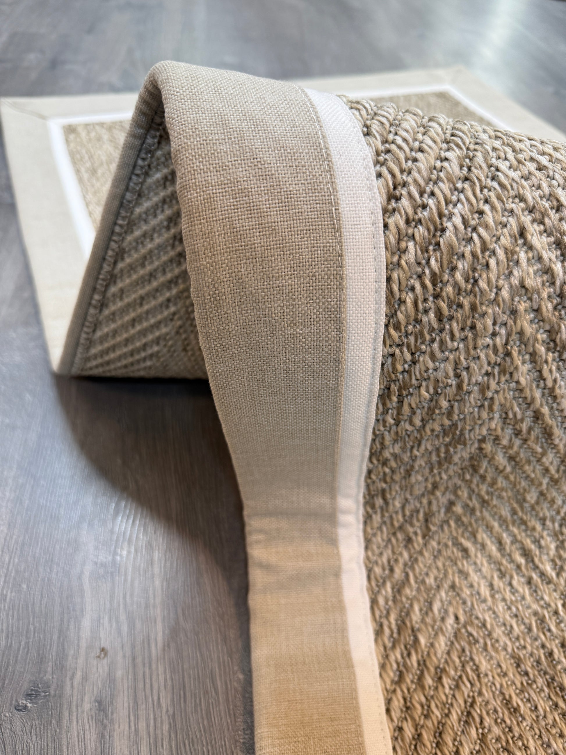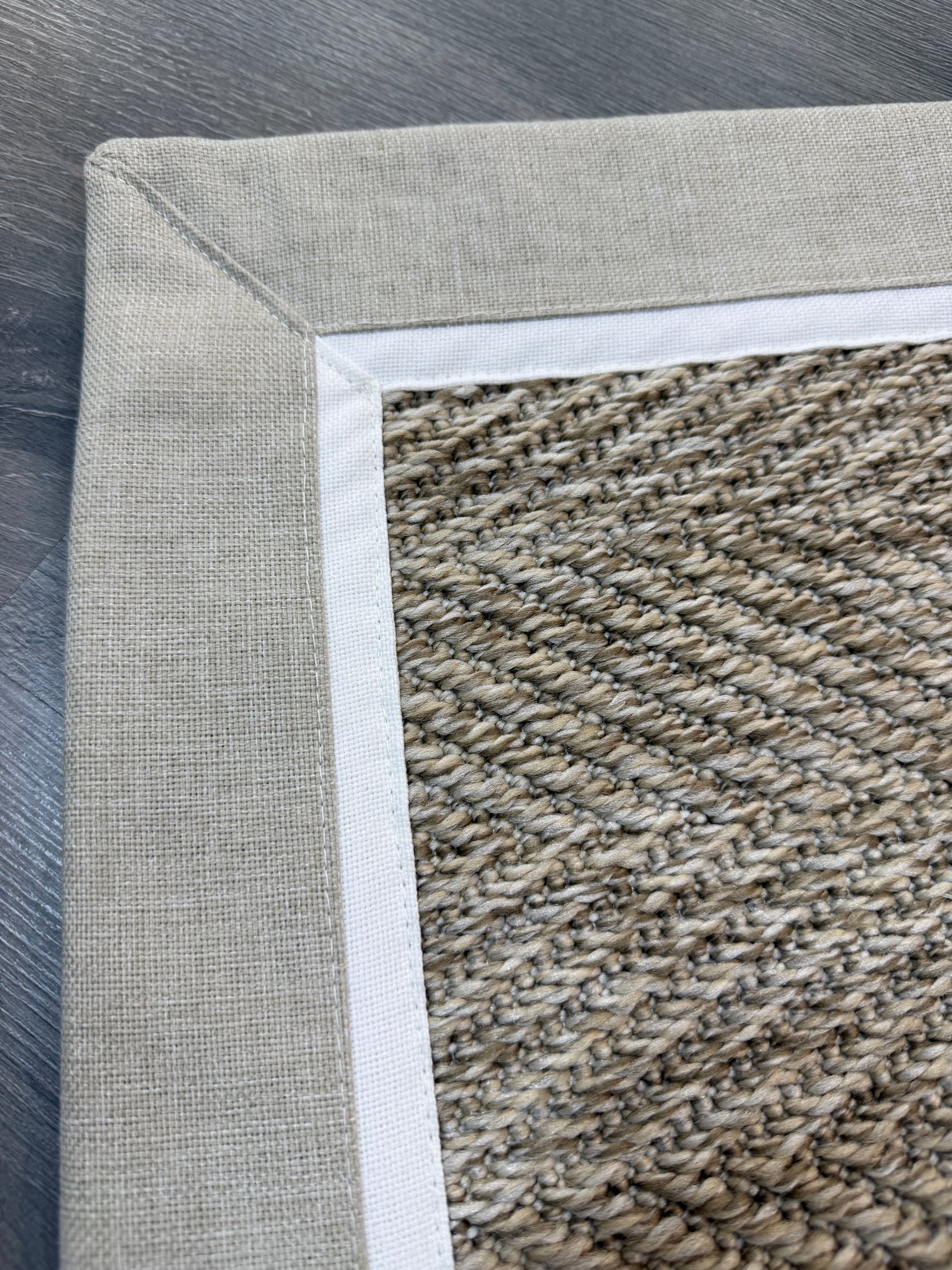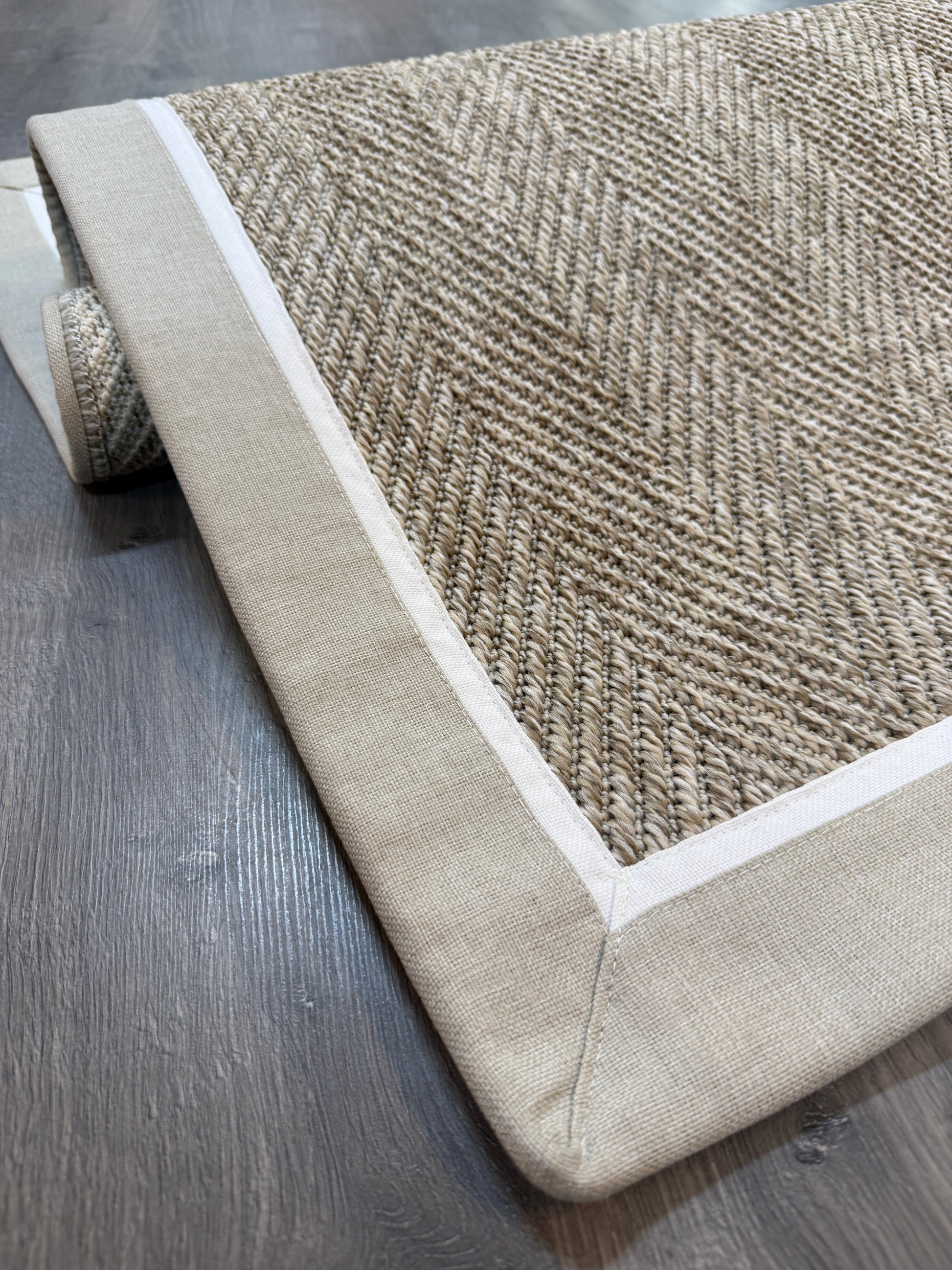 Evinize modern ve dayanıklı bir halı arıyorsanız, bu el yapımı kumaş bordürlü sisal halı tam size göre!